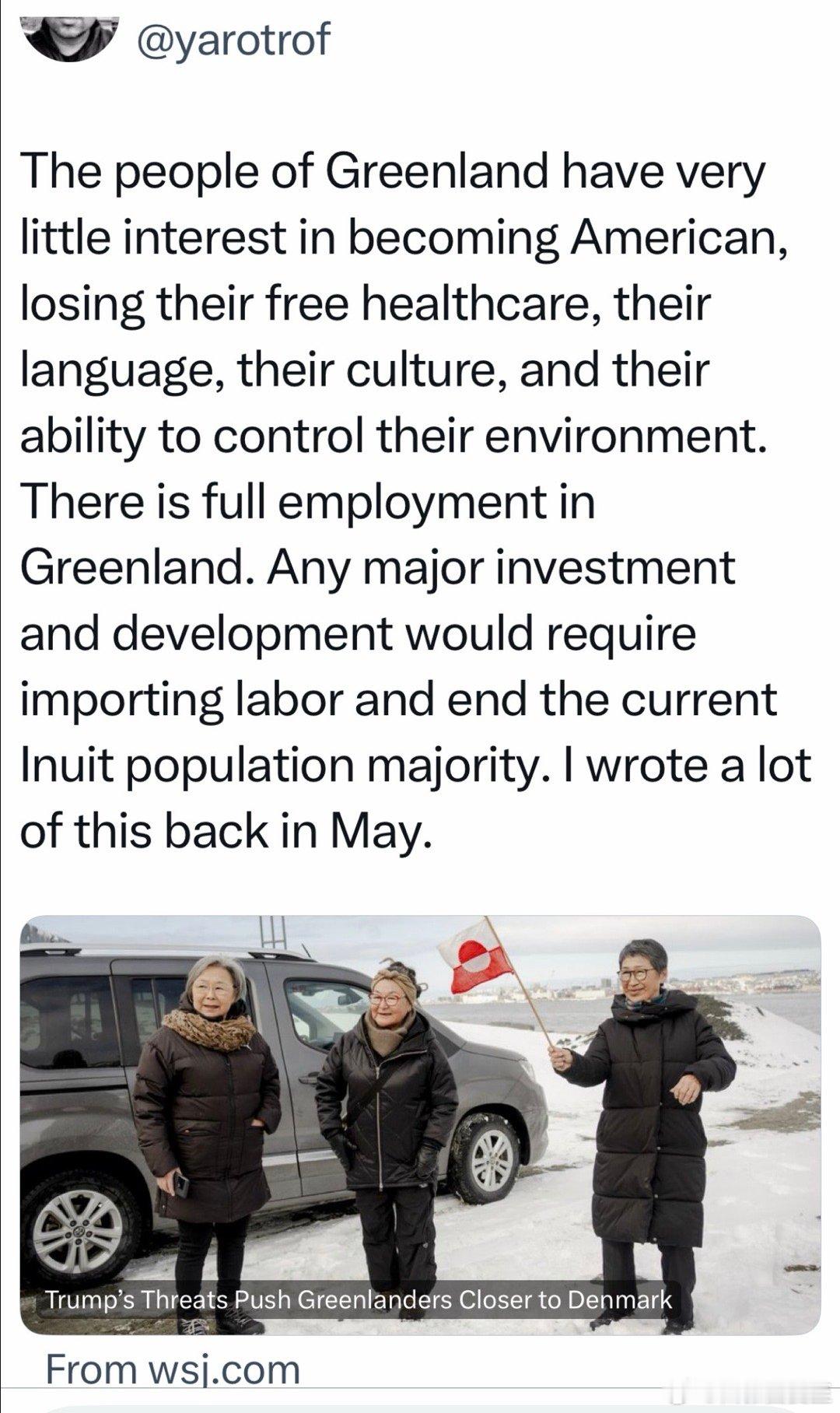 格陵兰居民享有免费的医疗、充足的就业任何投资和开发项目,都需要引进外来人口,当地原住民在决策中的地位会消失,语言和文化将受到重大冲击、生存环境也将失去控制所以,格陵兰民调,只有6%愿意成为美国的一部分