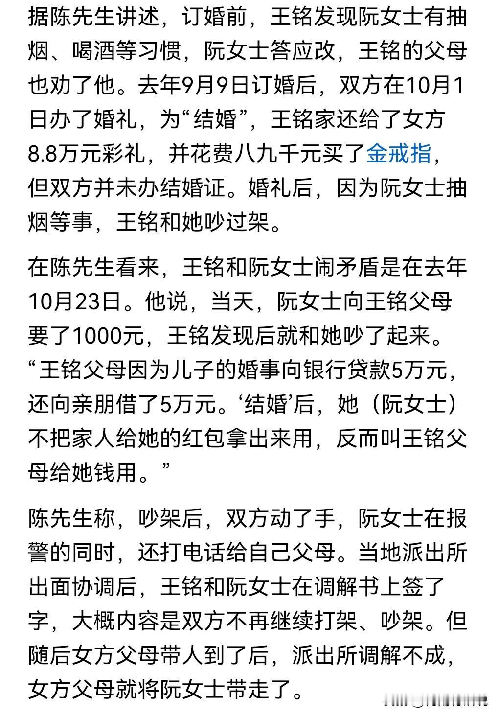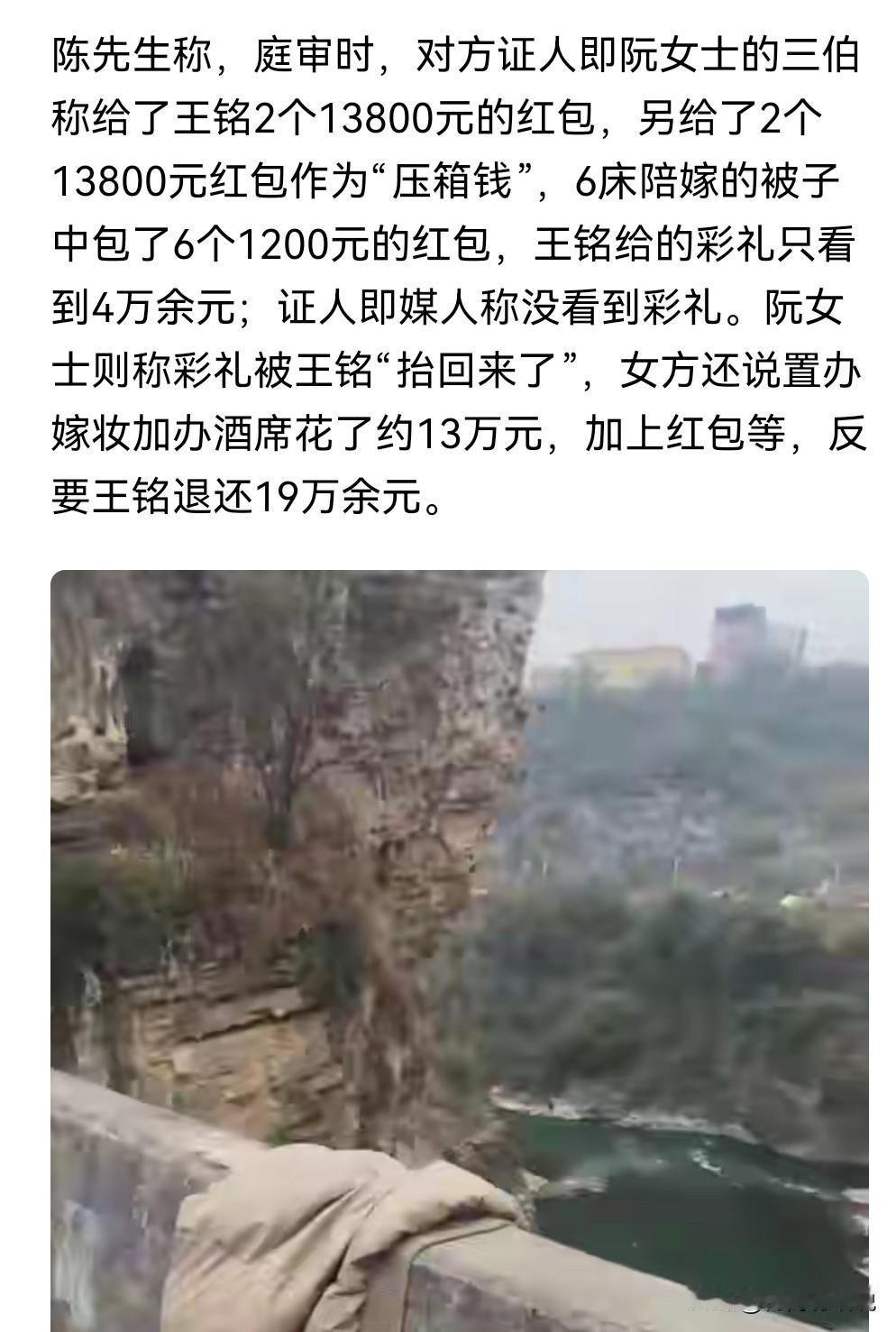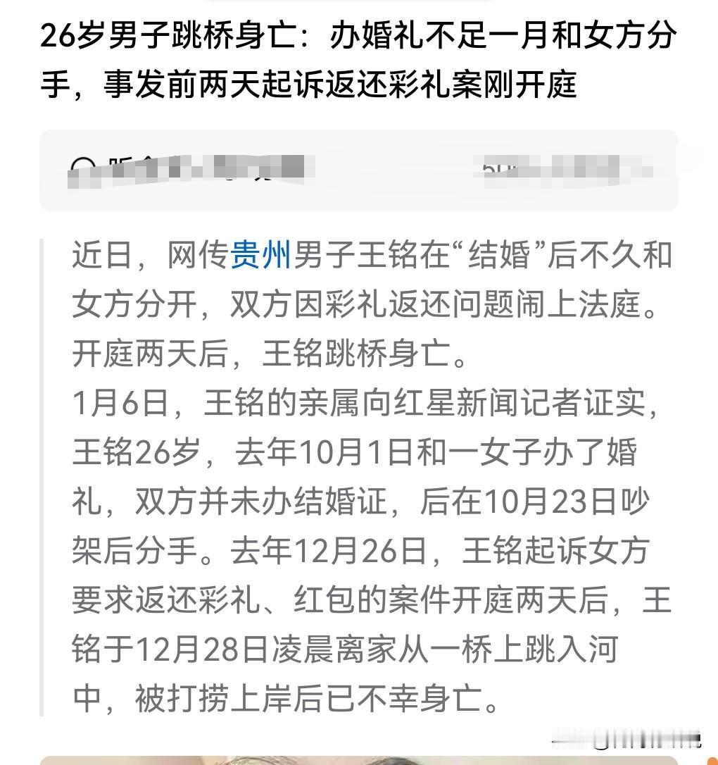 这真的是太悲剧了,竟然选择了轻生。 心态也是太脆弱了。 近日,26岁男子跳桥身亡。 原因是起诉女方还彩礼钱,没想到对方还反要他赔钱。 一时想不开就选择了跳桥。 真的是太悲剧了。 彩礼引发的命案也是越来越多了,高彩礼真的是害人不浅。 双方都没领证的。 没领证办什么酒席呀,真的是莫名其妙。 结果引发了严重后果。