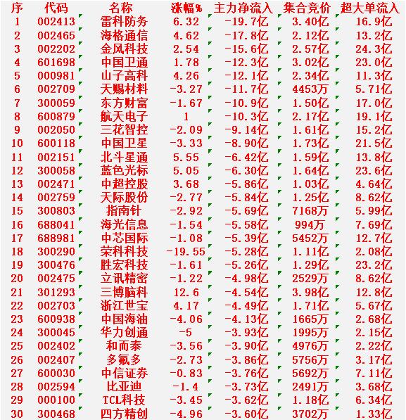 1月7日上午盘,主力趁低位,大幅买入的30名单: 航天发展:上涨6.54%,主力净流入13.0亿元; 格林美:涨停(+9.95%),主力净流入12.3亿元; 通宇通讯:涨停(+10.01%),主力净流入10.7亿元; 北方华创:上涨6.43%,主力净流入8.59亿元; 北方稀土:上涨5.96%,主力净流入7.41亿元。 1月7日中午收盘,主力资金“大幅卖出”的30名单: 雷科防务:上涨6.32%,主力净流出19.7亿元; 海格通信:上涨4.62%,主力净流出17.8亿元; 金风科技:上涨2.54%,主力净流出15.6亿元; 中国卫通:上涨1.78%,主力净流出12.3亿元; 山子高科:上涨4.26%,主力净流出12.1亿元。