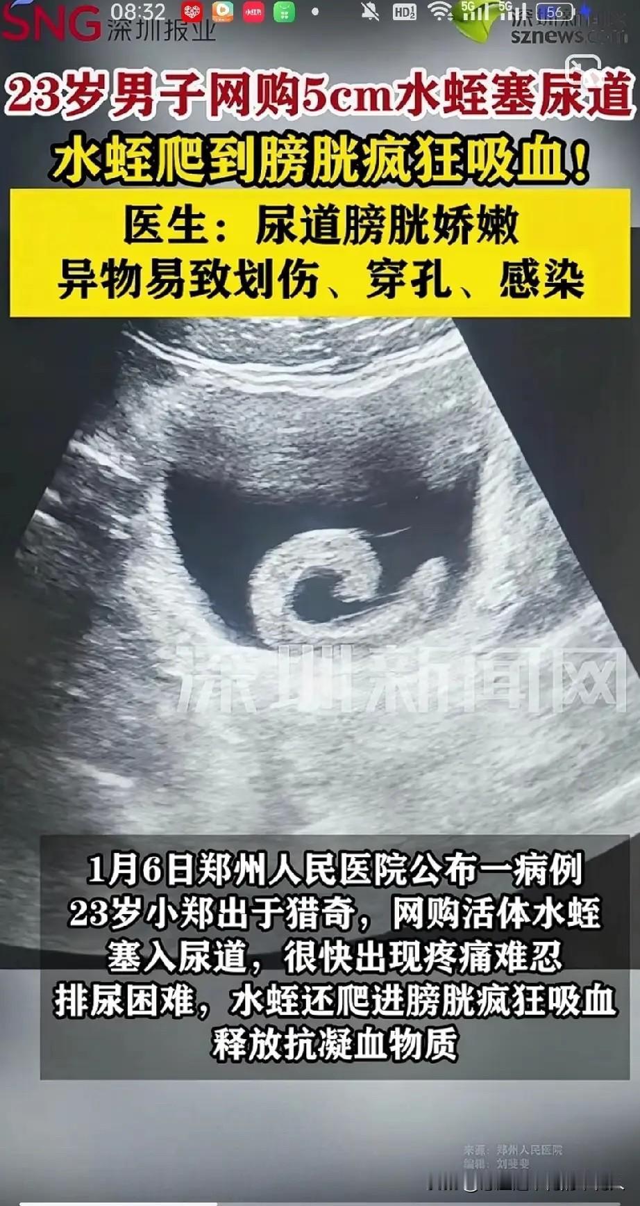 真是让人听了都觉得后背发凉! 1月6日,郑州某医院接诊了一个让人“叹为观止”的病例。一名23岁男子网购了5厘米长的活水蛭,竟然往自己尿道里塞。结果这水蛭也是个“狠角色”,不仅没被尿冲走,反而逆流而上,一路“长征”钻进了男子的膀胱。 进了膀胱后,这只水蛭依然生龙活虎,在这么娇嫩的器官里疯狂吸血。男子被折腾得疼痛难忍,实在扛不住了才去医院求救。医生费了好大劲才把这只“不速之客”请出来。 这操作咱就不评价了,单说这胆量,一般人真比不了。看着都头皮发麻的东西,他竟然敢往自己身上招呼,真是个狠人! 我看这小伙子也是太缺乏常识了。身体发肤受之父母,怎么能拿自己的健康开玩笑?这种为了猎奇或者所谓的“偏方”而不顾身体安危的行为,简直是拿生命在冒险。 有这股“狠劲”和胆量,要是能用在学习、工作或者正经事业上,遇到困难不退缩,那指定能干出一番成绩来。年轻人还是得把心思用在正道上,珍爱生命,别再整这些让人啼笑皆非的“幺蛾子”了。