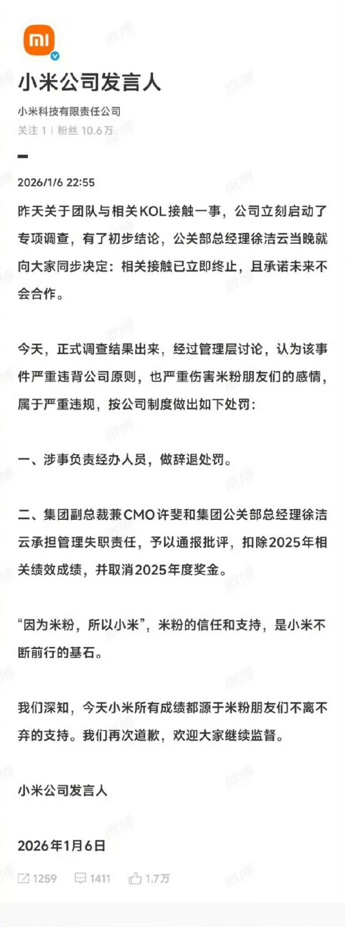 小米称此次事件严重伤害米粉感情确实伤感情!对涉事人员处以辞退、高管取消全年奖金!因为米粉,所以小米,希望回归初心,永远相信美好的事情即将发生!