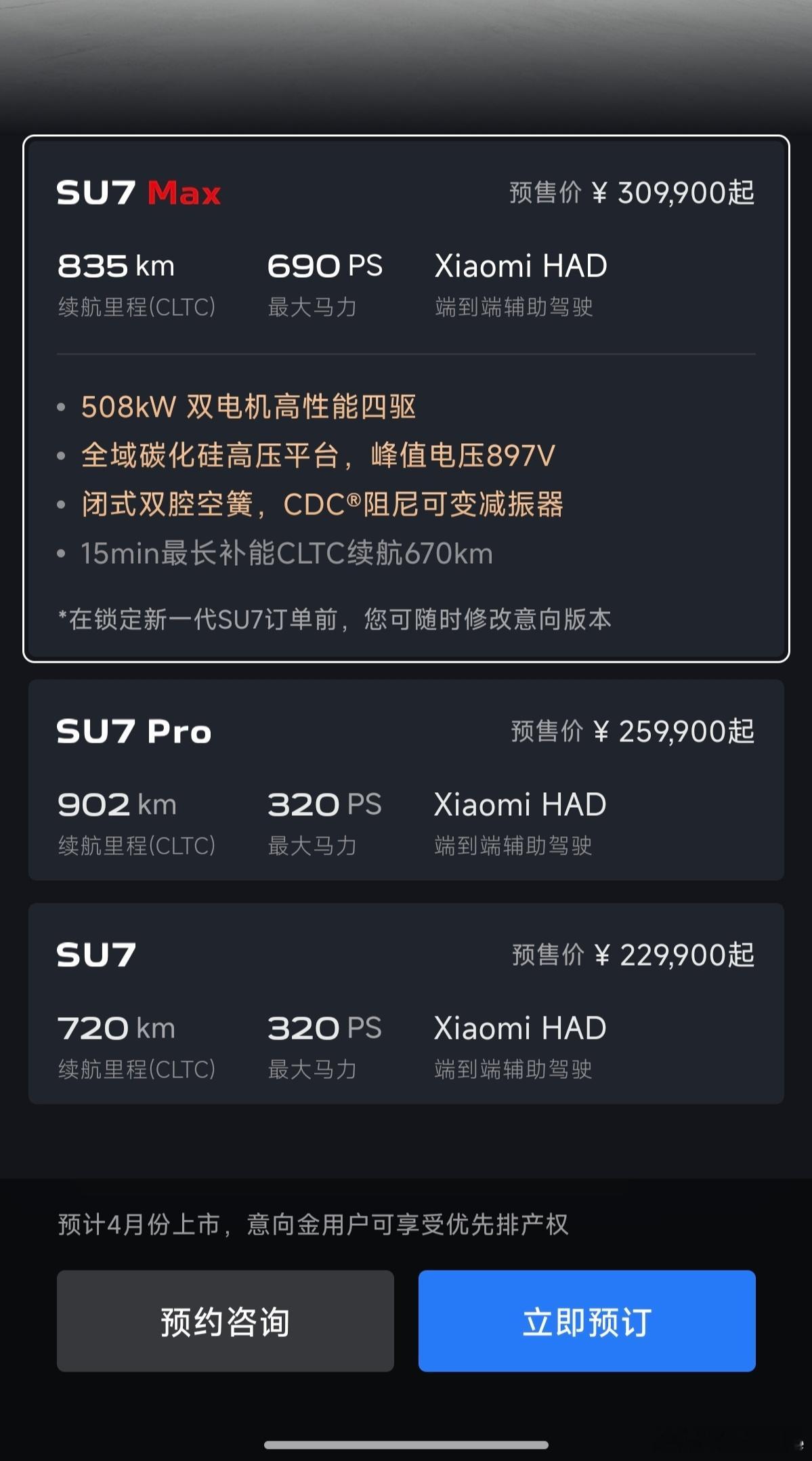 新一代SU7预售价22.99万元起,正式上市价大概率会再低一些。SU7 Pro续航902km就离谱,无焦虑。新一代小米SU7续航达902公里有小订的么全系标配激光雷达+Thor芯片(700TOPS)、全系高压平台,Max是897V、全系标配2200MPa小米超强钢「内嵌式防滚架」、全系标配2200MPa小米超强钢车门防撞梁、全系前245后265轮胎、Pro和Max标配闭式双腔空簧、CDC减振器等等。新一代SU7