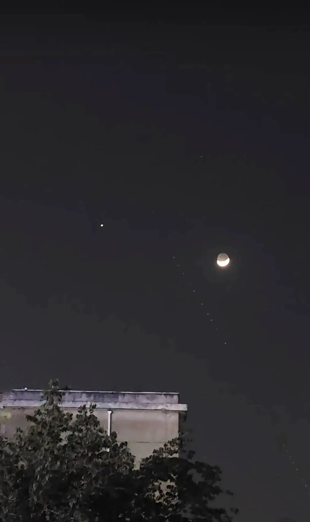 2025年4月30日晚,星链卫星过境四川地区,不少网友拍到了“珍珠抱月”的景象。
