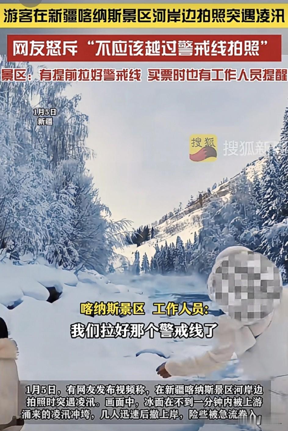 冰块“组团”冲下来!新疆喀纳斯游客拍照遇惊魂一幕:明晃晃的警戒线,拦都拦不住! 这几天,新疆喀纳斯的风景是真美,但有些游客的胆子也是真大! 1月5日,景区河边上演现实版“冰川漂流”:游客正摆着pose拍照呢,上游突然冲下来一大波冰块,哗啦啦像开了闸的“冰河特快”,吓得岸边人拔腿就跑。 幸好,人没事!但看完监控视频,网友血压都上来了。 明明岸边拉了警戒线,立了牌子提醒“冰面危险、禁止入内”,几位游客硬是跨过去拍照。 结果冰块说冲就冲,要不是跑得快,怕是得跟冰块一起“合影留念”了。 景区也懵了:天回暖冰化了,我们提前发了通知,巡逻也派了,喇叭也喊了,奈何有人就是不听劝啊! 管委会工作人员也很无奈:“我们连售票时都附带安全提示,可有人偏偏当‘闯关游戏’玩。” 消息一出,评论区秒变安全教育现场: “警戒线是拦君子不拦‘勇士’是吧?” “建议景区下次在河边放个大喇叭,循环播放《溜冰圆舞曲》。” “大自然:已读,但不回;冰块:来了,真来咯!” “人要有敬畏自然,不是哪里都可以炫!” “记得有一群大妈在河边拍照,遇险了!” 说归说,闹归闹,生命安全别开玩笑。 景区现在已把越线行为登记在案,后续要交给有关部门处理。网友们也直呼:“该管管了!拍照再美,也比不过平平安安回家啊!” 所以,出门游玩到底该怎么“打卡”? 记住一句话:风景不会跑,但冰河真会“冲”。 下次见到警戒线,咱还是乖乖站在线外——毕竟,朋友圈点赞再多,也抵不上你安全回家后那一碗热汤啊! 素材来源:搜狐新闻,侵联删!