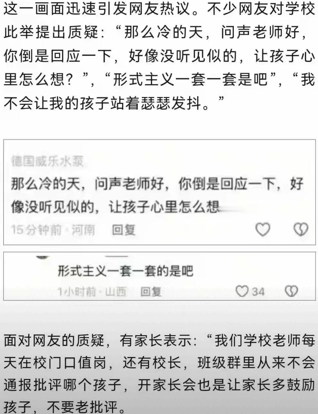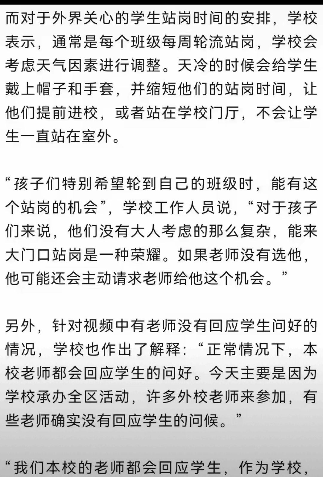 孩子弯腰敬礼喊“老师好”,老师却扭头就走?郑州这所小学的校门口画面,真的戳中了很多人的痛点。 戴着绶带的孩子们站得笔直,一声声问候清脆又真诚,可不少老师连个点头、一个微笑都吝啬给,径直走进校园。学校说没回应的是外校老师,这借口也太苍白了——礼仪从来不是单方面的表演,而是双向的尊重。 安排学生站岗本是想教礼貌,可这种“热脸贴冷屁股”的场景,只会让孩子觉得尊重是“讨好”。教育的温度藏在细节里,老师的一个回应,比十节礼仪课都管用。 你觉得学校该取消这种形式化的站岗吗?如果是你,会怎么回应孩子的问候?来评论区聊聊~ 郑州小学礼仪事件 师生互动 教育细节