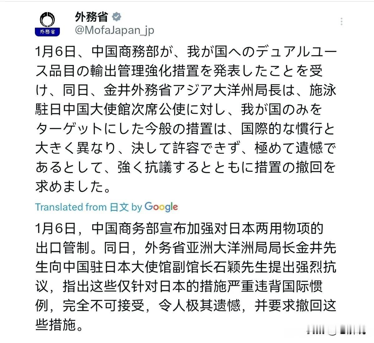 日本出来回应了,态度非常气愤!1月7日,日本外务省声称,1月6日,中国商务部宣布强化对日本两用物品的出口管制措施。同日,日本外务省亚洲大洋洲局局长金井向中国驻日大使馆公使衔参赞提出强烈抗议,称此次专门针对日本的管制措施与国际通行惯例严重不符,完全不可接受,对此深表遗憾,并要求中方撤回该措施。 那么问题来了,啥是“两用物项”呢?其实就是既能民用又能军用的东西,小到稀土永磁材料、镓锗这些原料,大到高精度机床、特种芯片,比如稀土能做手机电机也能造导弹制导系统,镓是军用雷达的核心原料,这些都是现代军工离不开的基础物资。 中国这次管制不是凭空来的,而是日本近期步步紧逼的结果——新首相高市早苗上台后,公然说“台湾有事就是日本有事”,暗示要武力介入台海,还把2026年防卫预算提到9万亿日元的历史新高,又是买战斧导弹,又是在西南诸岛搞军事部署,扩军备战的野心都摆在明面上了。 台湾是中国内政,日本这么明目张胆干涉,还疯狂提升军事实力,中国能眼睁睁看着自己的物资被拿去给它“壮胆”吗?这就像有人拿着你给的工具准备拆你家墙,你肯定得先把工具收回来,完全是正当防卫。 全世界不管是欧盟还是美国,都有两用物项的出口管制制度,欧盟早就明确规定这类物资出口要授权,美国更是动不动就用管制卡别人脖子 。 中国这次是照着《出口管制法》来的,既符合国内法律,也履行了防扩散的国际义务,怎么到日本这就“不符合惯例”了?说白了就是以前能随便拿中国的便宜物资搞军工,现在被管了,利益受损才急着喊冤。 而且中国的管制根本不是“一刀切”,只是禁止军事用途,正常的民用贸易还能继续,给日本企业留足了空间,已经够克制了。 日本之所以反应这么激烈,核心是它对中国这些物资依赖到了离不开的地步。数据摆在这里,日本对中国镓的进口依存度超85%,锗更是接近100%,稀土永磁材料90%都靠中国,连军工芯片需要的超高纯度氟化氢,70%都来自中国江西的企业。更关键的是,这些物资的加工技术中国领先,比如稀土冶炼提纯,日本的纯度和成本都拼不过中国,就算从其他国家买矿石,最后还得找中国加工才能达标。 现在中国一管制,日本的军工生产线可能要停工,六代机、高超导弹这些研发计划也得卡壳,等于是被捏住了“命门”。更让它慌的是,第三方转口的路也被堵死了,中国明确说谁违规转移就追究责任,那些想当“中间商”的国家也不敢冒风险 。 其实日本早该想到这个结果,之前它一边在政治上挑衅中国,一边还想在经济上赚中国的钱,以为“政冷经热”能一直持续。但中国这次用行动说明,经济合作不能脱离政治基础,你都要干涉我内政、威胁我安全了,还想拿我的物资搞军事扩张,哪有这么好的事?之前日本经济界组团访华被“晾”了,现在两用物项又被管制,都是在为自己的错误立场买单 。 所以,中国的管制措施合法、合理、合情,既守住了国家安全的底线,也给日本留了回头的余地。日本与其在这里气愤抗议,不如好好反思自己的所作所为,停止涉台错误言论,放弃扩军备战的野心。 要是执迷不悟,继续挑战中国的核心利益,只会遭到更多反制,最后吃亏的还是自己。毕竟现在的中国,早就不是能随便被拿捏的了,你敢踩红线,就必须承担相应的后果。