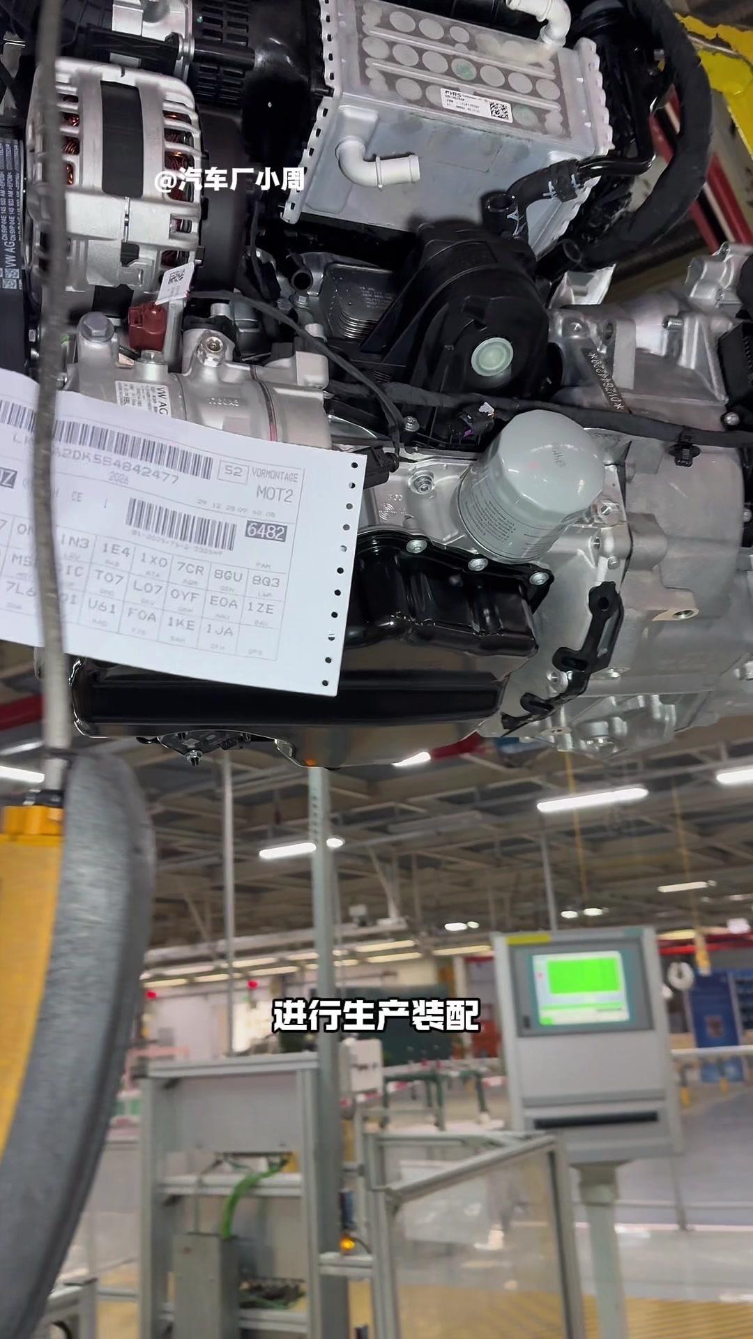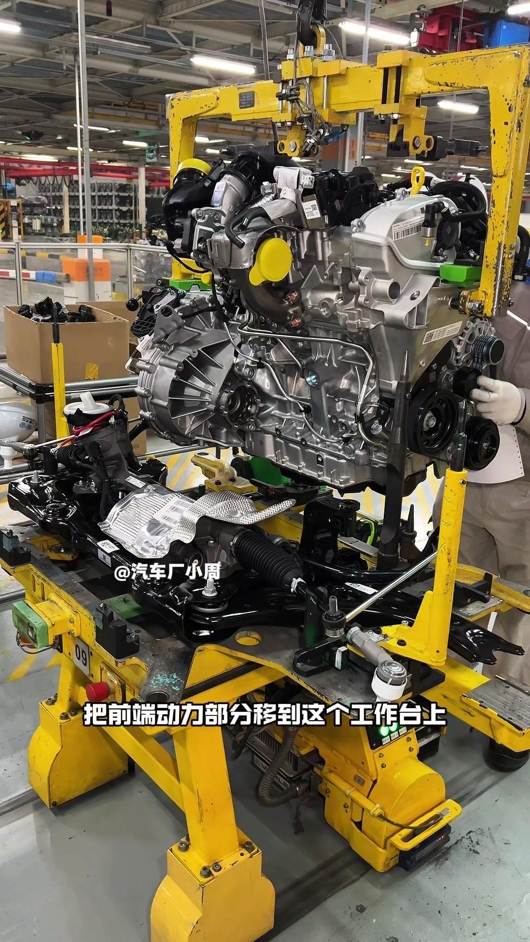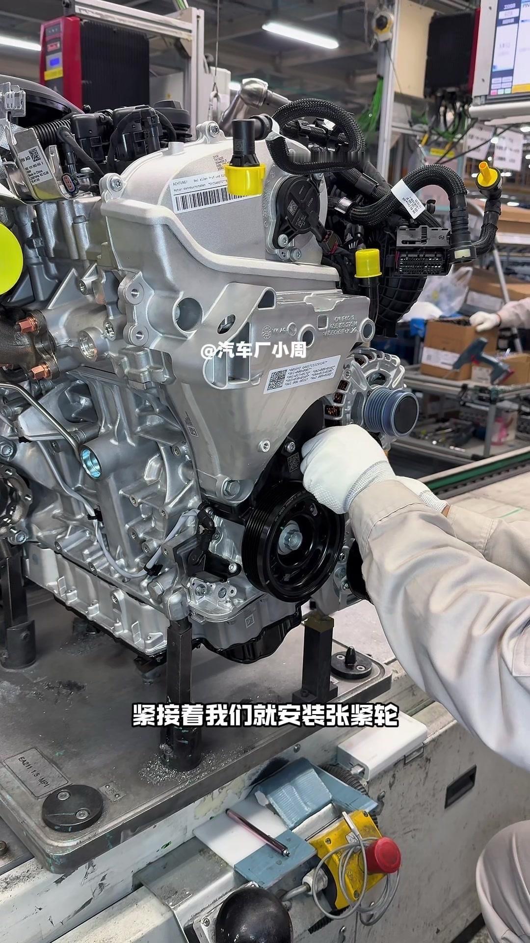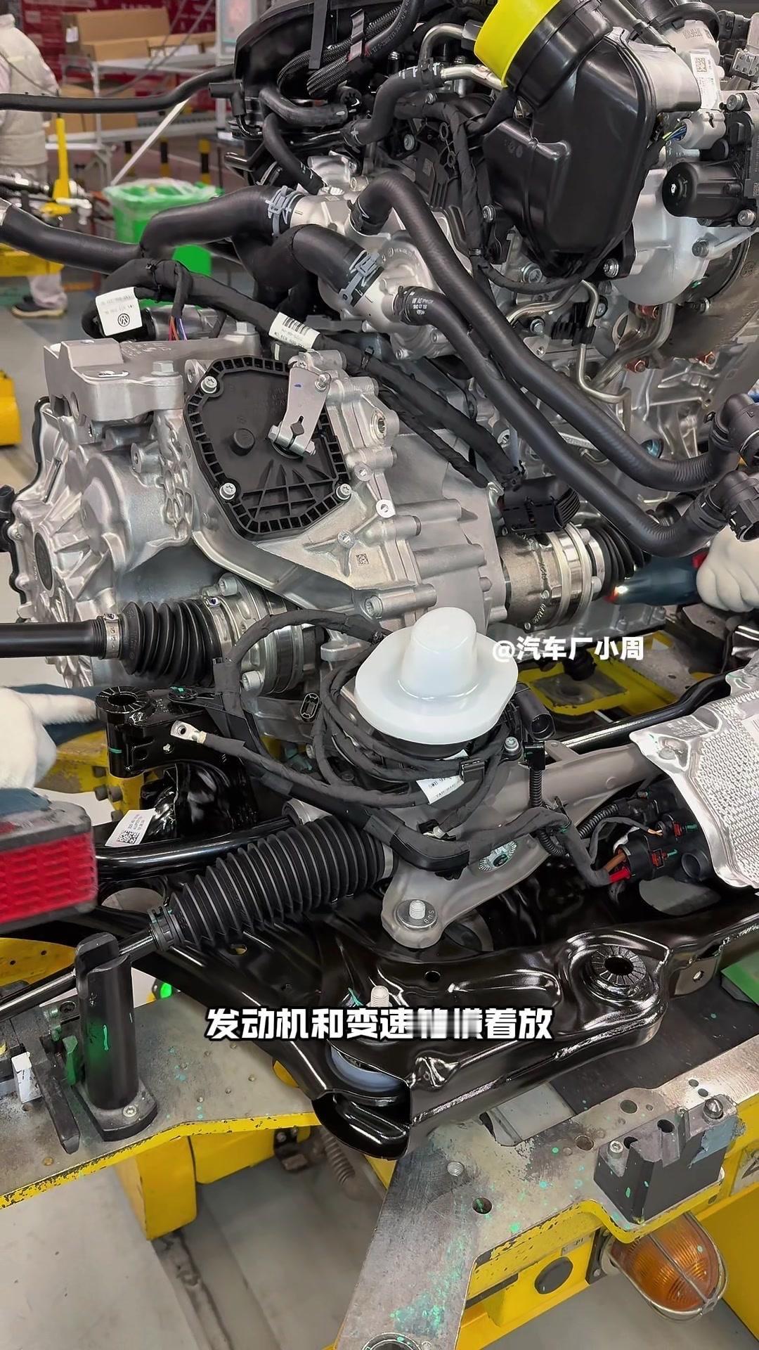 🔥揭秘速腾动力总成组装全过程!大众速腾动力总成组装原来这么多细节,今天带大家看个明白。 首先是吊装发动机,这款EA2111.5T发动机,功率118千瓦,峰值扭矩250牛米,动力参数很能打。接着进行发变结合,吊装代号DQ200的干式双离合变速箱,连接处用5颗德国进口螺钉固定,阿特拉斯拧紧机能保证力矩精度,数据还能保存15年,这装备看着就专业。 起动机装在发动机和变速箱之间,前端有齿轮,点火时伸出和飞轮相连,不愧是“最懒”零件,解放了双手。然后安装发电机和空调压缩机,发电机给电瓶充电,空调压缩机靠制冷剂循环制冷,自动化拧紧机(价值50万)负责紧固,机器包含电枪、伺服系统和存储系统,细节满满。 张紧轮调节皮带松紧,防止老化变形,旁边是多楔皮带(连接发电机和压缩机),还有内部的正时皮带(12万公里更换)。随后动力部分通过自动化设备转运到副车架装配线,副车架集成了麦弗逊悬架、方向机、转向拉杆等部件,难怪叫“副车架”。 发动机冷却管路很讲究,装了随动泵(自然吸气车没有)给中冷器降温,冷却水管用异丙醇软化后安装,再密封接口。半轴分长短轴,用对角紧固法安装并做标记,接着是减震器、刹车盘和转向节的连接,大力矩螺钉自动紧固。 三元催化和颗粒捕捉器是偶合式设计,靠近发动机能防堵塞,前端排气管是谐振器,后端是消音器,1.5T单边双出,高温材质不防锈属正常。最后装弹簧和后滑柱(减震器),刹车制动管含10多层复合材料,树脂油箱比铁质更安全且防燃,隔热瓦和换挡装置也依次到位。 最后动力底盘通过西门子设备(16个点位精准结合)和车身组装,EA2111.5T的动力总成就这么诞生了。
