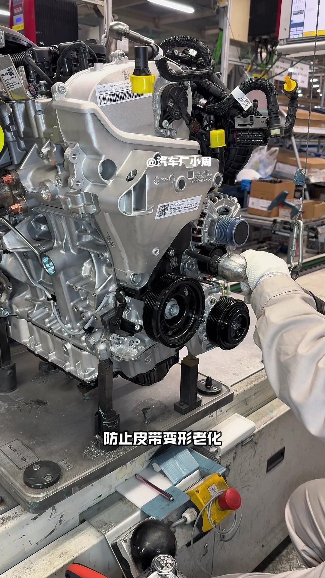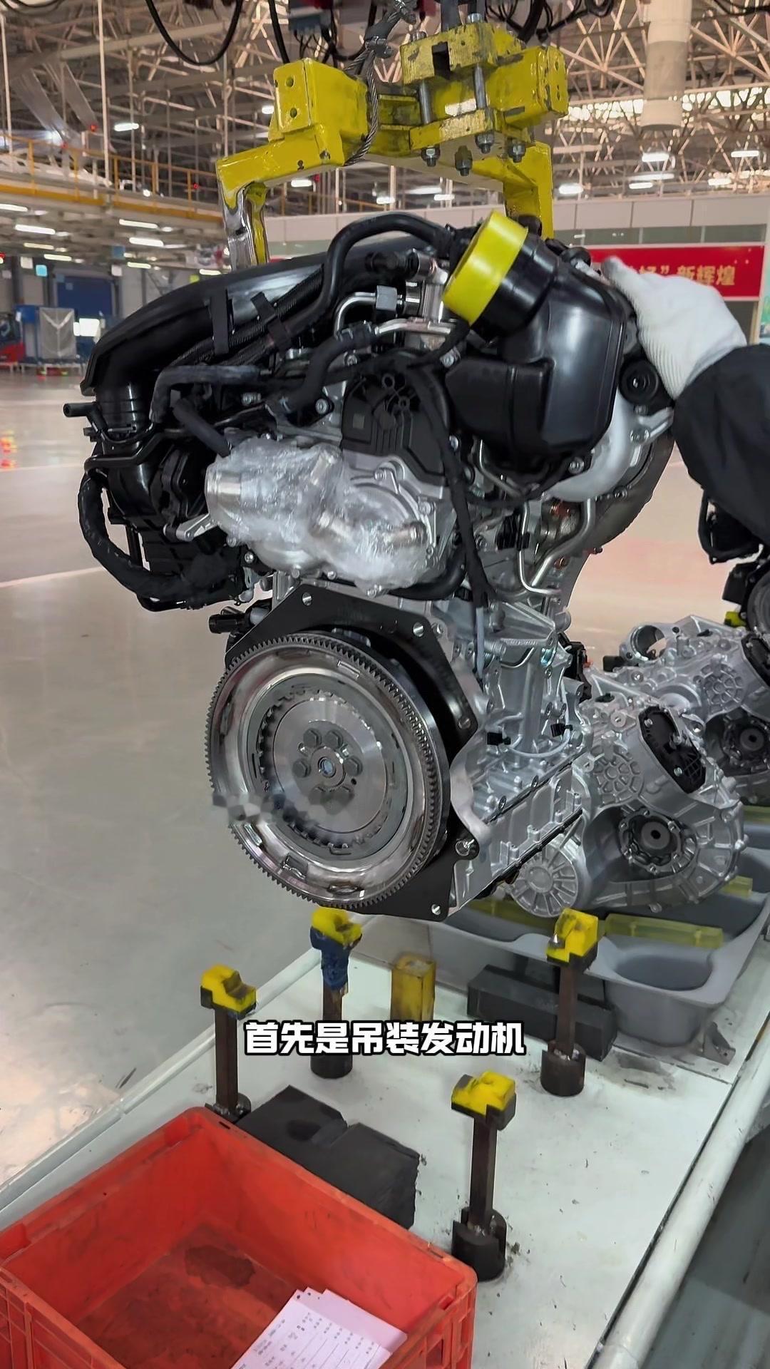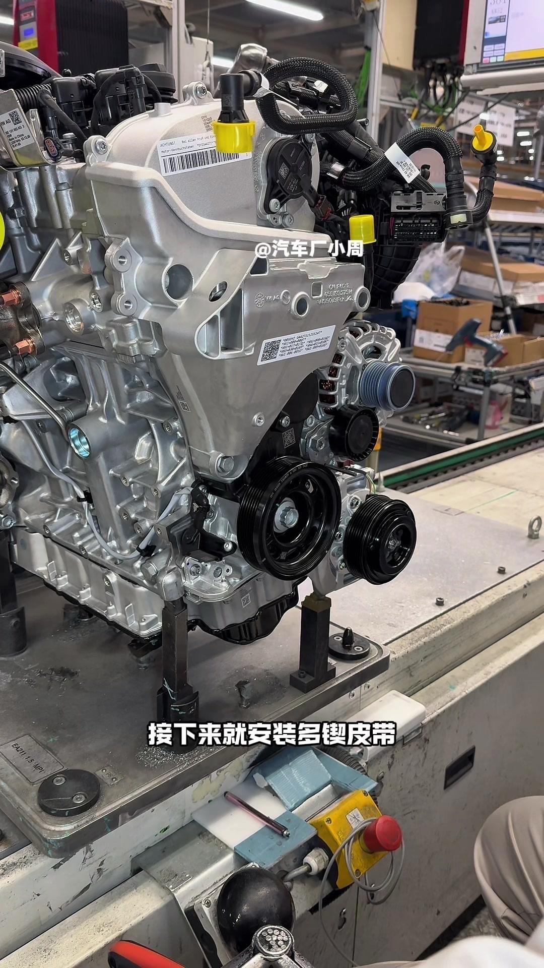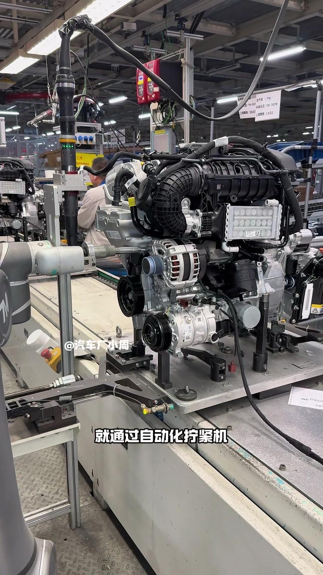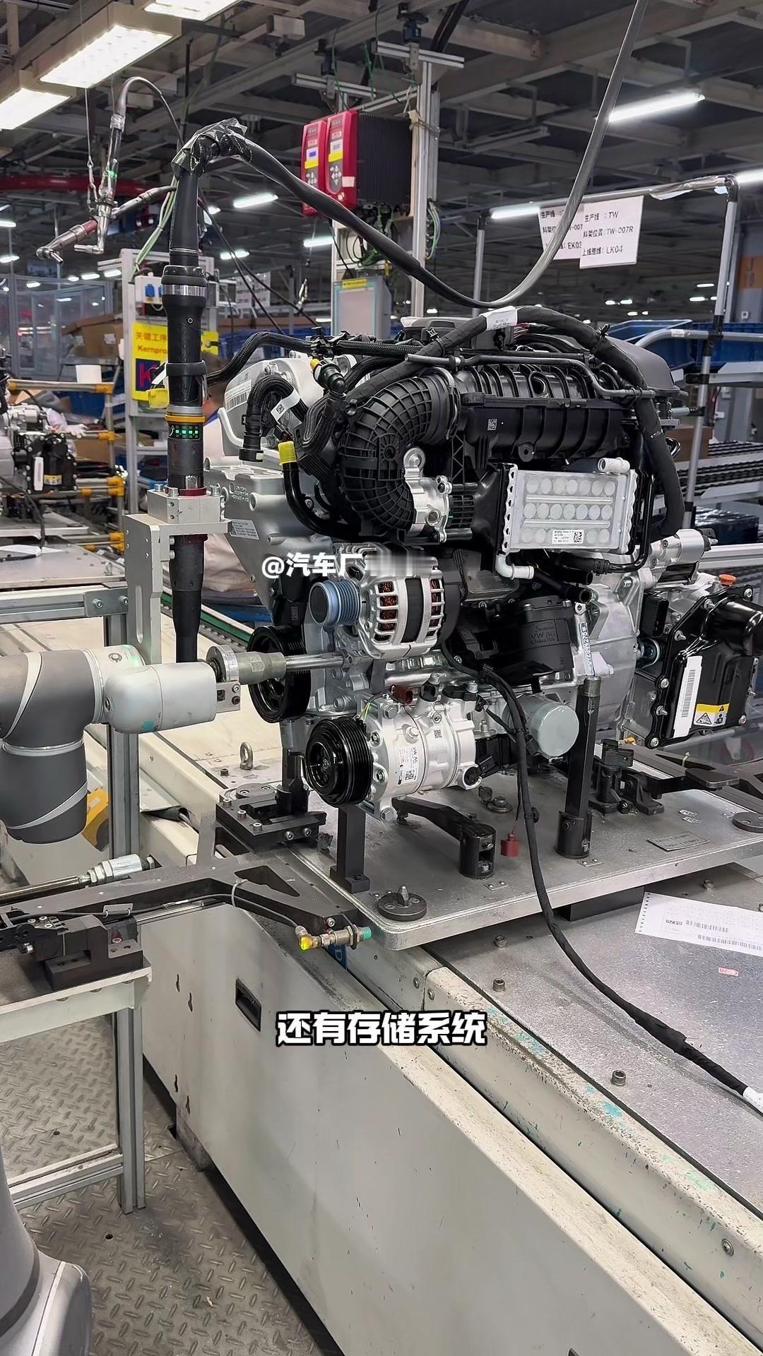🔥揭秘速腾动力总成组装全过程!大众速腾动力总成组装原来这么多细节,今天带大家看个明白。 首先是吊装发动机,这款EA2111.5T发动机,功率118千瓦,峰值扭矩250牛米,动力参数很能打。接着进行发变结合,吊装代号DQ200的干式双离合变速箱,连接处用5颗德国进口螺钉固定,阿特拉斯拧紧机能保证力矩精度,数据还能保存15年,这装备看着就专业。 起动机装在发动机和变速箱之间,前端有齿轮,点火时伸出和飞轮相连,不愧是“最懒”零件,解放了双手。然后安装发电机和空调压缩机,发电机给电瓶充电,空调压缩机靠制冷剂循环制冷,自动化拧紧机(价值50万)负责紧固,机器包含电枪、伺服系统和存储系统,细节满满。 张紧轮调节皮带松紧,防止老化变形,旁边是多楔皮带(连接发电机和压缩机),还有内部的正时皮带(12万公里更换)。随后动力部分通过自动化设备转运到副车架装配线,副车架集成了麦弗逊悬架、方向机、转向拉杆等部件,难怪叫“副车架”。 发动机冷却管路很讲究,装了随动泵(自然吸气车没有)给中冷器降温,冷却水管用异丙醇软化后安装,再密封接口。半轴分长短轴,用对角紧固法安装并做标记,接着是减震器、刹车盘和转向节的连接,大力矩螺钉自动紧固。 三元催化和颗粒捕捉器是偶合式设计,靠近发动机能防堵塞,前端排气管是谐振器,后端是消音器,1.5T单边双出,高温材质不防锈属正常。最后装弹簧和后滑柱(减震器),刹车制动管含10多层复合材料,树脂油箱比铁质更安全且防燃,隔热瓦和换挡装置也依次到位。 最后动力底盘通过西门子设备(16个点位精准结合)和车身组装,EA2111.5T的动力总成就这么诞生了。