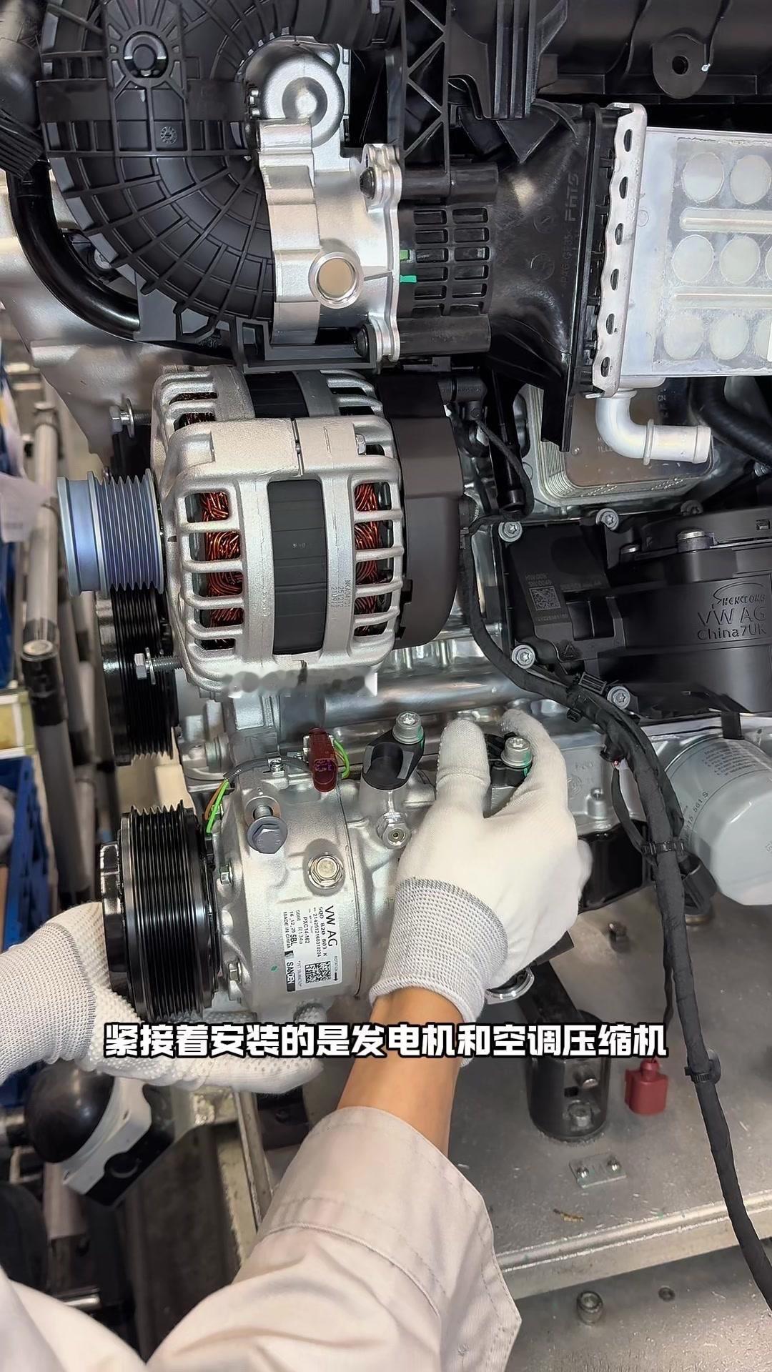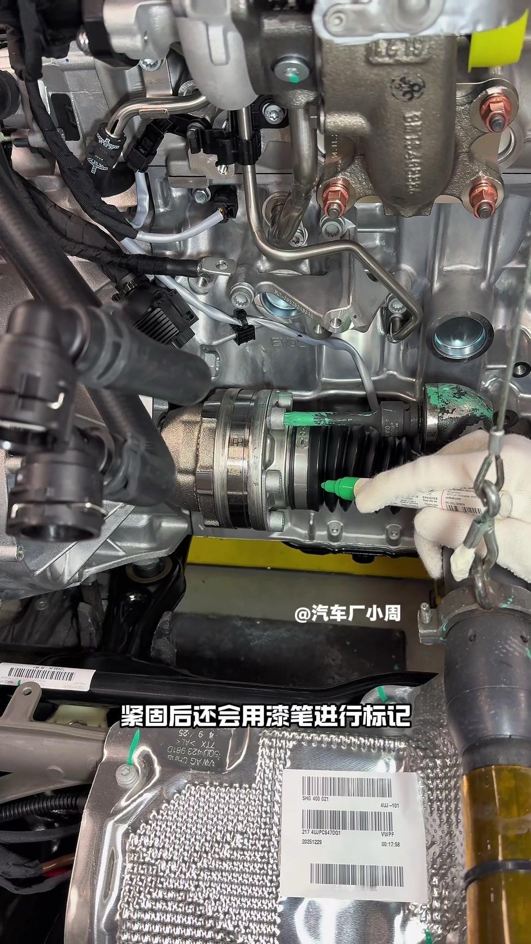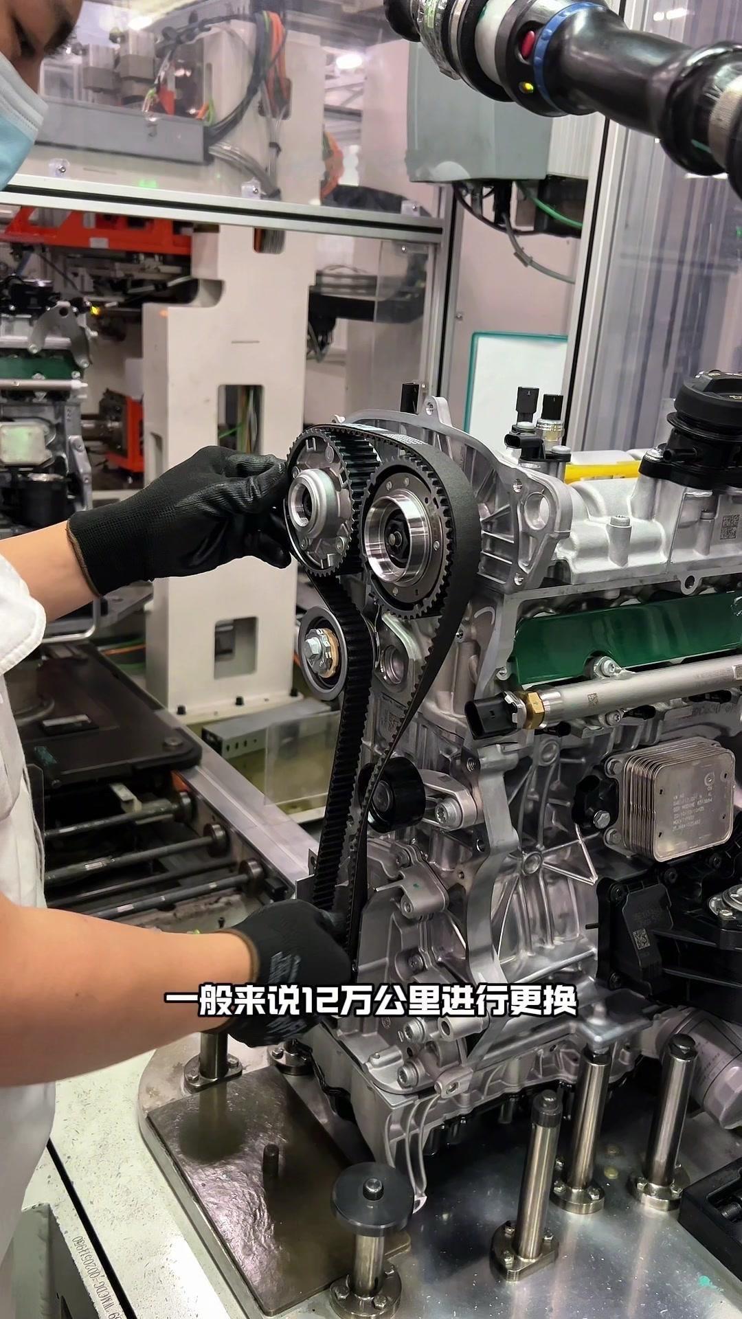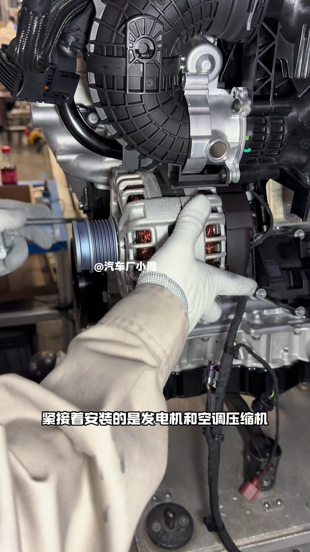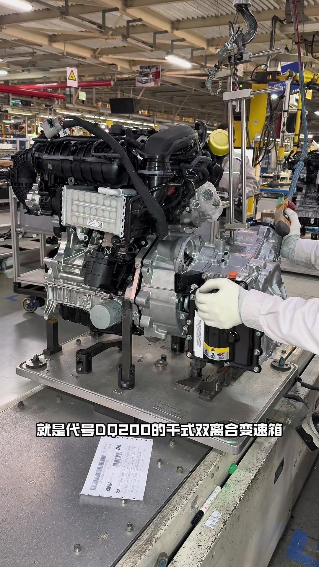 🔥揭秘速腾动力总成组装全过程!大众速腾动力总成组装原来这么多细节,今天带大家看个明白。 首先是吊装发动机,这款EA2111.5T发动机,功率118千瓦,峰值扭矩250牛米,动力参数很能打。接着进行发变结合,吊装代号DQ200的干式双离合变速箱,连接处用5颗德国进口螺钉固定,阿特拉斯拧紧机能保证力矩精度,数据还能保存15年,这装备看着就专业。 起动机装在发动机和变速箱之间,前端有齿轮,点火时伸出和飞轮相连,不愧是“最懒”零件,解放了双手。然后安装发电机和空调压缩机,发电机给电瓶充电,空调压缩机靠制冷剂循环制冷,自动化拧紧机(价值50万)负责紧固,机器包含电枪、伺服系统和存储系统,细节满满。 张紧轮调节皮带松紧,防止老化变形,旁边是多楔皮带(连接发电机和压缩机),还有内部的正时皮带(12万公里更换)。随后动力部分通过自动化设备转运到副车架装配线,副车架集成了麦弗逊悬架、方向机、转向拉杆等部件,难怪叫“副车架”。 发动机冷却管路很讲究,装了随动泵(自然吸气车没有)给中冷器降温,冷却水管用异丙醇软化后安装,再密封接口。半轴分长短轴,用对角紧固法安装并做标记,接着是减震器、刹车盘和转向节的连接,大力矩螺钉自动紧固。 三元催化和颗粒捕捉器是偶合式设计,靠近发动机能防堵塞,前端排气管是谐振器,后端是消音器,1.5T单边双出,高温材质不防锈属正常。最后装弹簧和后滑柱(减震器),刹车制动管含10多层复合材料,树脂油箱比铁质更安全且防燃,隔热瓦和换挡装置也依次到位。 最后动力底盘通过西门子设备(16个点位精准结合)和车身组装,EA2111.5T的动力总成就这么诞生了。
