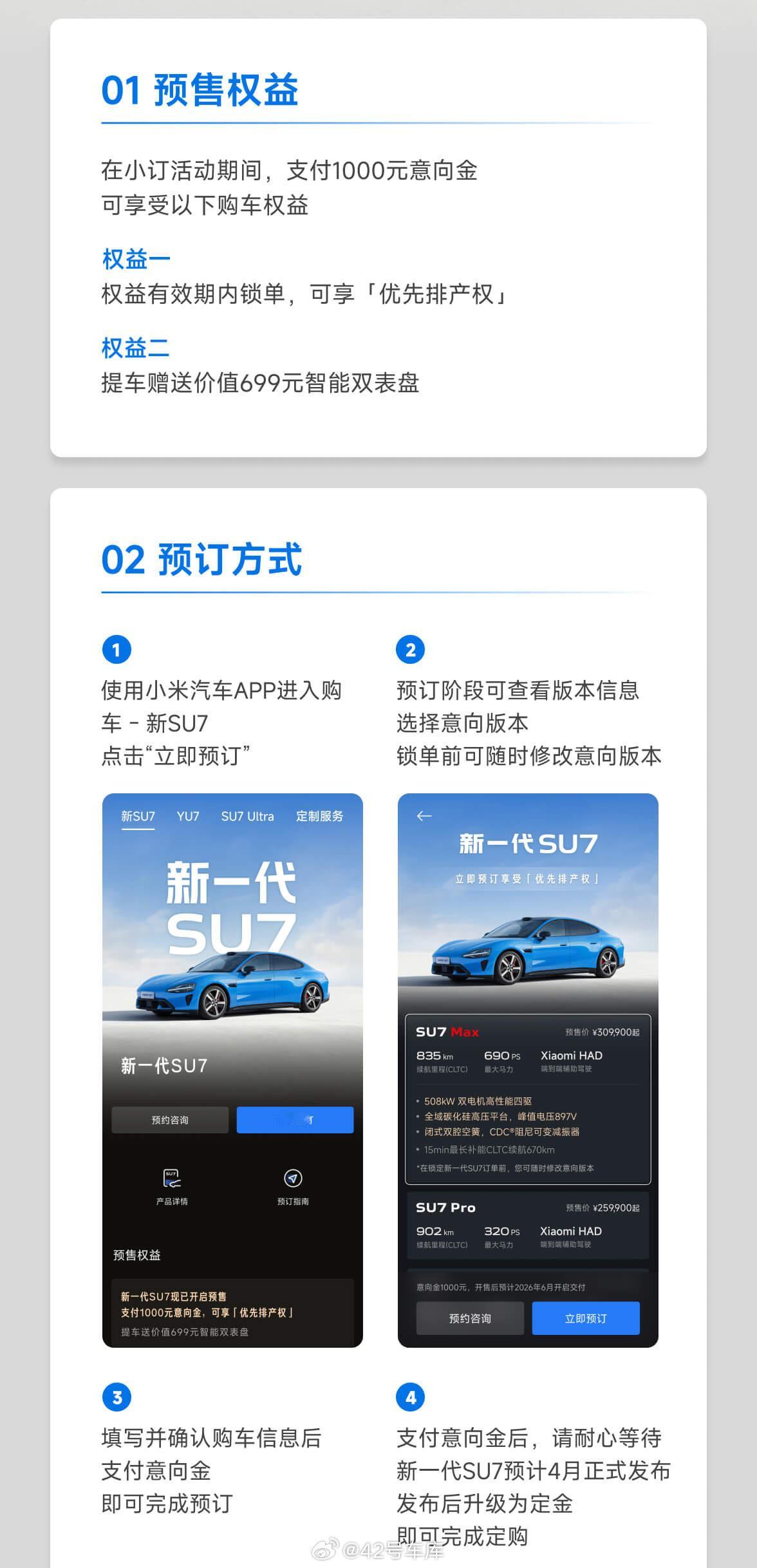 新一代小米SU7亮相小订已经开启了,价格分别为22.99 万、25.99 万、30.99 万。新一代 SU7 亮点:全系长续航,最长续航高达902km;全系标配激光雷达,满配辅助驾驶;底盘升级,驾驶质感更出色。支付 1,000 元意向金及锁单,可得「优先排产权」,对于爆款来说这个权益太重要了;提车时可得价值 699 元的智能双表盘,也是很有趣的配置。你们下订了吗?42how小米新一代su7全新配色卡布里蓝