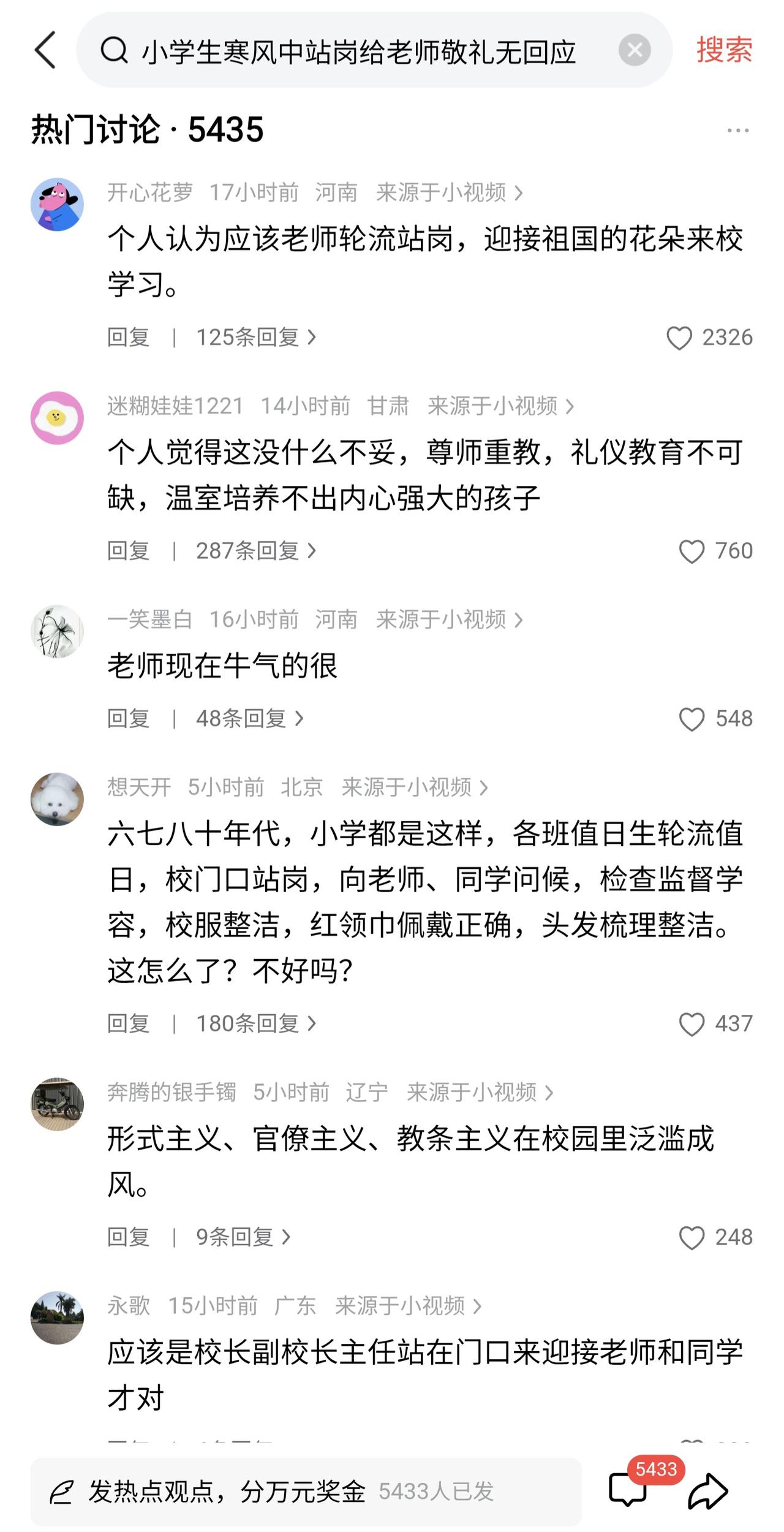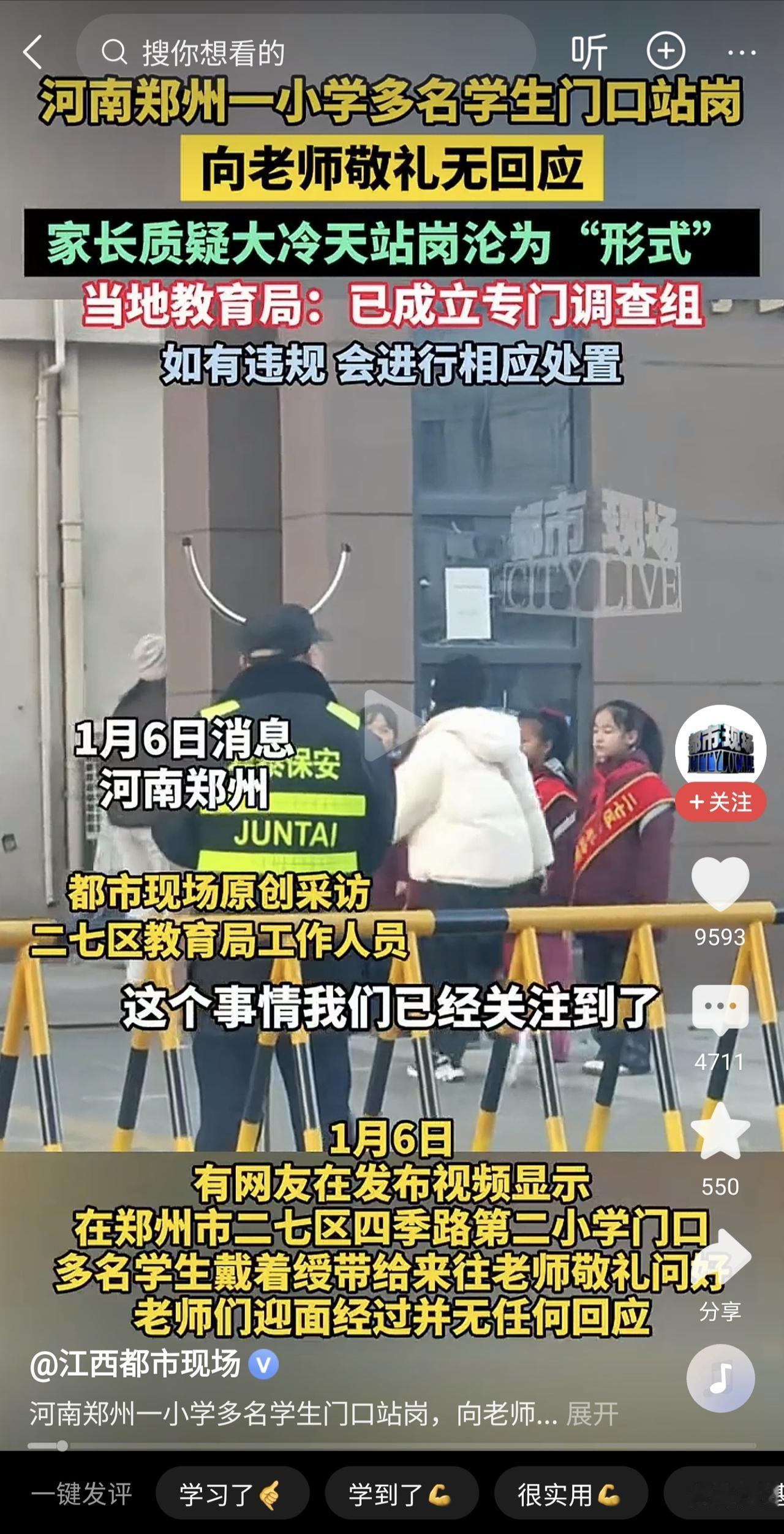 寒风中向老师敬礼的孩子们,理应获得老师同等的尊重。 郑州这个小学的视频看了后,作为两个孩子的爸爸,说实话有点不是滋味。大冷天孩子们在校门口站岗见到老师就举手敬礼问好,但是老师们却毫不理睬直接走过。 其实从我看来,并不反对礼仪岗的设置,它可以陪伴孩子的礼貌和责任感,我们批评学校并不是想要让孩子做温室里的花朵。我们上学的时候不也有吗,打扫公共卫生,检查班级卫生、纪律? 但是礼仪岗教导的不止学生,还有老师,师生关系应该是在尊师爱生、相互尊重来构建。孩子们寒风中站岗的热情问候,换来了老师的沉默走过,这就不是礼仪岗设置的初衷了。教育部2023年修订的《教师礼仪规范》就特别新增了平等互动的条款。 教育的温度就在于言传身教,礼仪岗的设置应当回归其设置初衷而不是流于形式。就事件本身看并不复杂,孩子们付出了真诚的礼貌,教师则有义务给予真诚的尊重。 网上看到教育局开始介入调查,我们不是希望去追责,而是要推动审视落实学校礼仪或者类似岗位的真实价值。