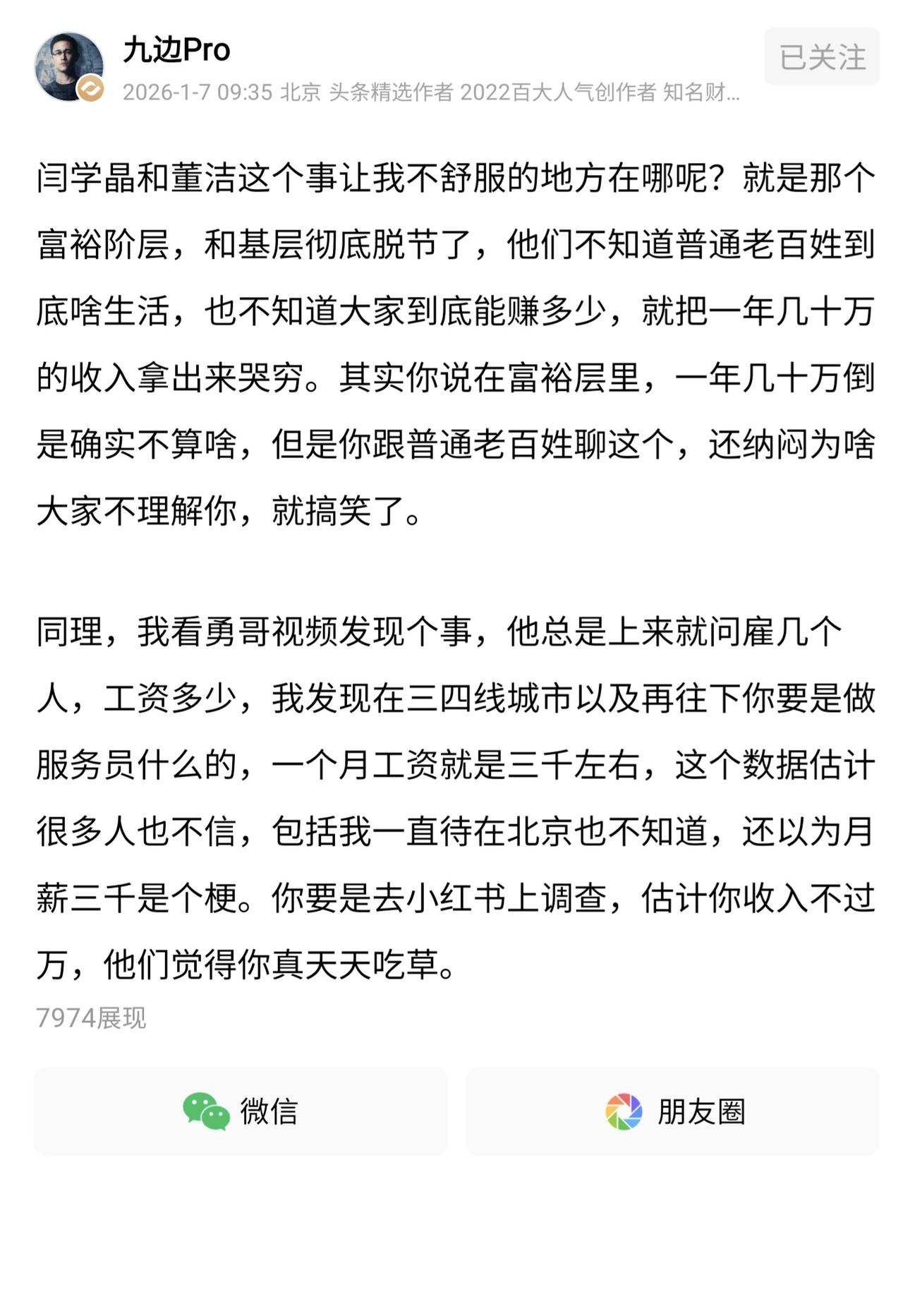 看到@九边Pro大佬对闫学晶、董洁哭穷的评论,我在他的评论区评论了一句话没想到