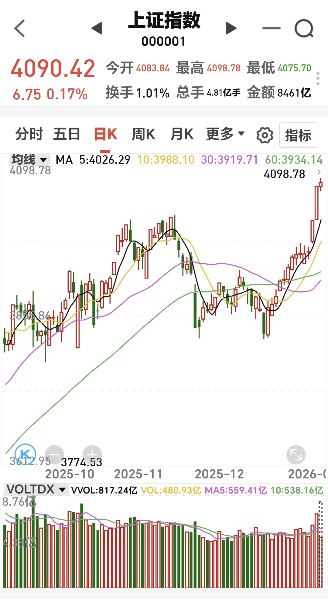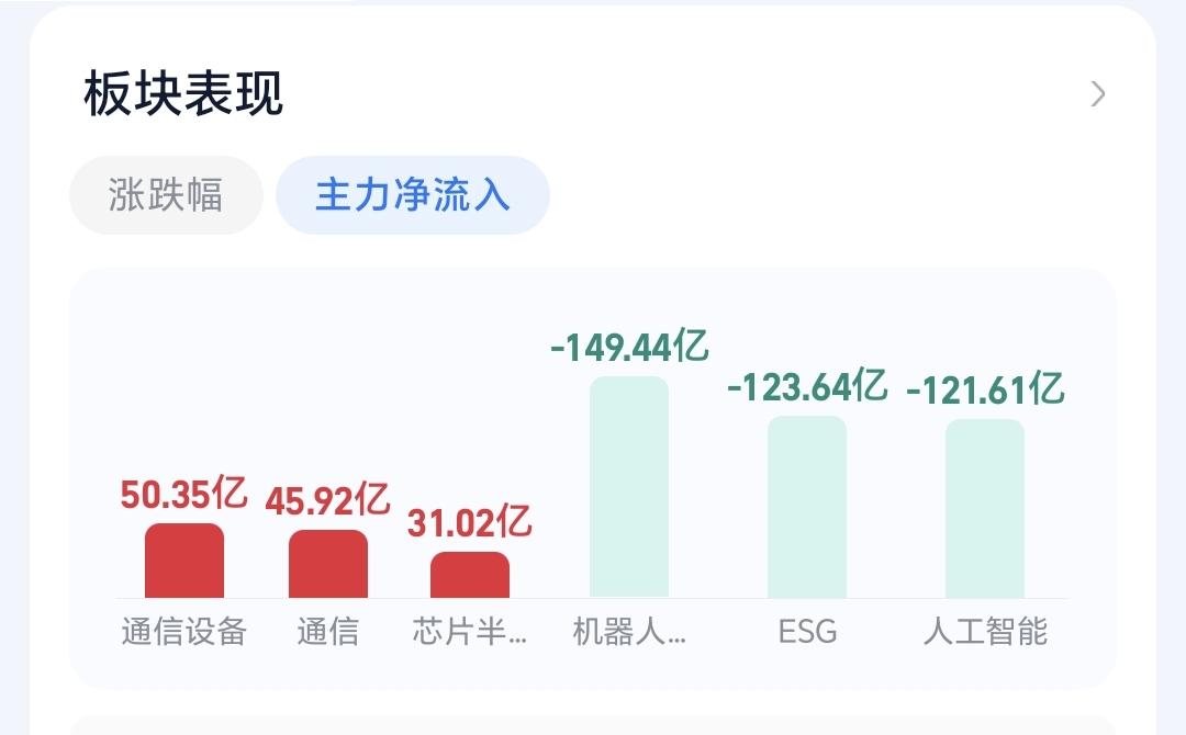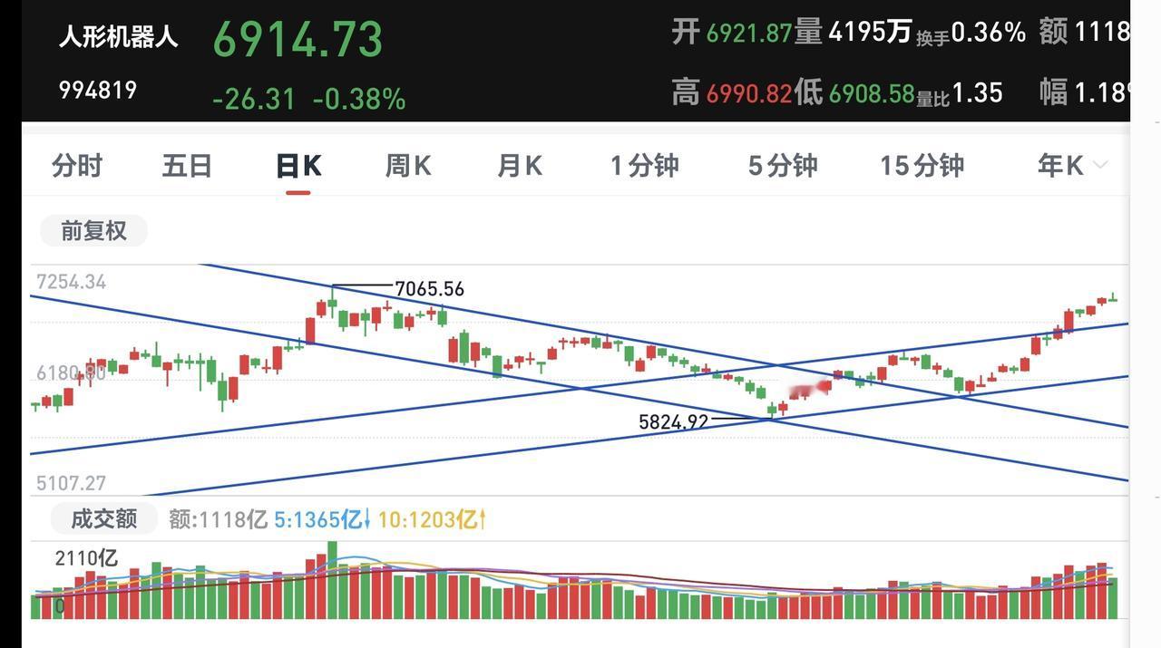 基金:市场这一轮的上涨有没有结束 今天市场下午开盘以后小幅度震荡,三大指数还是保持着红盘,创业板指上涨了0.15%,盘中点位3324点,上证指数上涨了0.20%,盘中点位4091点。 整个股票市场,上涨2661家,下跌2650家,涨停94家,跌停7家,上涨家数多于下跌家数。 持有的基金中,盘中估值上涨幅度最大的三个板块是:医疗板块,芯片半导体板块,先进制造板块,估值下跌幅度最大的三个板块是:新能源汽车板块,证券板块,上证50板块,估值整体上涨了4919元。 整个基金市场,上涨8003家,下跌10896家,上涨幅度超过5%的47家,没有下跌幅度超过5%的基金。 图9是今天基金的上涨排行榜,图10是今天基金的下跌排行榜,图11是ETF上涨幅度排行榜,图12是今天基金的加仓榜,图13是今天基金的减仓榜。 1:下午盘中的黄色线还是保持在蓝色线上方,两条线之间的敞口还是比较大,所以,只要两条线之间的敞口不缩小,今天下午大幅度跳水的可能性就很小,即使跳下去,也有可能会拉回头,今天收中大阴线的可能性不大,小阴线都不能代表这轮上涨已经结束,因为没有见到人声鼎沸,因为我的评论区还没有许多人来责怪我,如果看到我的评论区,有许多人在责怪因为我的半仓而影响了他的挣钱,那个时候的高点级别就比较大了,我估计这个高点会在4100点上方,所以,市场这一轮的上涨还没有结束。 2:今天两市累计成交20296亿,相比于昨天同期放量了3%,成交量放大的幅度在越来越小,资金进场的意愿在越来越弱。 3:我们来看一下下面的截图14,这是主力资金进出板块的情况,主力资金净流入最多的三个板块是:通信设备板块,通信板块,芯片半导体板块,主力资金净流出最多的三个板块是:机器人板块,esg板块,人工智能板块。 我们来看一下今天主力资金净流出最多的机器人板块的情况,看下面的截图15,这是机器人板块日K线图,从图中可以看出,我画了两条倾斜向上的斜线,这是机器人板块日线级别短期上涨通道。前段时间上涨突破了这个上涨通道的上轨,进入了加速上涨走势,这个地方可以持有,不可以追涨。 我们来看一下下面的截图16,这是机器人板块周K线图,从图中可以看出,我画了两条倾斜向上的斜线,这是机器人板块周线级别上涨通道,现在的位置处于这个上涨通道内,也就是说,机器人板块周线级别处于上涨趋势中,机器人板块大方向向上。 我们来看一下另一个主力资金净流出比较多的板块人工智能,看下面的地图17,这是人工智能板块日K线图,从图中可以看出,我画了一条倾斜向下的斜线,这是人工智能板块日线级别短期下跌趋势线。前几天上涨突破了这条下跌趋势线,也就是说,人工智能板块日线级别下跌趋势有可能已经被改变。 我们来看一下下面的截图18,这是人工智能板块周K线图,从图中可以看出,我画了一条倾斜向下的斜线,这是人工智能板块周线级别短期下跌趋势线,本周的上涨突破了这条下跌趋势线,是不是有效突破,还需要继去观察。 2026年开年以后大涨,这是一个梦幻开局,这是很多年以来没有过的开局,许多人看到这样的开局就飘了,认为后面会一直像这样涨上去,认为后面会一直像现在这样持续挣钱,市场哪有这么简单,市场的钱哪有这么容易挣,如果真的可以这样轻松挣钱的话,现在工厂里面根本没有一个打工的人,都会把自己的存款拿出来涌进市场了,事实上,并不是这样的。 市场连续上涨以后,我们需要考虑的是不是要落袋为安,而不是考虑要不要进场追涨,市场连续下跌以后,我们需要考虑的是不是要低位捞一些筹码,而不是考虑要不要割肉,追涨也有可能会有盈利,但收益风险比例不好,低位进场也有可能会有亏损,但收益风险比较好,我们玩基金就是要玩的一个大概率,小概率挣钱的事情我们不做。 今天究竟应该怎么办?我会在评论区留言。 我每天都会分享我的观点,我的观点只代表我个人的看法,不能作为你操作的依据,据此操作后果自负。