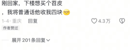 刚回家,下楼想买个苕皮,我将普通话他收我四块