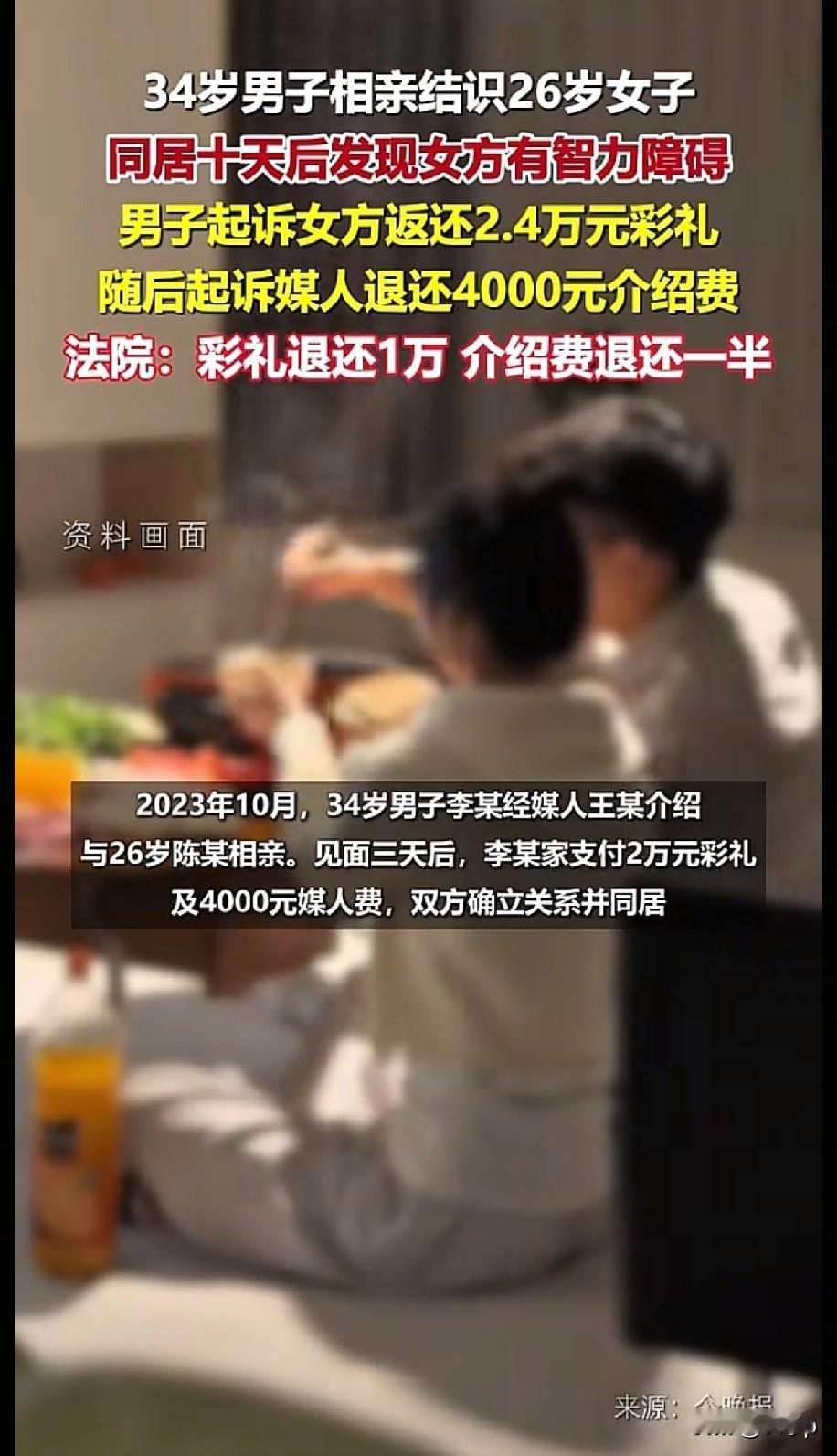 同居10天后发现女方有智力障碍 34岁的男子李某经过媒婆介绍认识了 26岁的女子陈某,三天后李某家人给了 陈某家两万的彩礼,还有媒婆的4千介绍费,俩人就住一起了 十天后两人坐船游玩长江,因为小事吵架后,女方把男方的手机和眼镜扔到了江里 此刻李某才发现这个已经订婚的女友不太正常,把女友送回她家后,这才开始打听后得知,女方有智力残疾二级 李某知道实情肯定不愿意,就要求女方退彩礼,女方父母肯定也不同意,人都住一块了,想退就退,不可能的事 于是李某只能到法院起诉,最后涪陵区人民法院判决女方家退还彩礼一万, 另外媒婆的介绍费也退回一半 自古以来媒婆都是说的天花乱坠,只说对方的优点,而且优点往往都有夸大的成分,缺点在她们嘴里基本不存在 所以说结婚之前要去村里打听一下,这是有道理的。