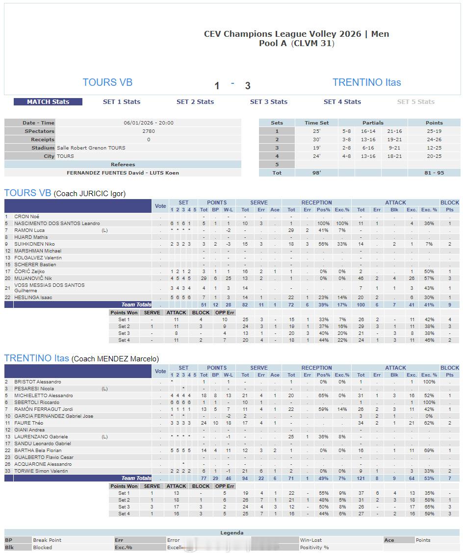 【欧冠男排特伦蒂诺3-1图尔取两连胜 热舒夫3-0轻取吕讷堡】国际排坛战报速递1月6日,欧冠男排第四轮第二回合,A组意大利特伦蒂诺客场3-1(19-25/26-24/25-12/25-20)击败法国图尔,取得两连胜。MVP弗雷24分、米切莱托18分、巴塔14分、拉蒙13分,穆亚诺维奇29分。D组波兰热舒夫主场3-0(25-14/25-15/25-19)轻取德国吕讷堡。MVP布特林19分、切布伊和戴姆亚年科各10分,查普林10分。