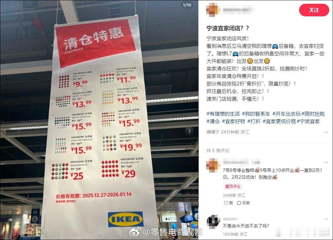 【浙江首家宜家商场将关店】宜家宣布关闭7家门店 1月7日中午,“宜家中国资讯中心”发文宣布,将于2026年2月2日起停止运营上海宝山、广州番禺、天津中北、南通、徐州、宁波及哈尔滨的7家商场。公司称此举为优化渠道布局、构建业务韧性。据宜家官网,目前浙江拥有3家宜家商场,分别位于杭州、宁波、温州。宁波宜家于2013年7月17日正式开业,这是宜家在浙江省的首家商场。在社交平台上,有不少宁波网友发帖称今日去宜家商场但不让进,还有网友发帖称宁波宜家清仓特惠等。早在2024年,就有网友发帖说宁波宜家卖场和收银处几乎见不到顾客,感叹:“曾经有那么多年轻人追捧的宜家,也走到了尴尬的境地。”今日,橙柿记者拨打宁波宜家商场官方电话、宁波商场客服电话,均未有人接听。网页链接