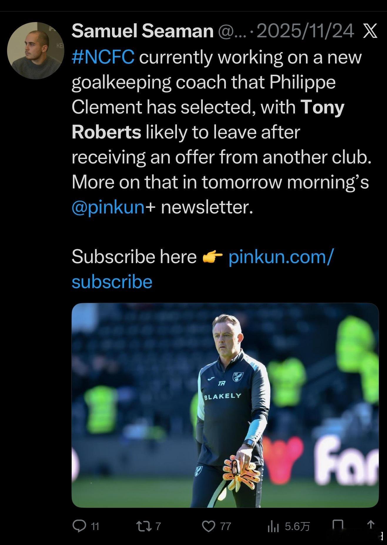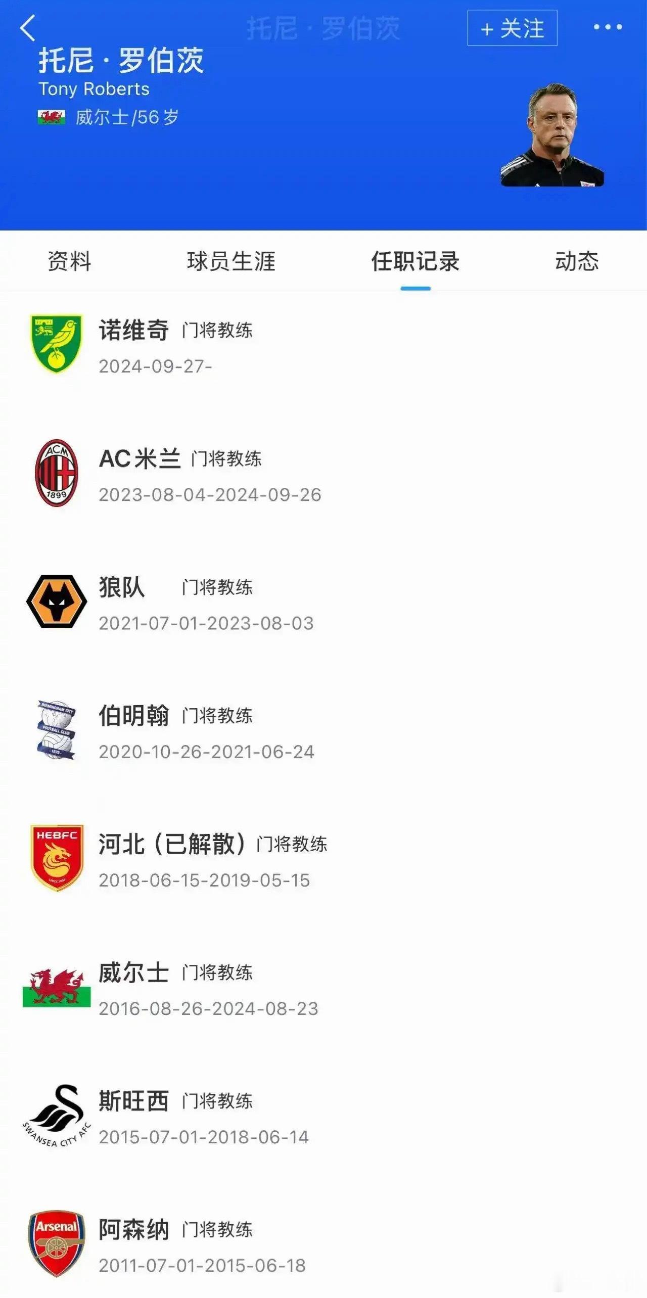 虽然还没有官宣,但申花新的门将教练托尼·罗伯茨(Tony Roberts)已经在今晨浦东机场球队出征的队伍里出现。上一条微博里,有球迷希望能稍微介绍一下这位新的门将教练。图二是托尼·罗伯茨年轻时作为女王公园巡游者队( QPR )门将时比赛的照片。1987 年到 1998 年他在这里效力。图三是当年威尔士队合影,他的队友中有我们熟悉的伊恩·拉什和吉格斯等。托尼·罗伯茨作为门将教练,从2008开始担任阿森纳U18青年队门将教练,2011年夏天进入阿森纳一线队教练组。2015年他转投另一家英超球队斯旺西,2016 年也开始兼任威尔士国家队守门员教练。2018 年6 月,前威尔士队主教练科尔曼执教中超华夏幸福,托尼·罗伯茨跟随他一同前来。 2019 赛季联赛第 8 轮,20岁的鲍亚雄完成中超第一次首发登场,不巧的是,小鲍连续首发的两场比赛华夏都输掉比赛,科尔曼也在这两场输球后遭遇下课。谢峰上任后,鲍亚雄再次回归替补,一直到赛季结束再未获得首发。这次加盟申花,因为鲍亚雄已经转会云南,所以这对师徒也擦肩而过,未能在申花再续前缘。 回到英国后,罗伯茨先后执教伯明翰和狼队,2023年8月,他成为意甲豪门AC米兰队守门员教练。按照英国媒体报道,2025 年 11 月托尼·罗伯茨已经决定离开英冠诺维奇俱乐部,要加盟一支新的球队。申花应该是去年 11 月已经以他达成合作意向。以上就是托尼·罗伯茨大概的执教履历和介绍,希望他的到来能为申花的门将提高水平带来帮助。上海申花