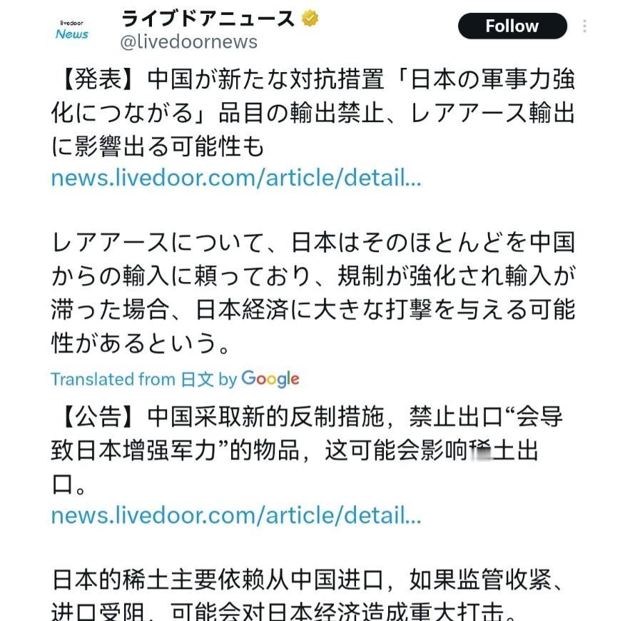 没想到日本反应情绪如此之大!在我们严格管控军民两用物资对日本进行反制之后,日本国内情绪非常激动。有日本网友就说,这样的管制措施比当年欧洲对付中国的瓦森纳协议管制还要严格。中国对日本禁运的军民两用商品,目录就列了一百多页。有人就表示,中国这是正式宣告,要么高市早苗收回她关于台湾的讲话,要么高市下台,中日关系没可能改善。 这并非高市早苗首次发表类似言论,从2025年11月开始,她就屡次在台湾问题上进行挑衅,中方也多次发出了严正警告,但日方显然没有听进去。 面对这种屡教不改的挑衅,我们必须做出坚决回应。 日本外务省在公告发布几小时后就紧急提出“强烈抗议”,其亚洲大洋洲局长金井正彰向我驻日使馆方面表示,此举“绝对不可接受,令人深感遗憾”,并声称这严重偏离了所谓的“国际惯例”,要求我们立即撤回措施。 我们的管制是精准的、有针对性的,目标直指日本的军事野心,并不影响正常的民用贸易。 将我们基于自身法律、为反制他国挑衅而采取的精准防御性措施,与一个充满冷战思维、具有明显排他性和歧视性的多边出口管制机制相提并论,本身就是一种混淆视听。 根据中国2026年度的“两用物项和技术进出口授权管理目录”,受管制的清单长达1005项,涵盖了稀土、特种化学品、无人机、先进通信技术、特殊合金、核能材料等几乎所有高精尖领域。 日本的高端制造业,特别是汽车和电子产业,对稀土有很强的依赖性,中国曾在2010年的中日争端中限制过对日稀土出口,其效果日本至今记忆犹新。 掌握全球供应链上游的关键技术和核心资源,是我们在大国博弈中何等重要的底气和筹码。 这次精准、合法、有力的反制,不仅打在了日本的痛处,也向全世界展示了我们捍卫国家利益的决心和能力。 个人观点,仅供参考!