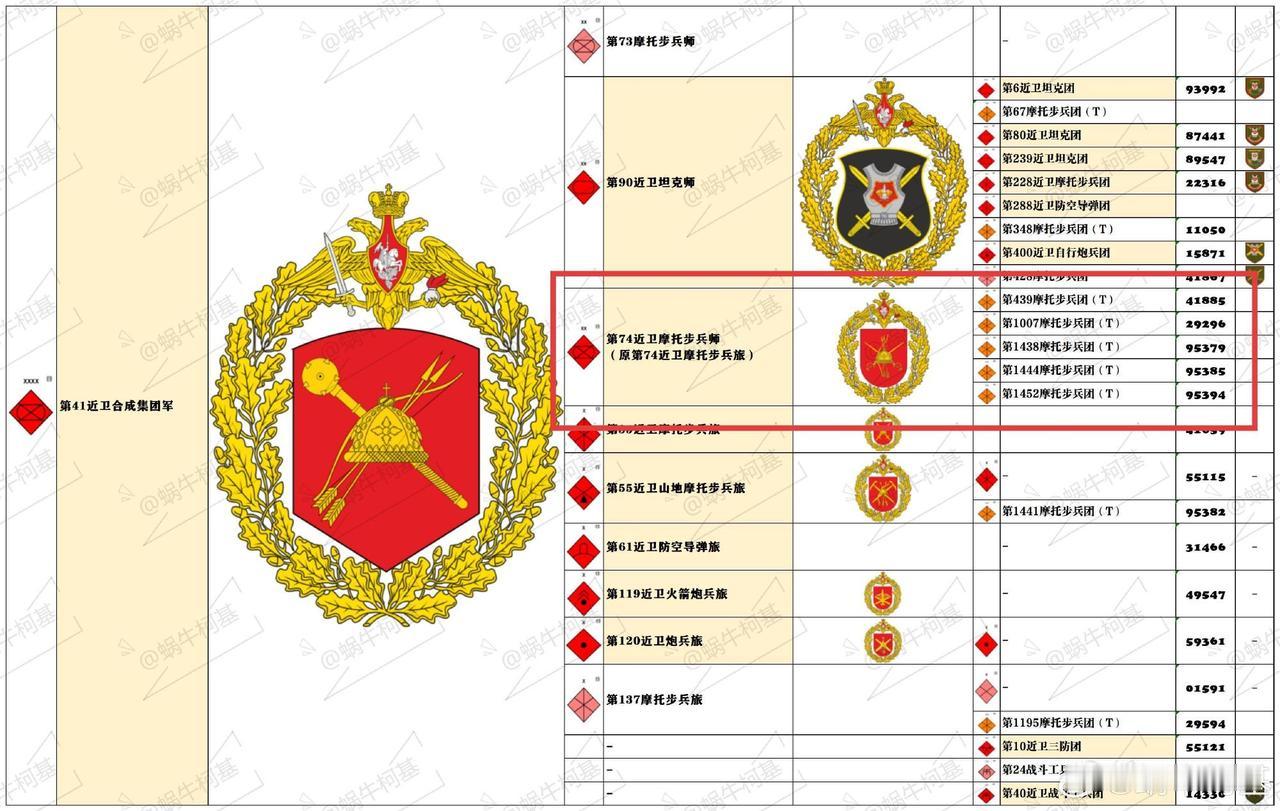 俄军中部军区第41集团军的第74独立近卫摩步旅正式改编为第74近卫摩步师,已知其下辖第1007、1438和1444摩步团,从番号看这三个摩步团都是动员团,而根据之前的情况来看,俄军第439摩步团和第1455摩步团长期配合第74独立近卫摩步旅行动,未来也极有可能纳入其编制。