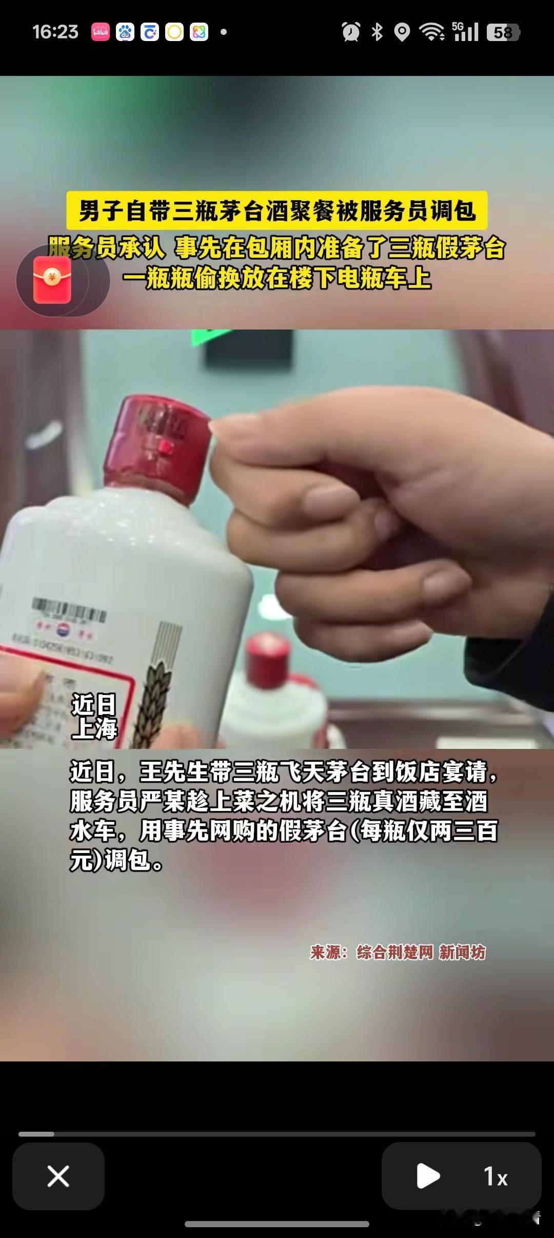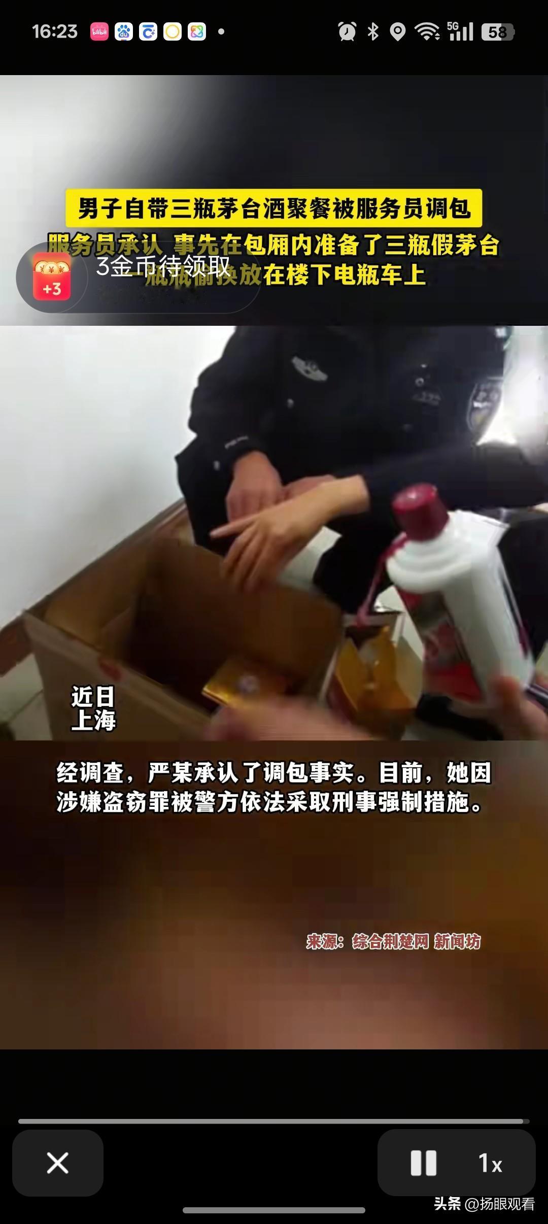 自带茅台聚餐竟被服务员调包! 近日,上海王先生带3瓶飞天茅台去饭店宴请,差点被偷梁换的柱了。 服务员严某趁上菜空隙,把真茅台藏进酒水车,换成网购的假酒,每瓶仅两三百元。更离谱的是,她提前把假酒藏在包厢,换完真酒就转移到楼下电瓶车上。 幸好王先生开席前留了个心眼,核对生产日期、批次时发现不对劲,连酒温都有差异!他当场报警,严某对调包事实供认不讳,目前因涉嫌盗窃罪被采取刑事强制措施。 ✅ 自带名贵酒水避雷指南 1. 开瓶前核对瓶身信息:生产日期、批次、防伪码一个别漏 2. 全程盯紧酒水,别让它离开视线 3. 发现异常立刻保留证据报警 这年头吃顿饭都要这么提心吊胆,真的太离谱了!