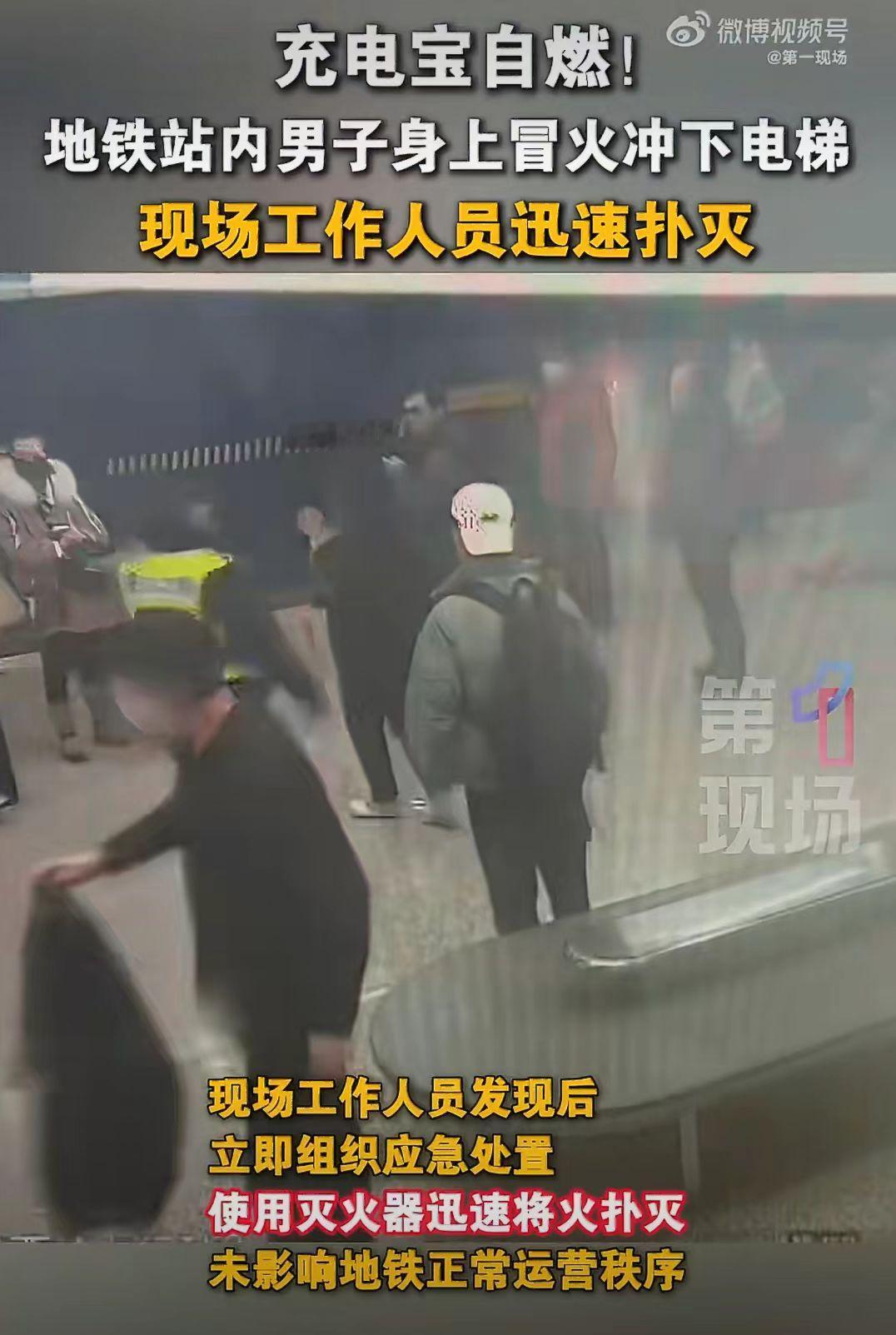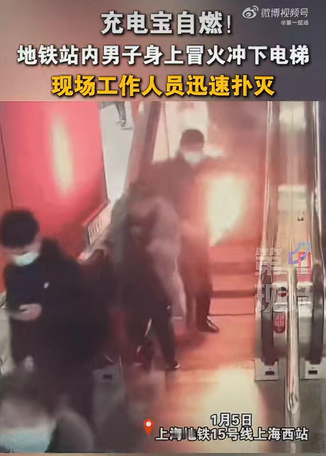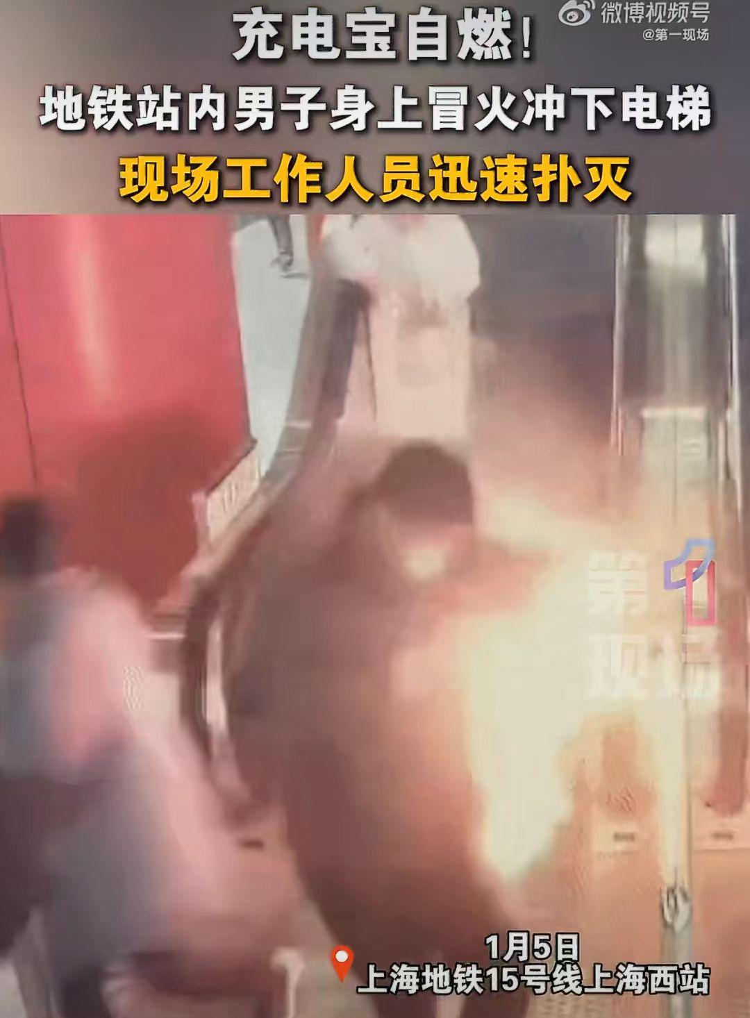 上海地铁站一个男子随身携带的充电宝突然自燃了, 身上衣服迅速烧着了,衣服上都是