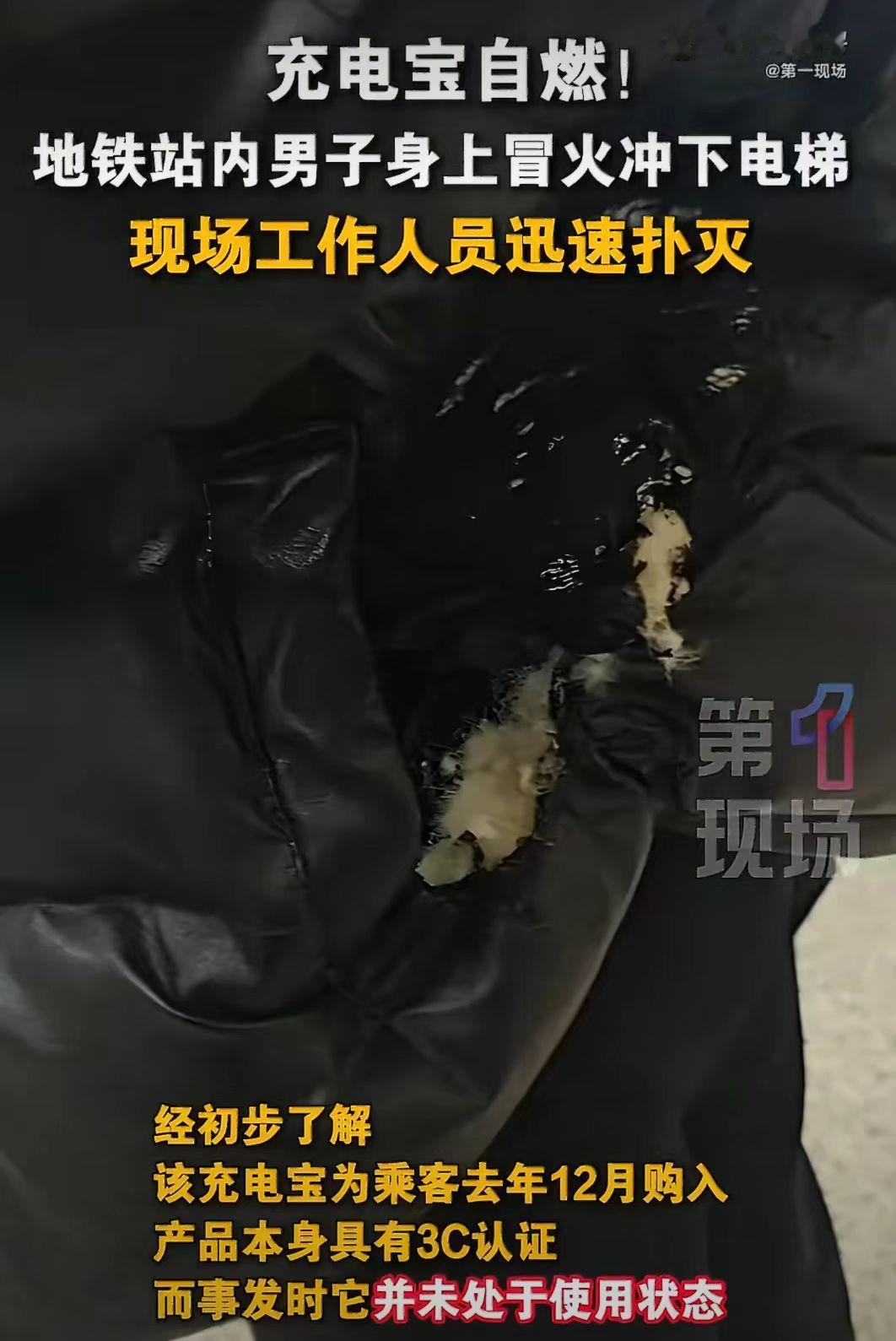 上海地铁站一个男子随身携带的充电宝突然自燃了, 身上衣服迅速烧着了,衣服上都是明火,地铁工作人员连忙用灭火器把火给灭了, 还好穿的厚,要不然肯定要烧伤了。 这个充电宝买了还没有一个月,12月买的,还是在没有充电的情况下自燃的,太吓人了。 现在年轻可以说手机不离手,充电宝就是一个移动充电器,理所当然的也离不开充电宝,而充电宝在短路的情况下,2分钟内就能自燃,很容易发生火灾。 坐飞机坐车时,一定要注意充电宝不要放到行李箱里,充电宝在重物挤压下很容易起火。 夏天时,充电宝千万不要放在车内,车内的高温也会让充电宝内电解质分解,很容易起火自燃。 而且充电宝是个消耗品,也是有年限的,到了使用年限,及时更换,避免风险。 充电宝爆炸 充电宝安全危机 充电宝故障