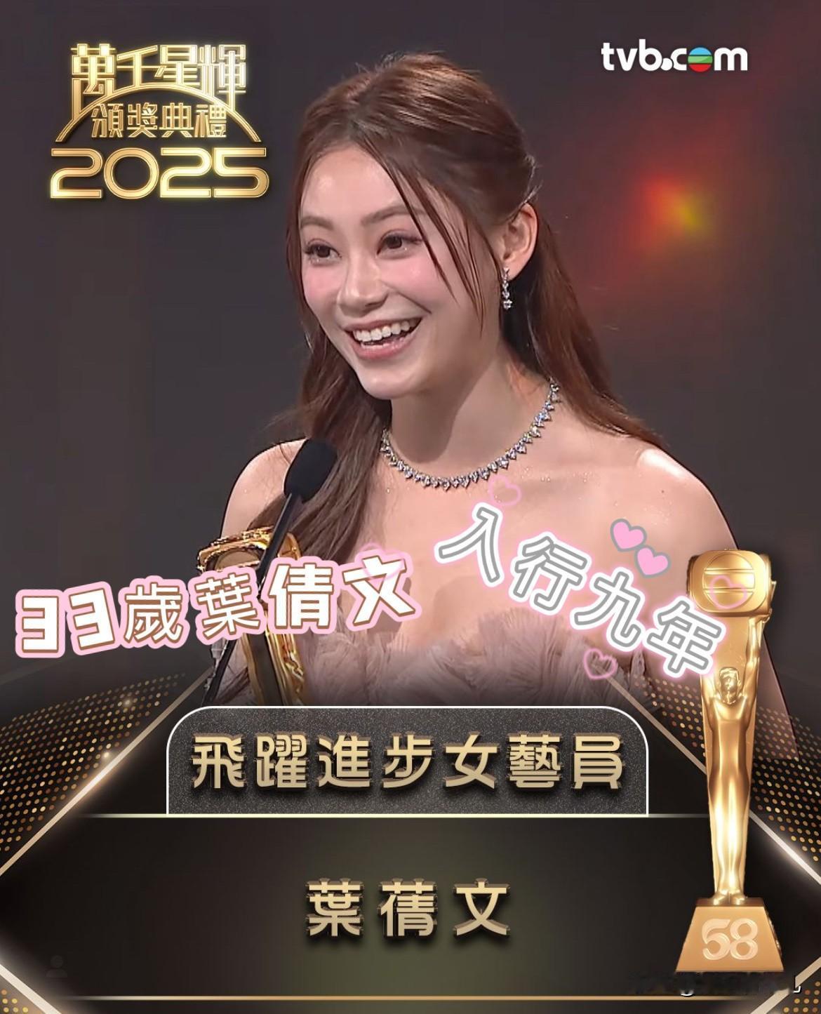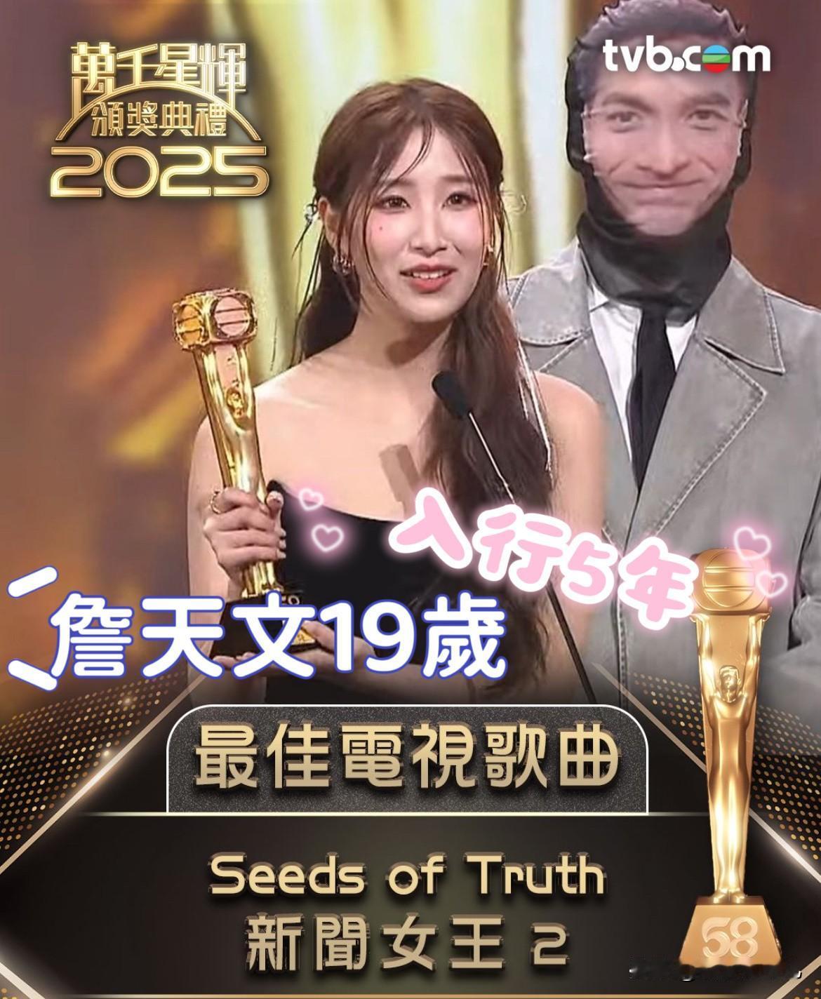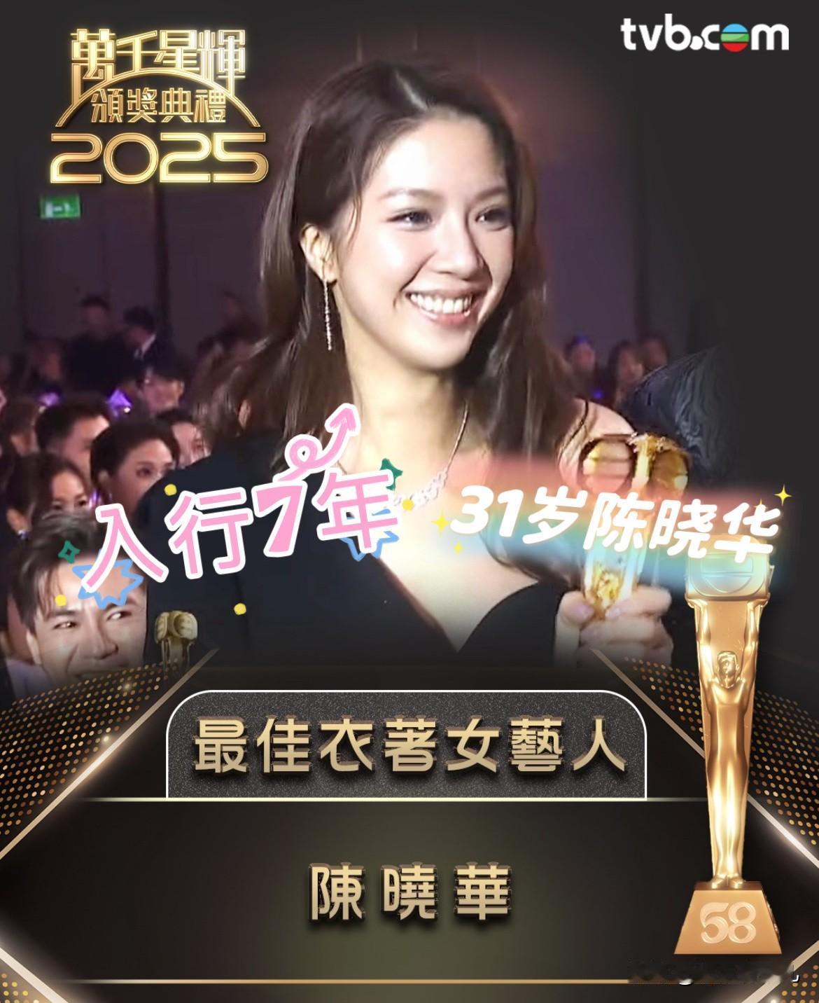 万千星辉颁奖典礼2025,今年的主题是【贪新不忘旧】,获奖名单出炉,有新人及旧人,部分荣获得奖名单有: 1. 30岁倪嘉雯荣获《最佳新人》,凭【新闻女王2】饰演的冼蔓芝,入行5年。 2. 37岁何广沛荣获《最佳男配角》,凭【新闻女王2】饰演的潘志傲,入行13年。 3. 52岁车婉婉荣获《最佳女主持》,凭【中年好声音3及4】,入行33年首次获奖。 4. 46岁林盛斌荣获《最佳男主持》,凭【女神配对计划】,入行13年首次获奖。 5. 19岁占天文凭【新闻女王2】的插曲《Seeds of Truth》,荣获主唱歌曲奖,入行5年。 6. 33岁叶倩文荣获《飞跃进步女艺员》,凭【女神配对计划】,入行9年。 7. 31岁陈晓华荣获当晚的《最佳衣着女艺员》,入行7年。 8. 35岁吴业坤荣获《飞跃进步男艺员》,凭【新闻女王2】饰演的马家明,入行15年。 9. 本年度最佳剧集,获奖作品是【新闻女王2】,亦是本年度获奖最多的作品剧集。