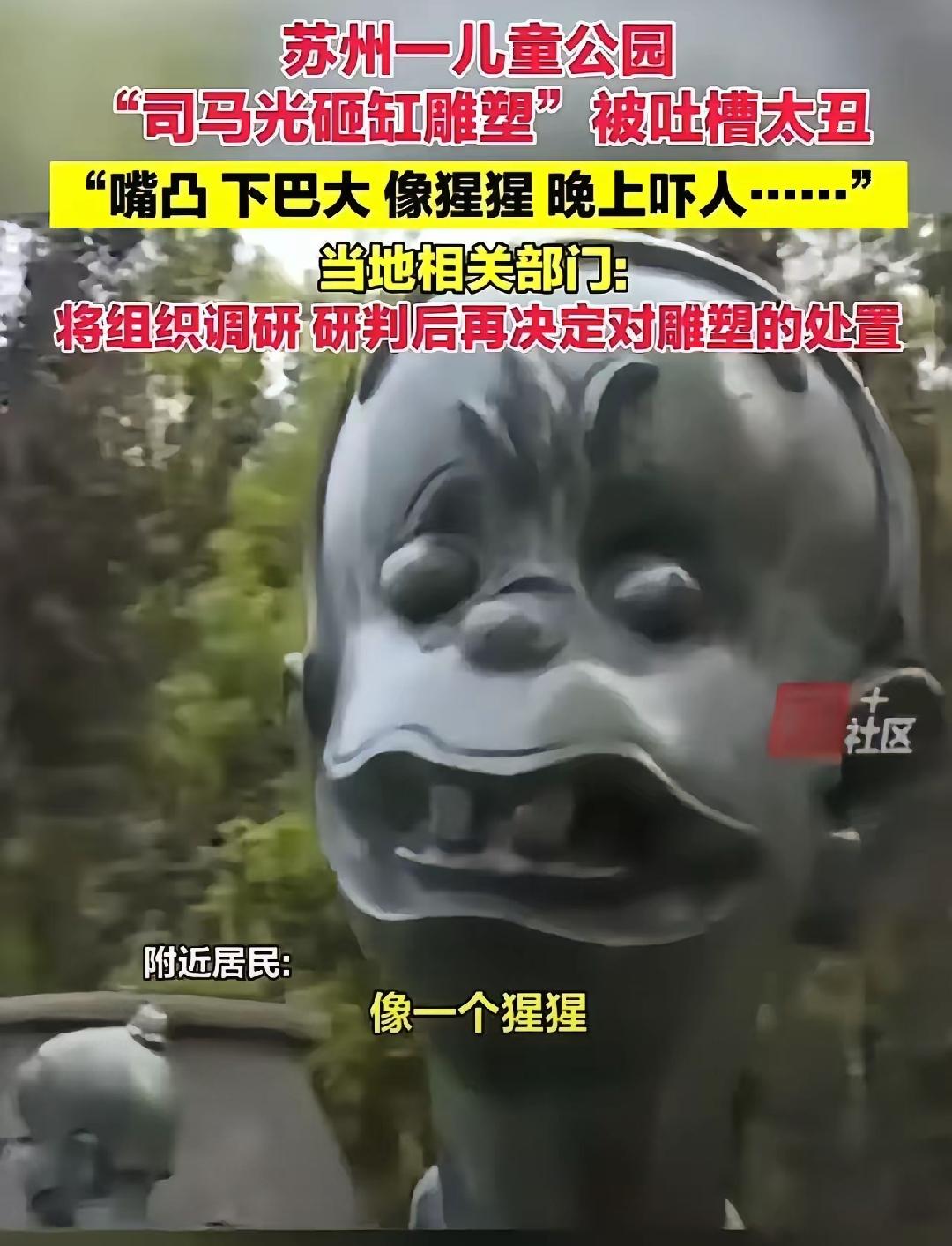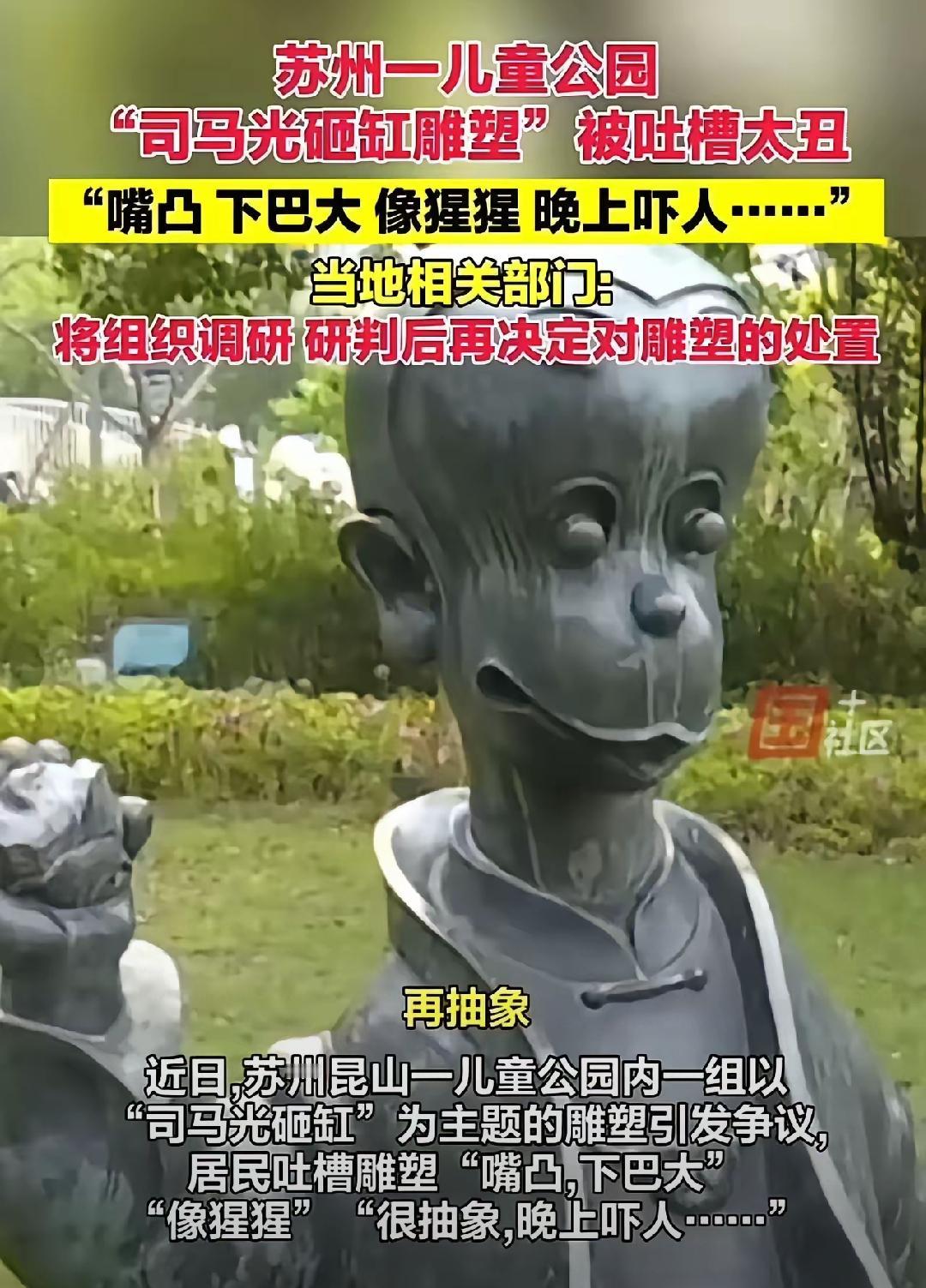 苏州昆山那组司马光砸缸雕塑,真是刷新了对“文化传承”的认知!嘴凸下巴大像猩猩,晚上看着还吓人,这哪是儿童视角,分明是脱离大众审美的自嗨! 官方说初衷是贴合孩子视角,可孩子要的是亲切可爱,不是让人犯怵的怪异形象啊。传统文化IP改编不是瞎改,创新得守住底线——不能丢了精神内核,更不能违背大众普遍审美。 公共空间的文化雕塑,承载的是启蒙意义,不是创作者炫技的工具。连基本的辨识度和美感都没有,怎么让孩子理解司马光的机智勇敢? 真不是大家上纲上线,而是怕这种“丑化式创新”多了,文化根基都被带偏。你觉得这种雕塑该直接整改,还是再调研调整?