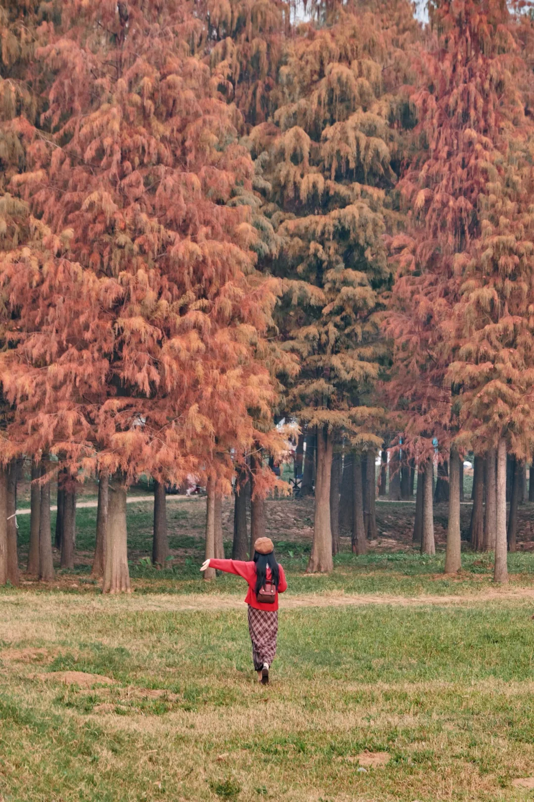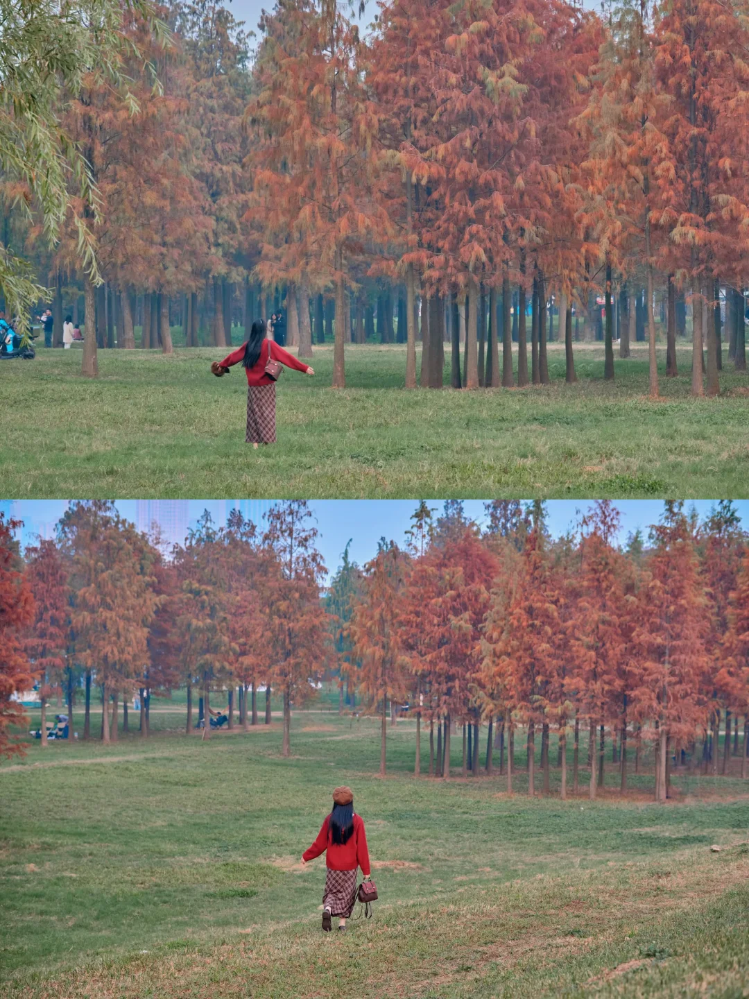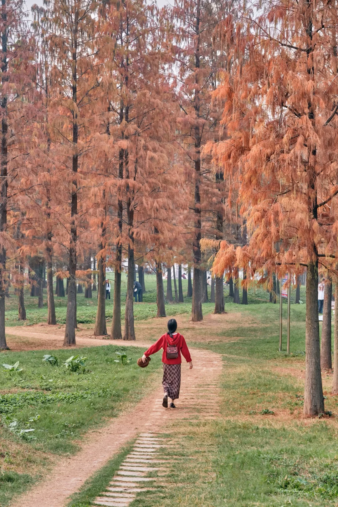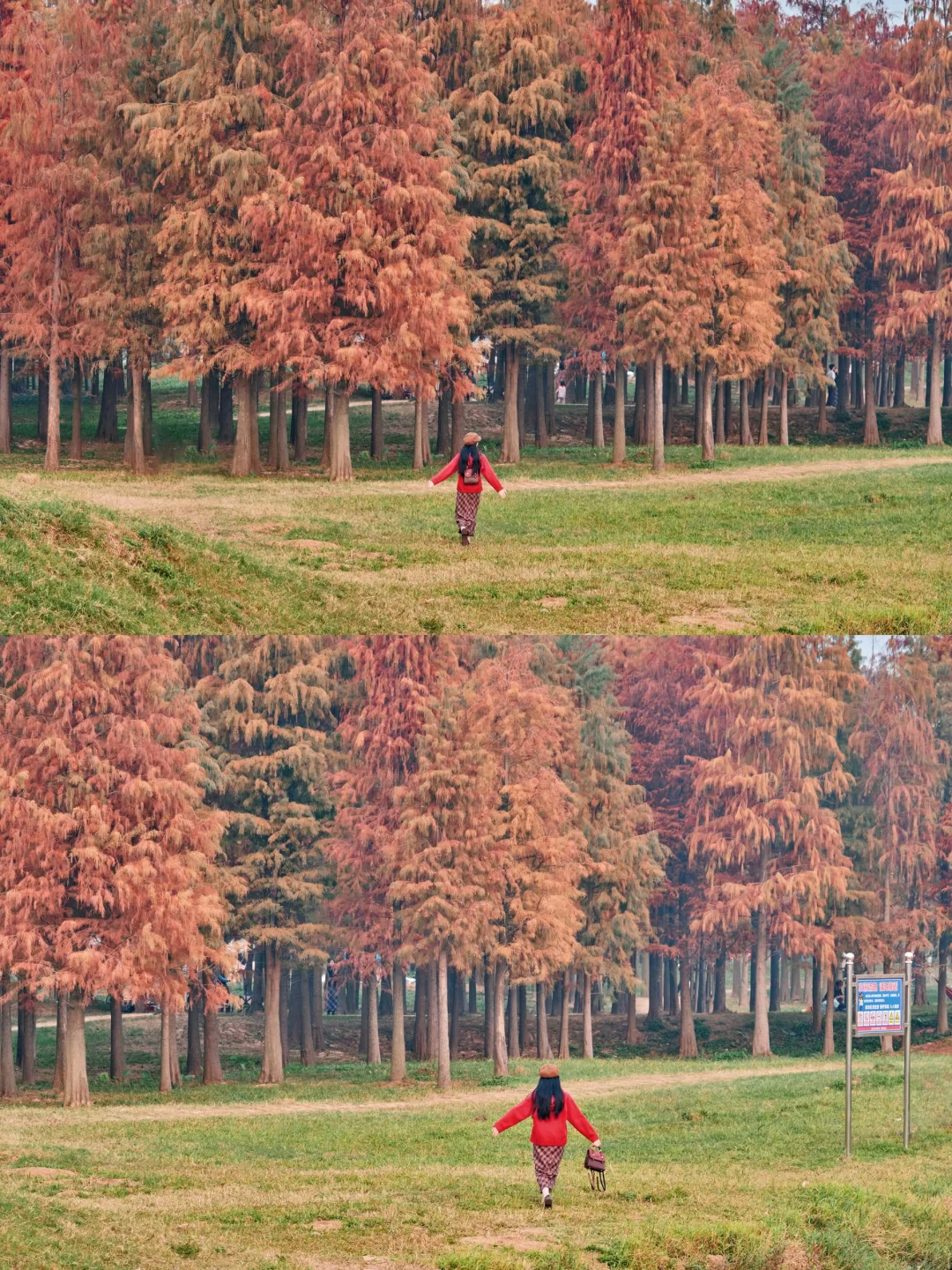 成片的落羽杉林沿江岸铺开🌲🌲蜿蜒的森林小径、开阔的大草坪🏞️🏞️还有倒映着树影的宁静湖泊