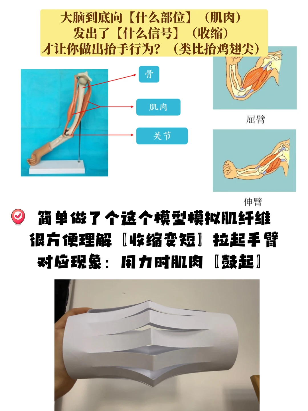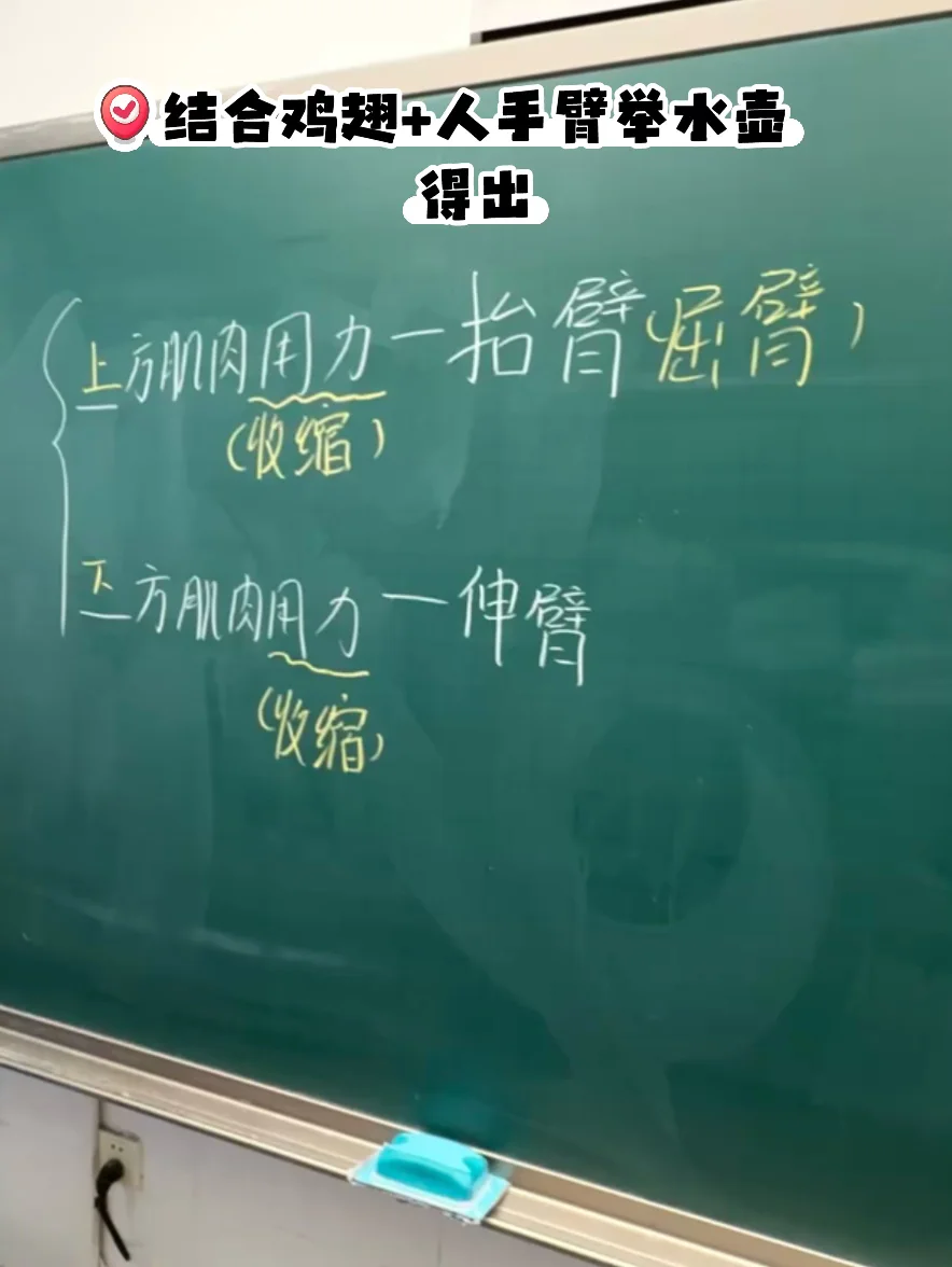 辅助解释:大臂肌肉通过肌腱连接小臂骨骼,所以大臂上方肌肉收缩可以【拉起】小臂