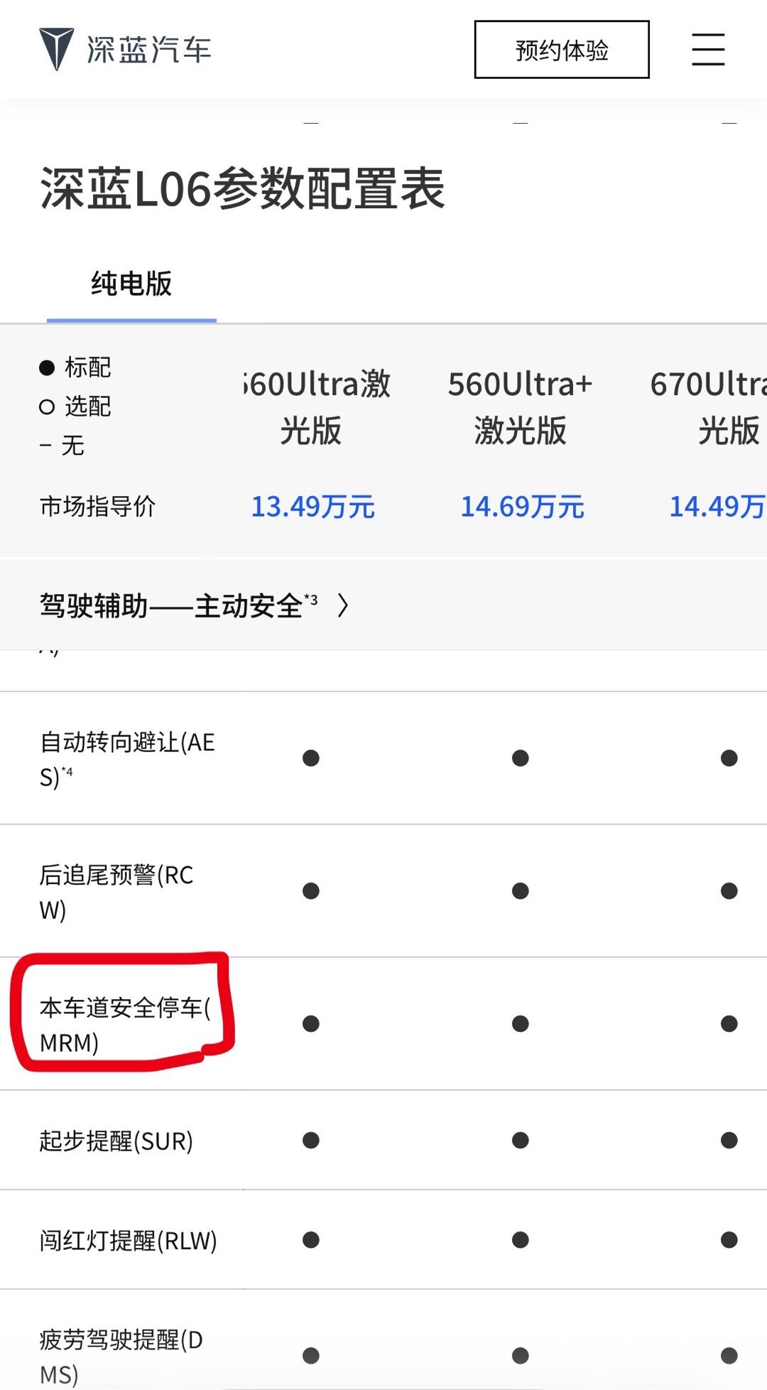 深蓝L06的配置表里已经出现L3相关的配置项MRM了。和L2级的驾驶员失能辅助不同有所不同,MRM指的是L3情况下驾驶员对接管请求无响应或车辆系统发生严重故障时,MRM将执行完整的DDT并使车辆安全停止。一般MRM运行时间为一分钟。