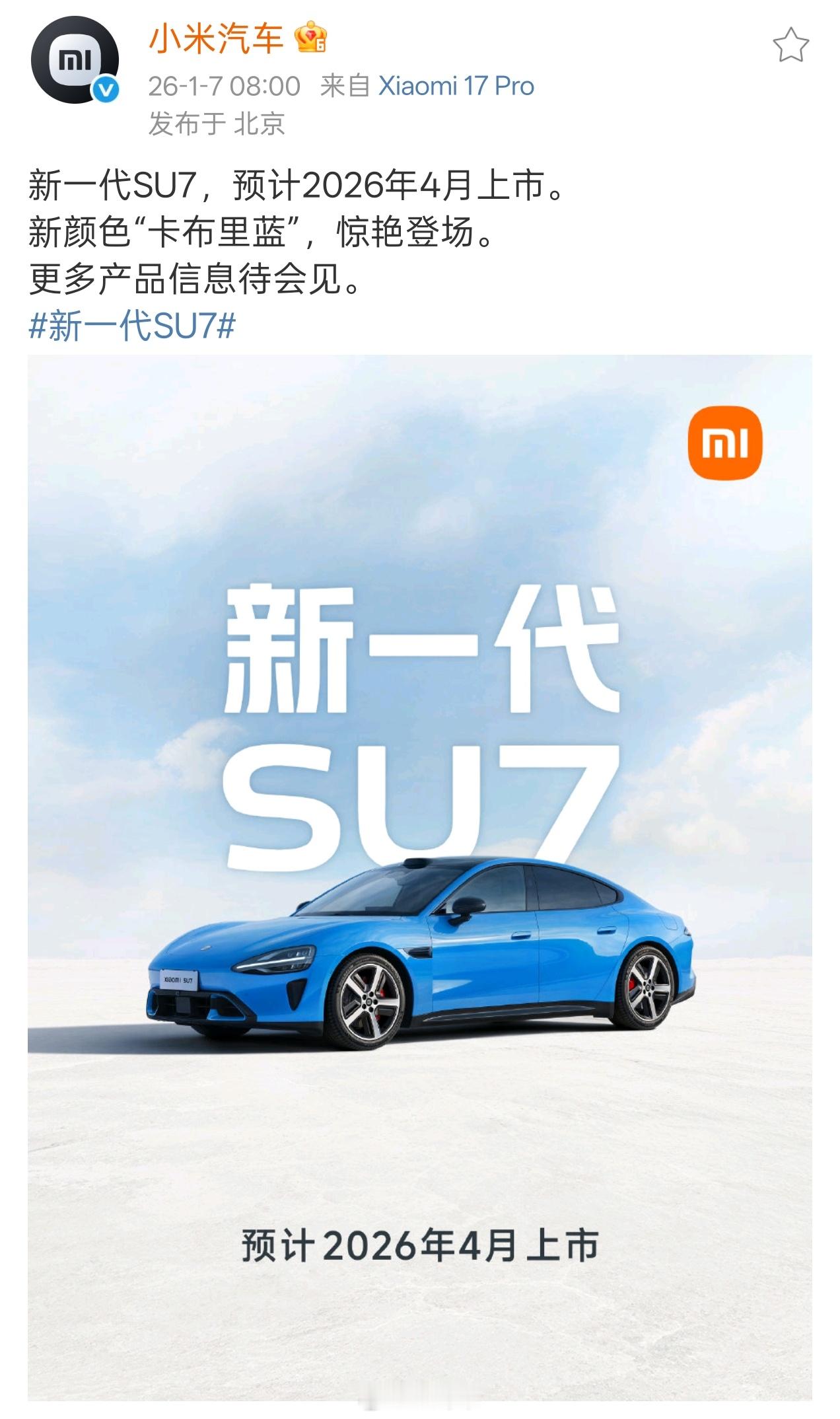 小米新一代SU7全新配色卡布里蓝哇塞~小米新一代SU7的卡布里蓝也太戳我了!这颜色名就很有画面感,这里我简单的唠叨两句,它是源自意大利卡布里岛的蓝洞,那种深邃又纯净的蓝,果然小米的颜色审美从没让人失望,之前的海湾蓝就圈粉无数,这次大概率又要火成爆款。有人说造型没咋变不像换代?SU7造型很成功,真的没必要硬换。这次小米换代诚意十足,提前三个月停售老款,避开传统车企清库存的套路,完全不背刺老用户,这份贴心真的难得。坐等4月上市,毕竟上一代驾控和销量都在线,新一代还加了新配色和技术升级,这波估计又要大热~