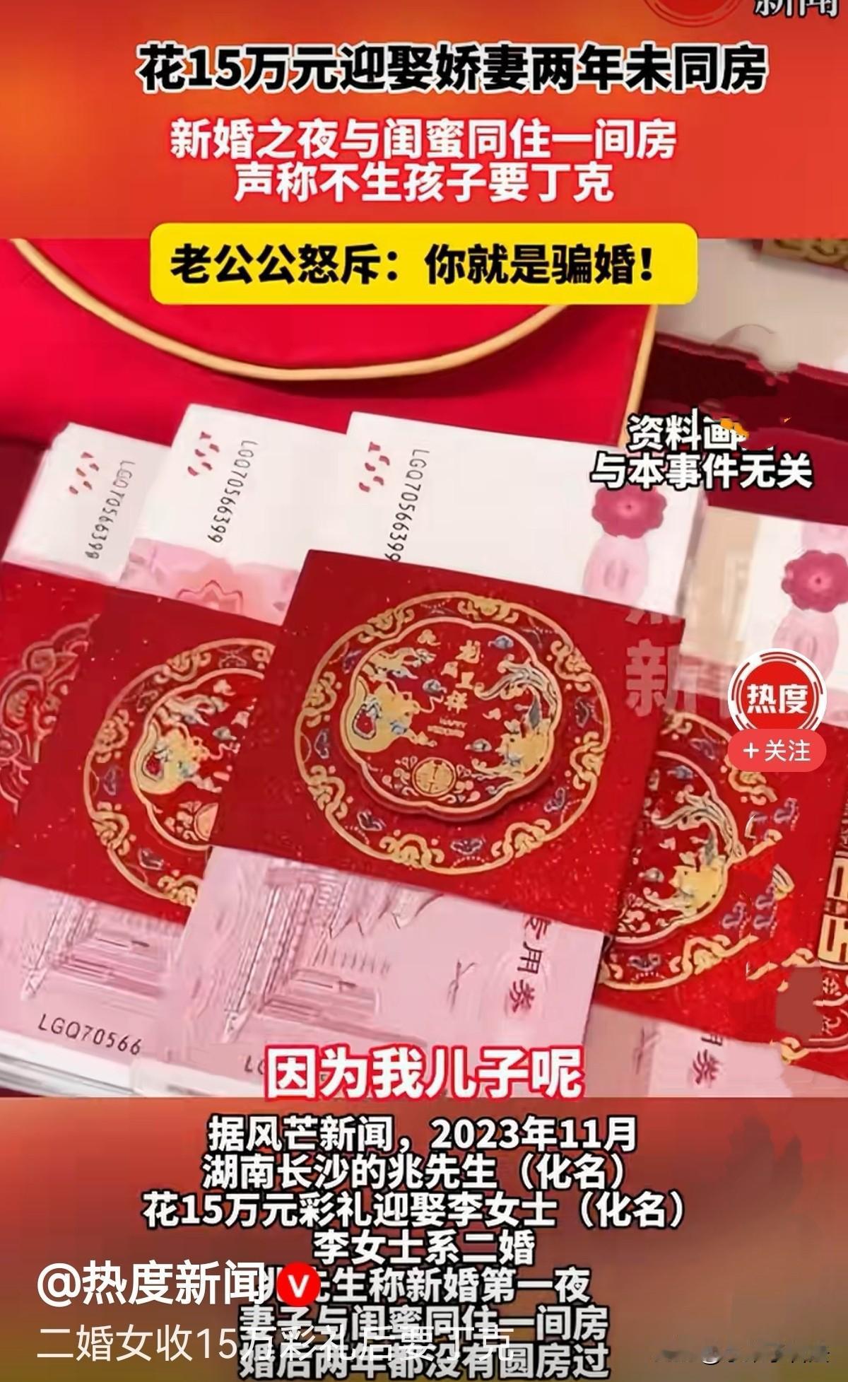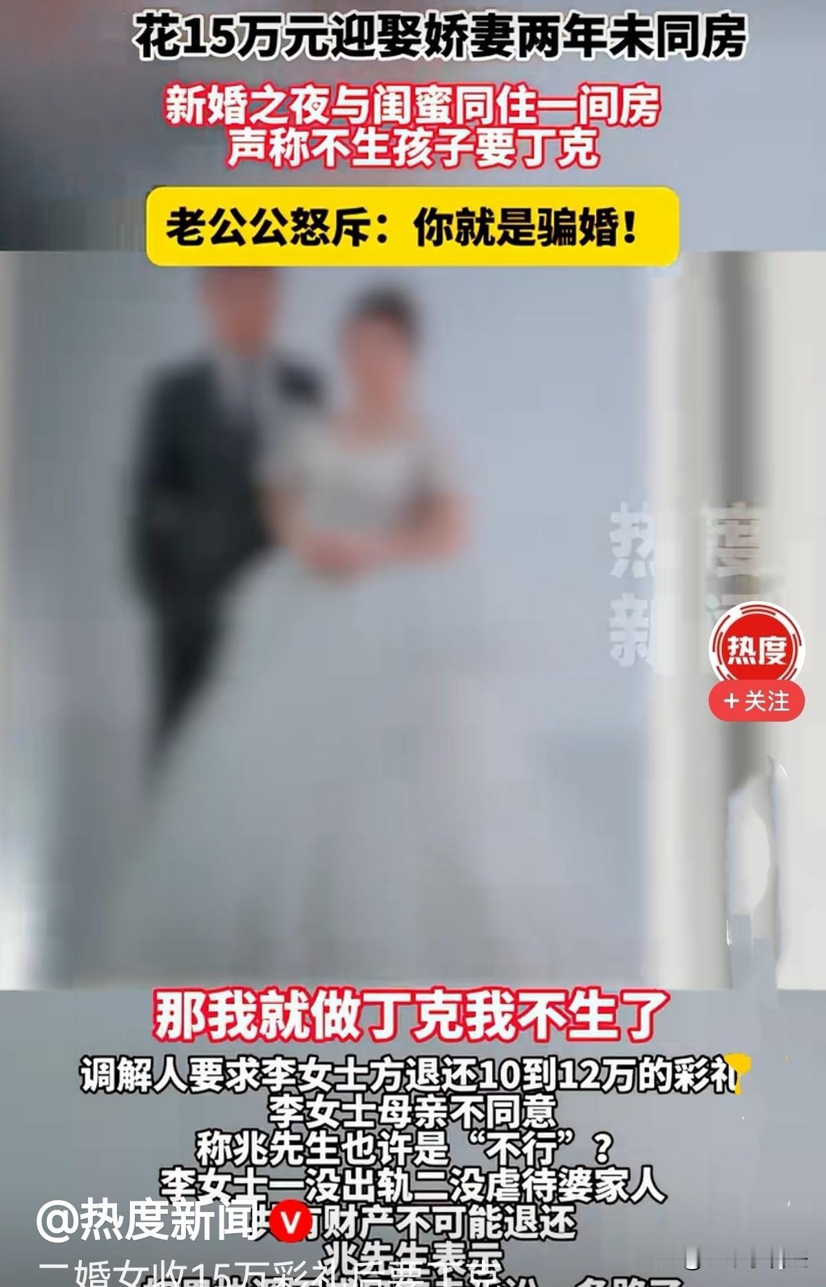 湖南长沙,男子与二婚女子谈恋爱,父母不同意,可看儿子中意,想着再婚的应更明事理,就答应了,谁知女子要8.8万彩礼加五金和衣服钱全变现共15万才嫁。男子母亲当面沟通给12万,女子一分不让。她跟男子说一定嫁给他再生个孩子。男方凑够15万结了婚。万没想到,结婚当晚,女子竟和闺蜜住一起。结婚两年未与他同住。男方父母催她生孩子,女子说她丁克不生了!老两口气坏了:你真要做丁克,就不要祸害人!而女子接下来说的话把他们气炸了! “她就是骗婚!当初说好了要生孩子,现在揣着15万彩礼,说丁克就丁克,这不是坑人吗?”老兆提起儿媳李女士,气得胸口发闷,嗓门都拔高了八度。 2023年,小兆对父母说他与李女士谈恋爱了,对方准备与他结婚。 老兆夫妇高兴坏了,儿子性格偏内向,少言寡语的,能自己谈朋友确实出乎他们的预料。 可当小兆说李女士离过一次婚,老兆夫妇不同意了,好好的小伙子怎么找二婚的?担心有很多麻烦。 优柔寡断的小兆把父母的意思说给李女士,可李女士拉着小兆说一定嫁给他,就想找个踏实人,再生个孩子,组建一个安稳的家。 兆父母觉得李女士真心对儿子,想着再婚肯定会更明事理,又答应给他们生孙子,就同意了他俩的婚事。 可谈婚论嫁时,李女士却说要88000元彩礼、五金加衣服等这价成现金一共15万才能结婚。 老兆倒吸一口凉气,家里本就不宽裕,15万也太多了吧?于是,他让老伴出面和李女士商量,能不能少点,给12万行不行? 谁料李女士态度强硬:不行,必须15万现金! 小兆早就被李女士哄的晕头转向的,说给他生大胖儿子,他想不能因3万块钱失去一桩美满婚姻。 父母也盼着早抱孙子,也不再说什么,就东拼西凑把15万彩礼凑齐送了过去。 7月两人风风光光办了婚礼,可新婚之夜的一幕,却给了小兆当头一棒。 宾客散去,赵先生满心欢喜地准备进新房,却发现李女士早已拉着远道而来的闺蜜占了婚床,还理所当然地说自己累了,让赵先生去客房睡。 小兆性格懦弱,张了张嘴没敢反驳,只能憋着一肚子委屈,在冰冷的客房里熬了一夜。 他本以为这只是新婚夜的小插曲,可接下来的两年,更是让他彻底寒了心。 李女士搬进赵家后,始终和他分房而居,别说夫妻生活,就连日常的亲密举动都没有。 老兆夫妻俩急着抱孙子,隔三差五就旁敲侧击地催问生育计划,每次李女士都笑着打太极:不急不急,等有机会再说。 到2025年,李女士的肚子毫无动静。老兆再也沉不住气,找了个机会和李女士正面谈。 他苦口婆心地劝她:你俩早点生孩子,家里也能添点喜气,趁我们年轻帮你带。 谁知道李女士不耐烦了:我妈再婚生了个小弟弟,我得帮忙照顾,没时间生孩子。 赵老汉急了:照顾弟弟和生孩子不冲突,不影响你生孩子啊! 谁知听了这话,李女士突然翻脸了:那我就做丁克,不生了! 老兆被怼的半天没缓过神来,他本以为是儿媳故意气他,没想到几天后听到更让兆家人气愤的话,李女士说小兆根本没生育能力,这才导致两人迟迟没孩子。 老兆根本不信,当即带着儿子去医院做了全面检查,化验单上明白写着小兆生育能力一切正常。 这时,小兆才告诉父母,他与李女士结婚2年了,两人一直没同房住在一起。 老兆气得直拍大腿,他们这才彻底醒悟:李女士从一开始就没打算生孩子,所谓的盼着生娃,不过是骗走15万彩礼的幌子。 你真要做丁克,就不要祸害人!你这是骗婚!老兆气得找上门理论,要求李女士必须与儿子离婚,并退还15万彩礼。 后来调解员介入调解,提出让李女士退还10到12万彩礼,这事就算了结。 谁知李女士一脸不屑说,想的美,一分没有! 李女士的母亲拍着桌子喊:我女儿一没出轨二没虐待公婆,凭啥退钱?这钱是兆家自愿给的! 调解不欢而散,没一点结果,小兆看着人财两空的婚姻,坚定地说:这婚必须离,彩礼也必须要回来,大不了就走法律途径! 《婚姻家庭编解释(一)》第五条)规定:当事人请求返还按照习俗给付的彩礼的,如果查明属于以下情形,人民法院应当予以支持:……(二)双方办理结婚登记手续但确未共同生活;(三)婚前给付并导致给付人生活困难。 男方小兆与女方李女士已办理结婚登记,但存在以下关键事实:结婚当晚,李女士与闺蜜占婚床,要求小兆分房睡; 婚后两年始终分房而居,别说夫妻生活,就连日常的亲密举动都没有 上述事实足以证明双方虽办理结婚登记,但未形成持续、稳定的共同生活状态,符合“确未共同生活”的法定情形。 小兆家本就不宽裕,15万彩礼系东拼西凑凑齐, 男方父母曾与李女士协商给12万行不行,被拒绝后被迫支付15万,可认定为导致给付人生活困难。 法院应综合考虑双方共同生活时间长短、彩礼数额、彩礼使用情况及李女士未履行夫妻义务且无正当理由拒绝生育等因素,酌情确定返还比例。 若李女士拒绝返还,小兆可通过诉讼主张权利。 对此您怎么看?