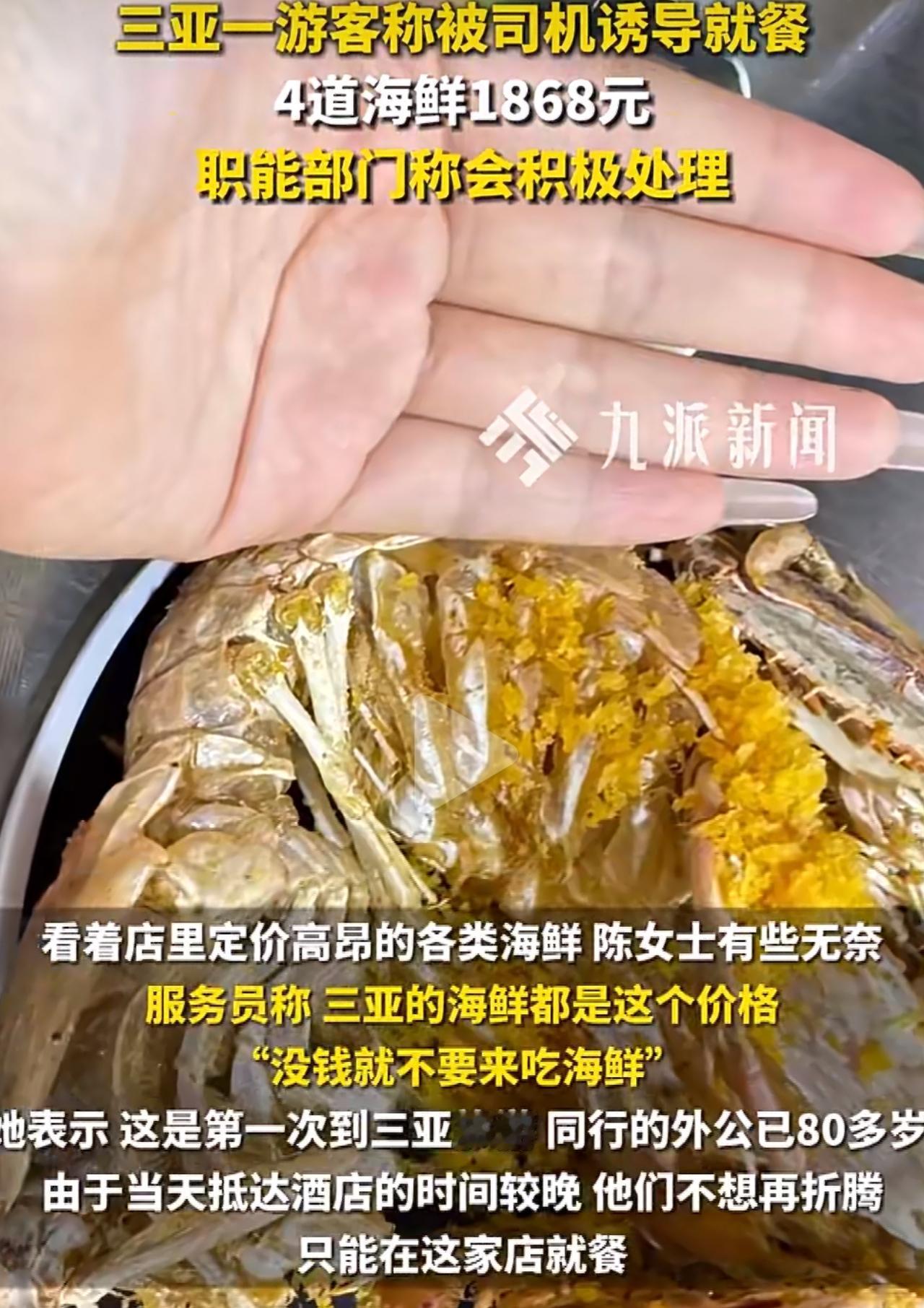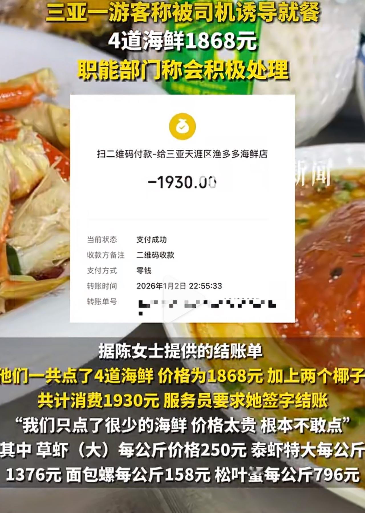 陈女士一家刚到三亚,就被酒店门口的司机以15块钱的低价车费忽悠上了车。本来是想去自己选好的海鲜店,结果司机半路突然变卦,说那家店的海鲜不新鲜,硬是把他们拉到了40分钟车程外的“渔多多海鲜店”。 进店后点了皮皮虾、蚬子等4道海鲜,结账时直接给陈女士一家整懵了——4个菜加2个椰子,居然要1930块!光泰虾就1376块钱一公斤,比三亚第一市场的价格贵了两倍还多。更过分的是,陈女士发现自己点的菜被偷偷换成了高价品种,刚提出质疑,服务员就一脸不屑地说“整个三亚都这价格”,还当众羞辱她“没钱就别吃海鲜”。 这哪里是什么正常消费,分明就是司机和餐馆勾结好的套路!之前北海、张家界也出过类似的事,都是司机拿餐馆回扣拉客,餐馆只做线下生意不上线平台,专门规避监管。陈女士向相关部门投诉后,职能部门也只是说在整治海鲜宰客,压根没给出实质处理结果。 出来旅游本来就是图个开心,谁能想到会遭这种罪?明码标价不该成为宰客的遮羞布,真心希望监管部门能彻底斩断这条灰色利益链条!也提醒大家,出门旅游千万别信那些低价拉客的司机,吃饭优先选线上能查到的正规餐厅!三亚海鲜店宰客 三亚海鲜 三亚旅游
