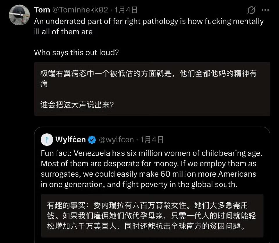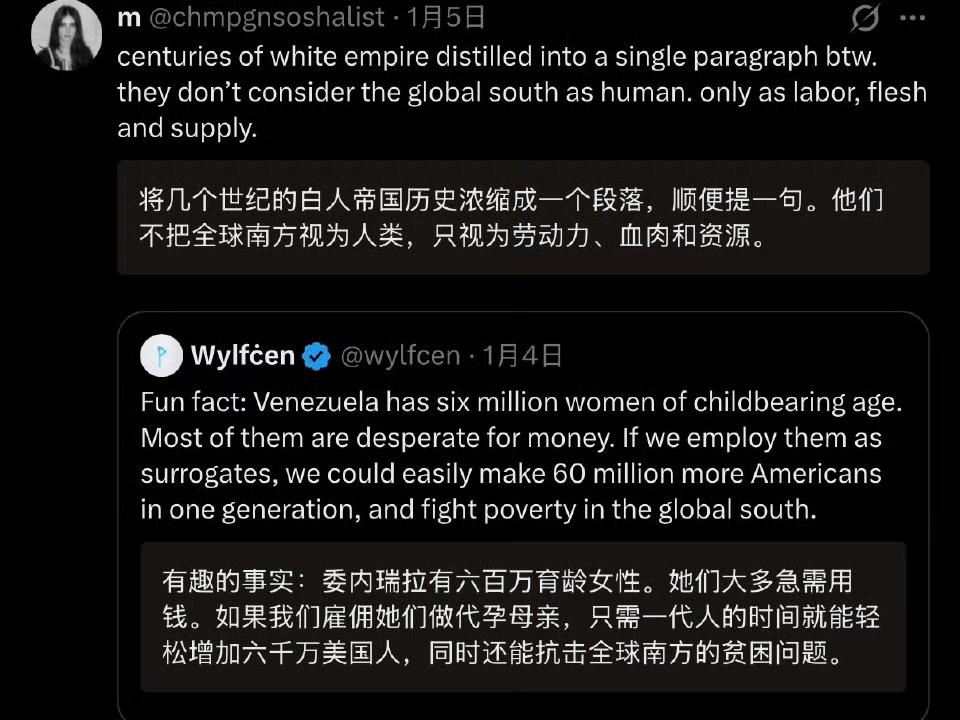 美国人讨论委内瑞拉妇女的帖子点燃了全球网民的怒火,这些美国人竟然建议让委内瑞拉妇女为美国人繁衍后代。 这些美国人声称,委内瑞拉很穷,那里的妇女需要钱,美国人可以付钱给她们,雇佣她们帮美国人生孩子,这样一来,美国的人口总量可以大幅提高,而委内瑞拉的妇女也可以摆脱贫困。 他们还把这种方式描述成帮助南方国家富裕起来的善举,实在是匪夷所思。 这些美国人的疯狂言论受到了全球网民的抨击,许多人认为美国人根本没把其他国家的人当人看,简直无耻至极。 这就是美国人的本性,也是白人的本性,一旦他们取得压倒性的优势,只会疯狂剥削全世界,只管自己快乐,哪里会考虑别人的死活。 那些从骨子里把美国树立成文明国家的人,你们还觉得美国人文明吗?