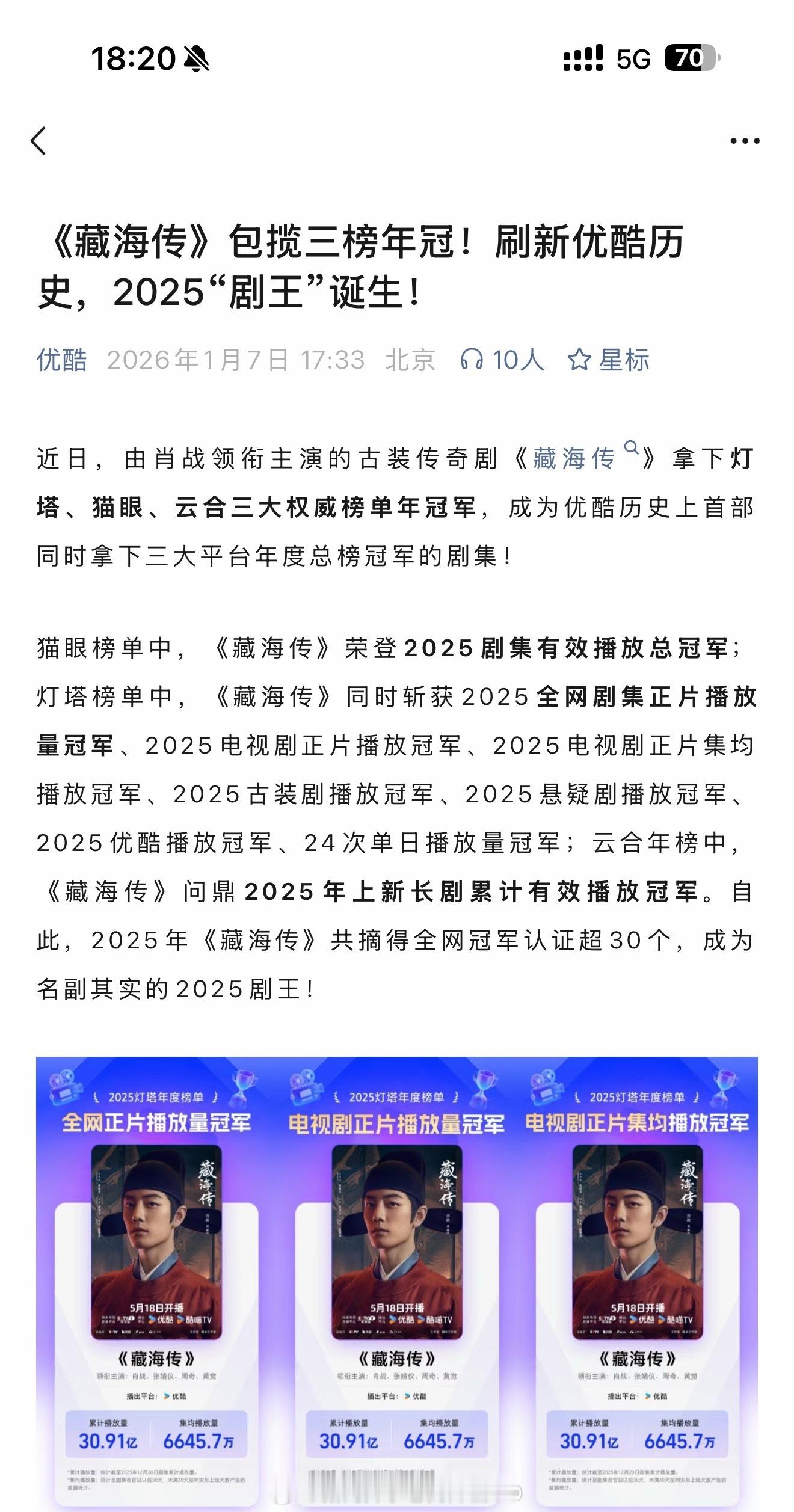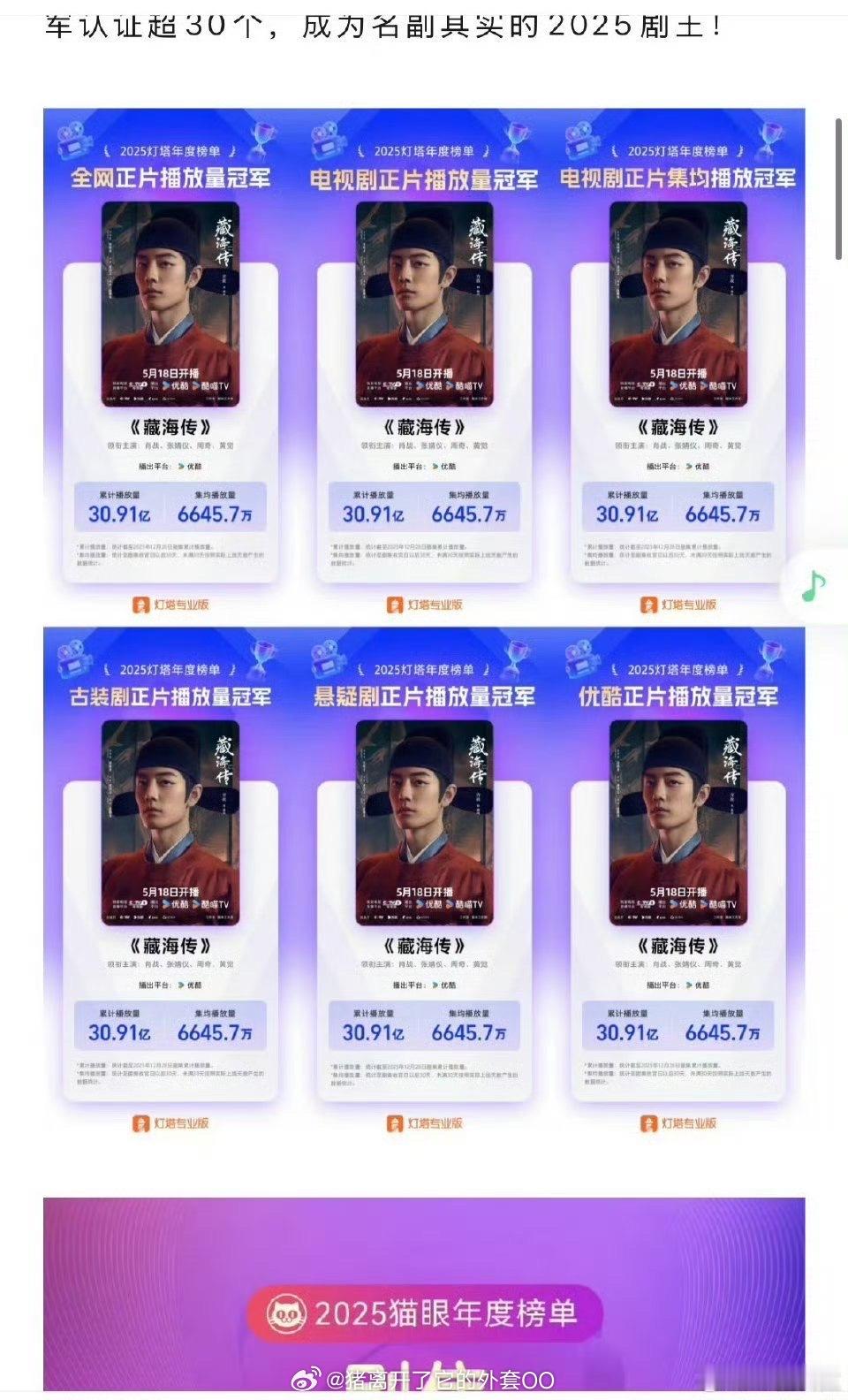 优酷官号再发战报!肖战《藏海传》包揽三榜年冠,刷新优酷历史,2025剧王实至名归!👖恨不得按个喇叭🎺通知全世界!!!把藏海传剧王刻脑门上!!