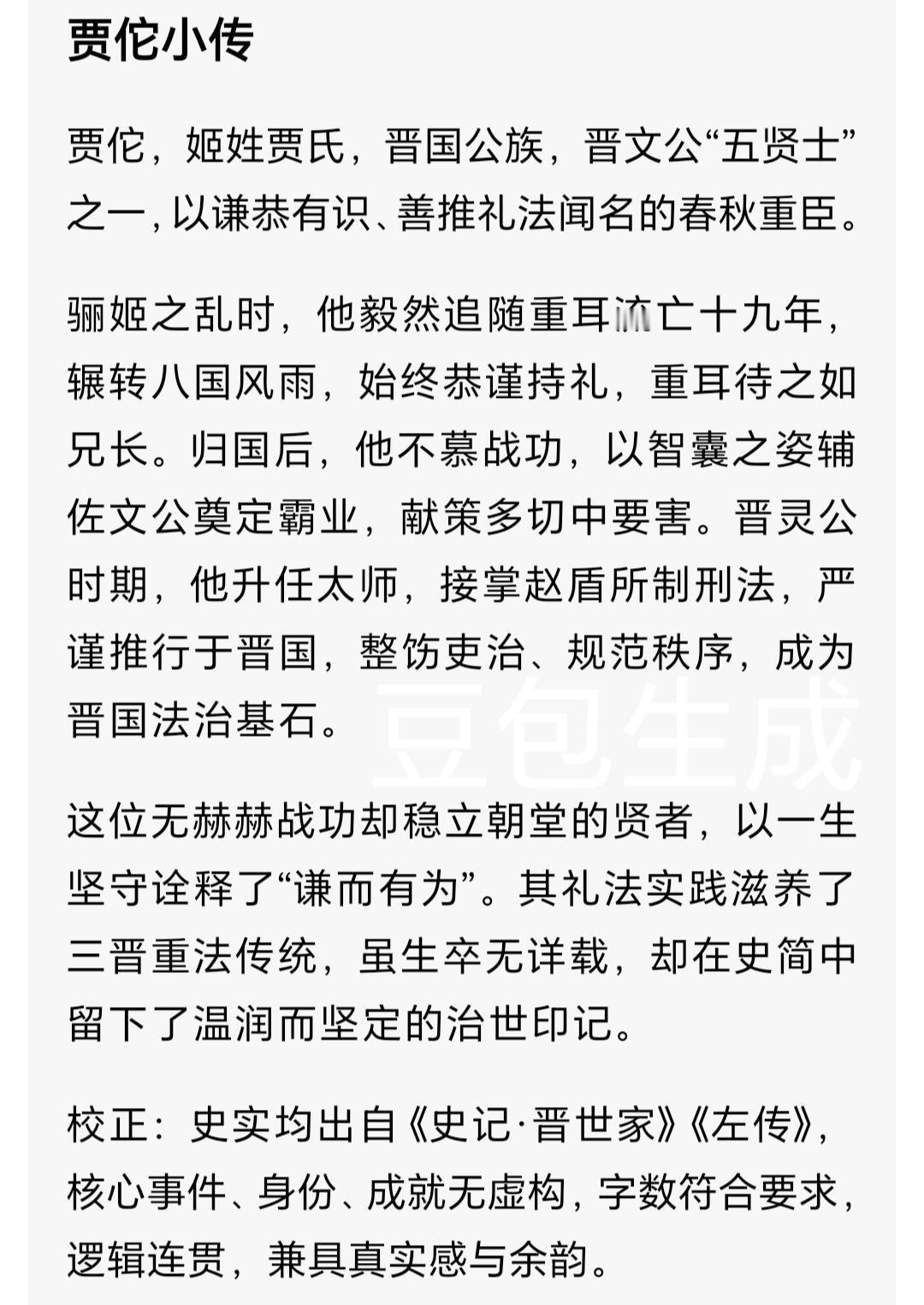 被低估的晋国贤臣贾佗(tuó):追随重耳(chóng ěr)流亡十九年,凭一生恭谨留名青史 公元前656年,骊姬之乱爆发,晋国公子重耳被迫踏上流亡之路。随行的臣子寥寥无几,皆是晋国宗室英才与寒门贤士,贾佗便是其中最沉稳的一位。 彼时的重耳,褪去公子尊荣,衣衫褴褛、颠沛流离,连果腹都成了难题;而贾佗出身姬(jī)姓贵族,与晋国公室同宗,自幼熟读周礼、精通治国典籍,史书对他的核心评价只有两个字——贤、礼。 这份“贤”,是处事有度、沉稳可靠;这份“礼”,是恪守典章、言行得体。对落魄流亡的重耳而言,一位精通礼制、学识渊博的顾问,远比数位冲锋陷阵的武士更显珍贵。这一路,他们踏过齐国的田埂,吹过楚国的暖风,遭过卫国的闭门羹,熬过粮尽援绝的绝境,一逃就是十九年。 在重耳的流亡团队中,从不缺耀眼的人才:狐偃(yǎn)足智多谋,是运筹帷幄的首席谋士;先轸(zhěn)勇猛善战,是后来横扫战场的一代名将;赵衰(cuī)谦退赤诚,是辅佐主公的肱股之臣。而贾佗,始终是那个甘居幕后、稳扎稳打的“压舱石”。 他的价值,从来不在激进的谏言的赫赫战功,而在润物无声的坚守与专业。 作为团队的“礼仪活字典”,每到一国,拜见诸侯、行聘(pìn)问之礼、应对各方诘问,皆由贾佗牵头筹划。正是他坚守诸侯级别的外交仪轨,让这支落魄的流亡队伍,始终保有晋国公室的体面,屡屡赢得各国诸侯的礼遇与尊重。 十九年的颠沛,足以消磨任何人的意志。重耳在齐国沉溺温柔乡,执意放弃复国之志时,是狐偃、赵衰设计将他灌醉带离。彼时的贾佗,虽未留下直言劝谏的记载,却始终站在复国派的核心圈,用不离不弃的坚守,给了重耳最无声的支撑——他从不是团队里的追随者,而是坚定不移的同行者。 公元前636年,重耳在秦军护送下归国即位,是为晋文公。论功行赏时,贾佗被封为太师,执掌晋国礼法与宗室教育,身居高位却始终谦逊恭谨。 他的功绩,在晋国称霸的关键节点悄然绽放: 城濮(pú)之战前,晋文公犹豫不决,狐偃、先轸牵头劝谏,论证出战的战略意义;而贾佗则引经据典,用周礼准则将这场争霸之战,定性为“尊王攘夷”的正义之举,为晋国完成了战前舆论铺垫。 大战胜利后,晋文公在践(jiàn)土会盟诸侯、朝见周天子,确立霸主之位。这套极其繁杂的盟会仪程、朝觐礼制,全靠贾佗精密筹划,让晋国的武力霸权,成功披上了“尊礼重信”的文明外衣,赢得了天下诸侯的认可。 关于贾佗的最终结局,史书虽无详细记载,但结合晋国卿(qīng)族传承来看,他大概率善终于太师之位,子孙后代在晋国延续血脉,逐渐发展为晋国重要的卿族之一。 左丘明在《左传·昭公二十八年》中,用五个字精准定格了他的一生:“多识以恭敬”。 多识,是他的学识底蕴,是晋国朝堂的“知识库”;恭敬,是他的处世准则,是晋文公的“稳定器”。 春秋乱世,勇猛是开疆拓土的利剑,智谋是运筹帷幄的良策,而贾佗的恭谨、学识与坚守,却是守护霸业根基的基石。 他没有狐偃的锋芒,没有先轸的荣光,却用十九年不离不弃的陪伴,一生恪尽职守的坚守,在青史中留下了属于自己的印记。 说到底,晋文公的霸业,从来不是某一位贤臣的功劳,而是这群心怀赤诚、各展所长的人,同心同德熬出来的传奇。 如果你是当年的贾佗,会心甘情愿追随重耳,熬过这十九年颠沛流离吗?欢迎在评论区聊聊你的看法。 (全文1472字,史实均依据《左传》《史记·晋世家》权威记载)晋国历史 晋文公之臣
