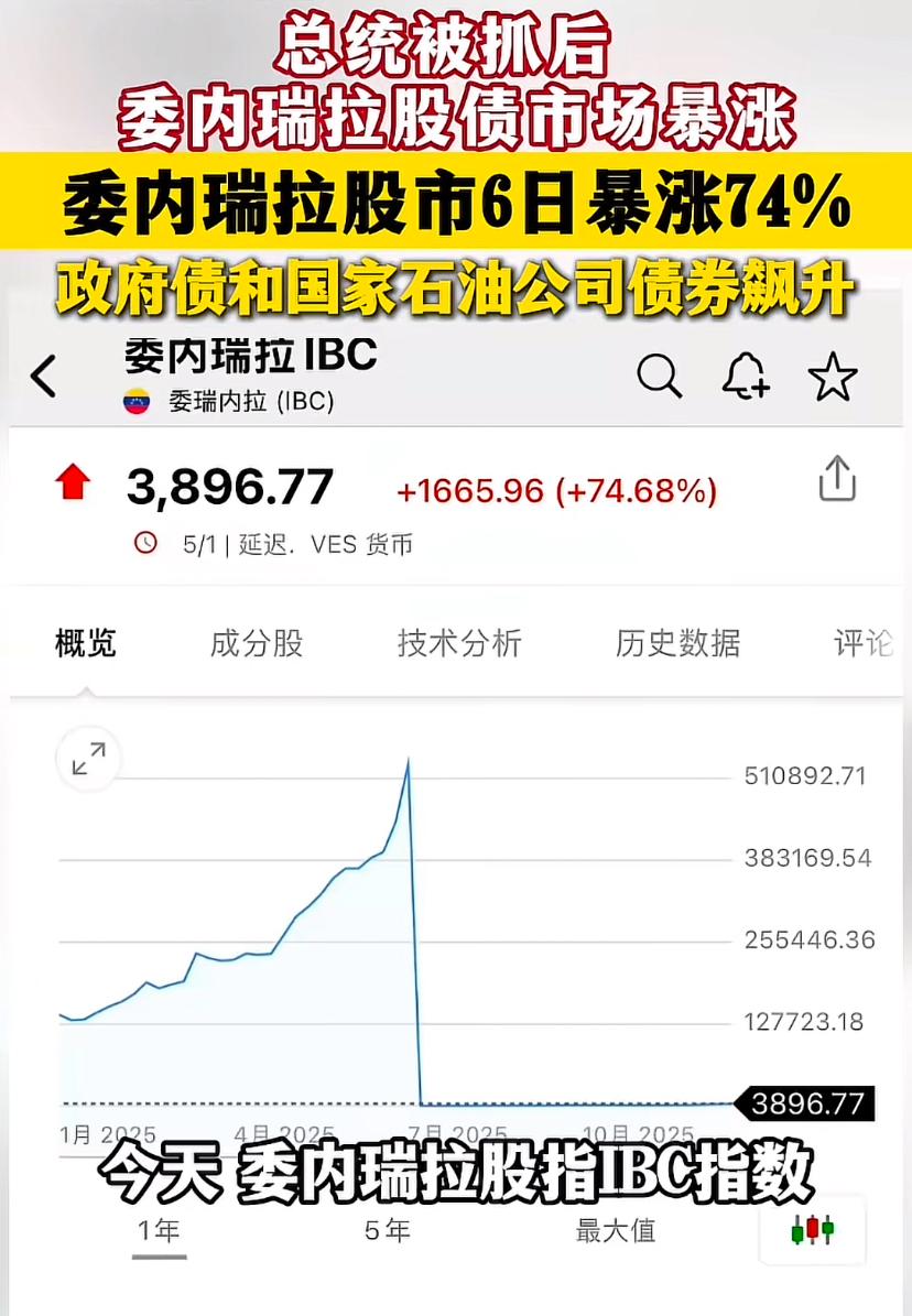 马杜罗被抓后委内瑞拉股指暴涨,几天时间从1600点左右暴涨至约3900点。此外委内瑞拉政府债券、国有石油公司企业债也同时狂飙。 市场不会骗人,资本更是现实,看来资本市场普遍看好后马杜罗时代。虽然美国公然抓捕他国总统的行为是明显的破坏国际法,但委内瑞拉资本市场的反应却看好之后能走上繁荣的道路。