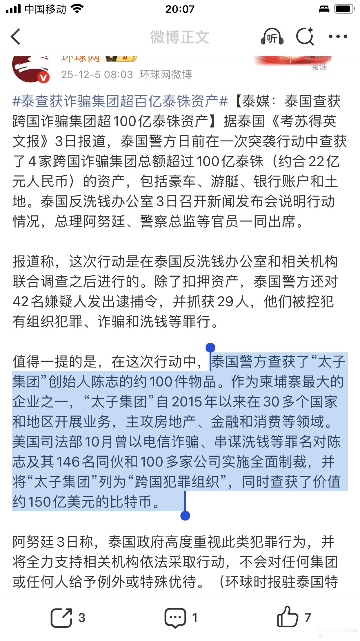 独家:太子集团创始人陈志在柬被捕后遣返中国 太子集团创始人兼董事长陈志在柬埔寨被捕,并已被遣送回中国。 作为柬埔寨最大的企业之一,“太子集团”自2015年以来在30多个国家和地区开展业务,主攻房地产、金融和消费等领域。美国司法部10月曾以电信诈骗、串谋洗钱等罪名对陈志及其146名同伙和100多家公司实施全面制裁,并将“太子集团”列为“跨国犯罪组织”,同时查获了价值约150亿美元的比特币。 凤凰周刊:【150亿美元背后:柬埔寨太子集团全面崩塌始末 曾被贴上“东南亚最大诈骗集团”标签】一场由国际制裁触发的挤兑危机,正席卷柬埔寨华人金融圈。柬埔寨金边诺罗顿大道上,成百上千名华人聚集在“汇旺”钱庄总部门前,等待取钱。汇旺每日9点开门,在柬华人陈新提前20分钟赶到,仅拿到200多号,队伍蜿蜒至隔壁停车场,发号至1000号后便宣告停止。汇旺工作人员特意引导队伍拐弯,避免过长的人龙影响主干道交通。这场全是华人参与的聚集景象,已在金边、西港等地持续一个多月。作为拥有十余年历史、被誉为“柬埔寨支付宝”的金融巨头汇旺支付(Huione Pay Plc.)在柬埔寨华人群体中渗透率极高,不少人都在其平台存有资金。但自今年5月起,汇旺因涉东南亚网络诈骗、洗钱等遭国际制裁,一场挤兑潮就此掀起。直至2025年12月3日,柬埔寨国家银行声明称,汇旺的营业执照已于2024年因违反金融法规被吊销执照且完成清算,不再是合法商业个体,靴子终于落地。如今,汇旺总部已人去楼空,有华人手握大量汇旺余额却不知如何处置,亦有灰产从业者直言,“汇旺已渗透进柬埔寨经济血脉,打掉它就是动摇灰产地基”。汇旺危机的背后,是其关联方——柬埔寨商业巨头“太子集团”的全面崩塌。在柬埔寨,华人的衣食住行几乎离不开太子集团。自2025年10月以来,太子集团及其创始人陈志的相关消息便持续发酵。这位出生于福建的“80后”,因“被美国冻结150亿美金”的消息迅速占据全球媒体头条,其一手打造的太子集团也被贴上“东南亚最大诈骗集团”的标签。通过采访多名太子集团高管、内部人士及在柬华商,正逐步揭开这个神秘商业帝国的层层面纱。冷杉record ↓↓↓红星新闻去年12月报道:柬电诈头目新加坡资产被冻结【柬埔寨电诈集团头目陈志1.5亿新元资产在新加坡遭冻结】柬电诈头目1.5亿新元资产被冻结 新加坡警方10月30日查封并扣押了柬埔寨商人陈志及其“太子集团”在新加坡的6处房产,同时对其他相关金融资产发出禁止处置令,涉及银行账户、证券账户及现金,总价值超过1.5亿新元(约合8.2亿人民币)。此外,一艘游艇、11辆豪车以及多瓶名酒亦被纳入禁令范围。陈志运营的太子集团自称为一家跨国商业集团,在柬埔寨布局度假村与酒店等项目,是柬埔寨最大的企业集团之一。但该集团实际上使用虚假的招聘广告诱骗工人,然后以酷刑强迫他们进行电信诈骗。工人则诱骗受害者们转移加密货币,以获得巨额的投资回报。 柬电诈头目持有双重国籍10月14日,美英两国对146名与太子集团有关联的“目标”实施了制裁,并将太子集团定为“跨国犯罪组织”。美国当局指控其涉嫌电信诈骗与洗钱,称陈志操控大规模线上“诈骗工厂”,并强迫贩卖来的劳工欺诈全球受害者。陈志的罪名涉及诈骗、洗钱,以及指挥园区强迫工人诈骗。根据起诉书显示,该集团在柬埔寨至少建造了10个诈骗园区。据悉,今年38岁的陈志持有柬埔寨和英国双重国籍,是诈骗集团“太子集团”的创始人。2024年,新加坡警方接获有关陈志及其同伙的情报后即展开调查。经与美、英等国共享抓捕线索,联合反洗钱行动后,警方于10月30日对相关人员采取执法行动。目前,调查还在进行中,陈志本人仍下落不明。根据新加坡法律,陈志若落网且罪名成立,最高可被判处10年监禁、罚款50万新元,或两者并罚。 太子集团创始人陈志被捕并遣送中国