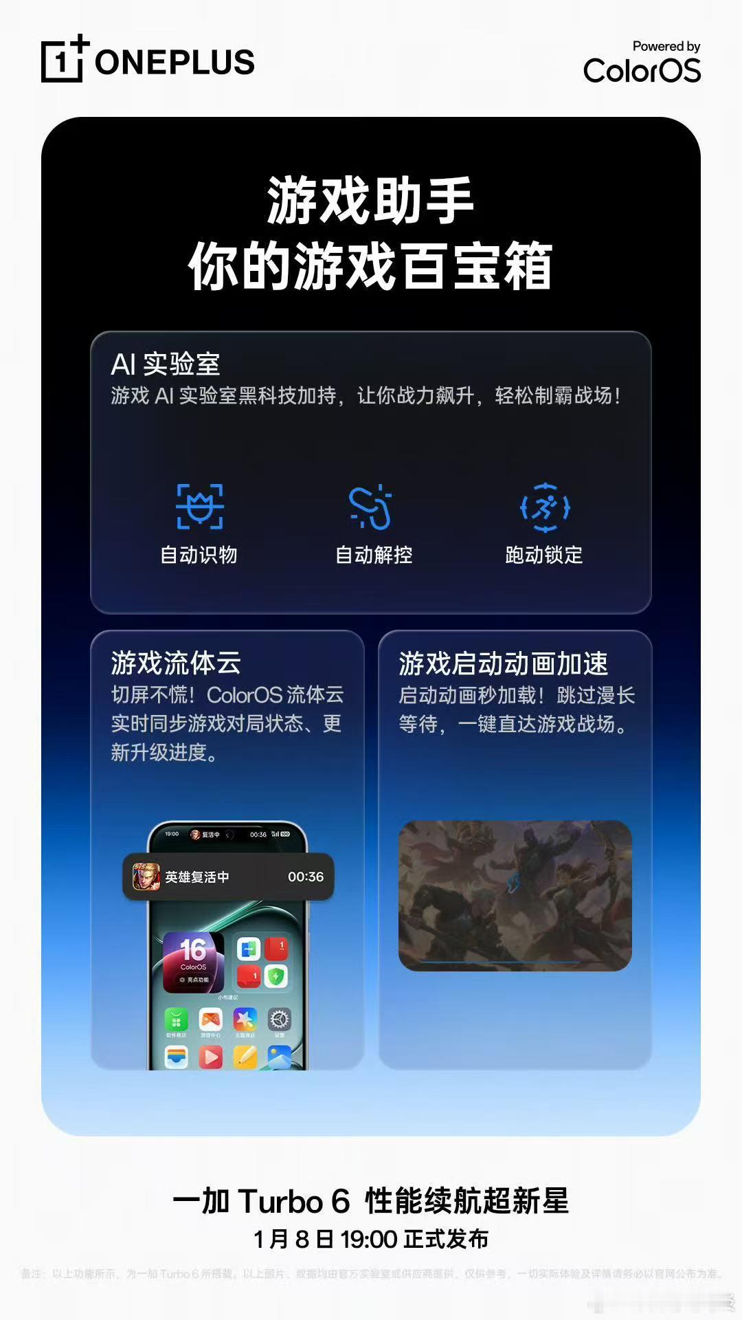 一加Turbo6 系列出厂搭载ColorOS16,AI加持轻松搞定一切!📱搭载「机圈德芙」ColorOS16:通过OPPO实验室6年72个月老化流畅度测试,常用常新🤖AI 功能加持:游戏助手、AI一键闪记、全新AI人像补光、AI消除......轻松搞定一切🔗支持跨生态互联:碰一碰快速分享,同步手表运动记录、接打电话,与电脑互联实现投屏镜像,可跨设备接收 iPhone 来电话等通知性能强得超标,续航久到离谱!一加Turbo6 系列1月8日19:00 正式发布,敬请期待!