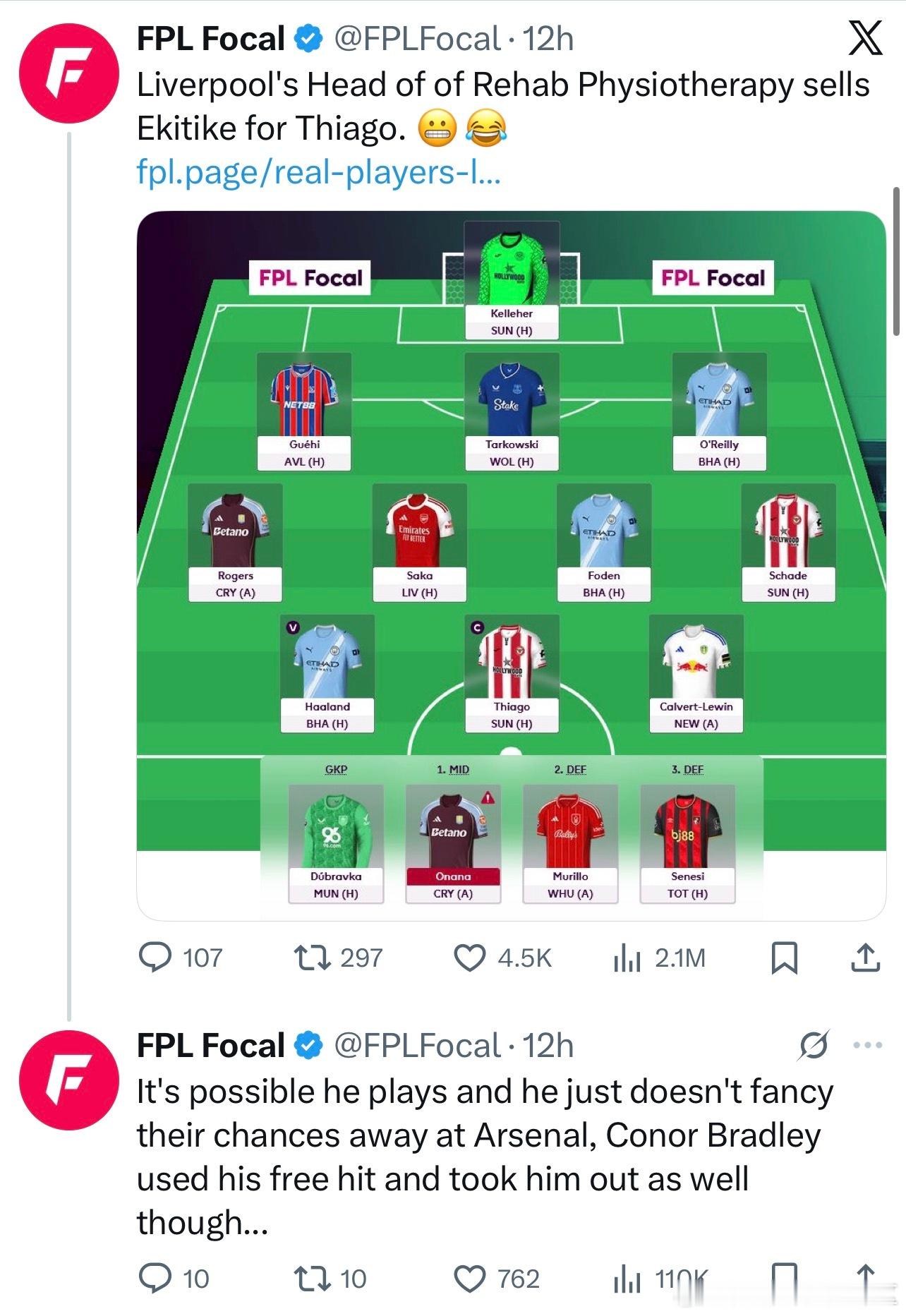 斯洛特现在也不确定埃基蒂克能否参加今天的训练,如果没参加的话应该也就赶不上对阵阿森纳的比赛了。昨天我军的康复主管和布拉德利在FPL里面已经都把埃基蒂克换下去了…..如果埃基蒂克不踢,只能说对阵阿森纳斯洛特很危险了