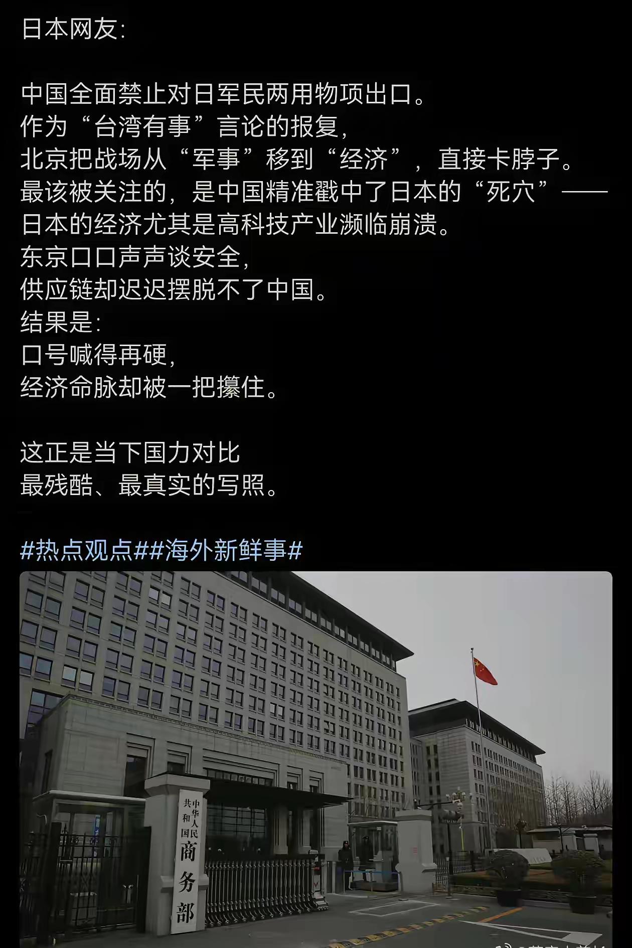 利好国产芯片半导体板块,涉嫌倾销!中国将对日本芯片材料立案调查!对整个日本芯片半导体行业发展将是一次重大的打击!这一次,日本的芯片半导体行业可能会受到重创!这完全推动我国自主芯片半导体的发展!日本在半导体行业的出口以及材料进口方面也高度依赖中国市场!现在我们这方面已经限制了出口给日本,日本的芯片半导体行业将会受到严重的影响!这一次,日本被中国给卡住脖子,甚至卡住了咽喉!日本工业科技其实高度依赖中国原材料!
