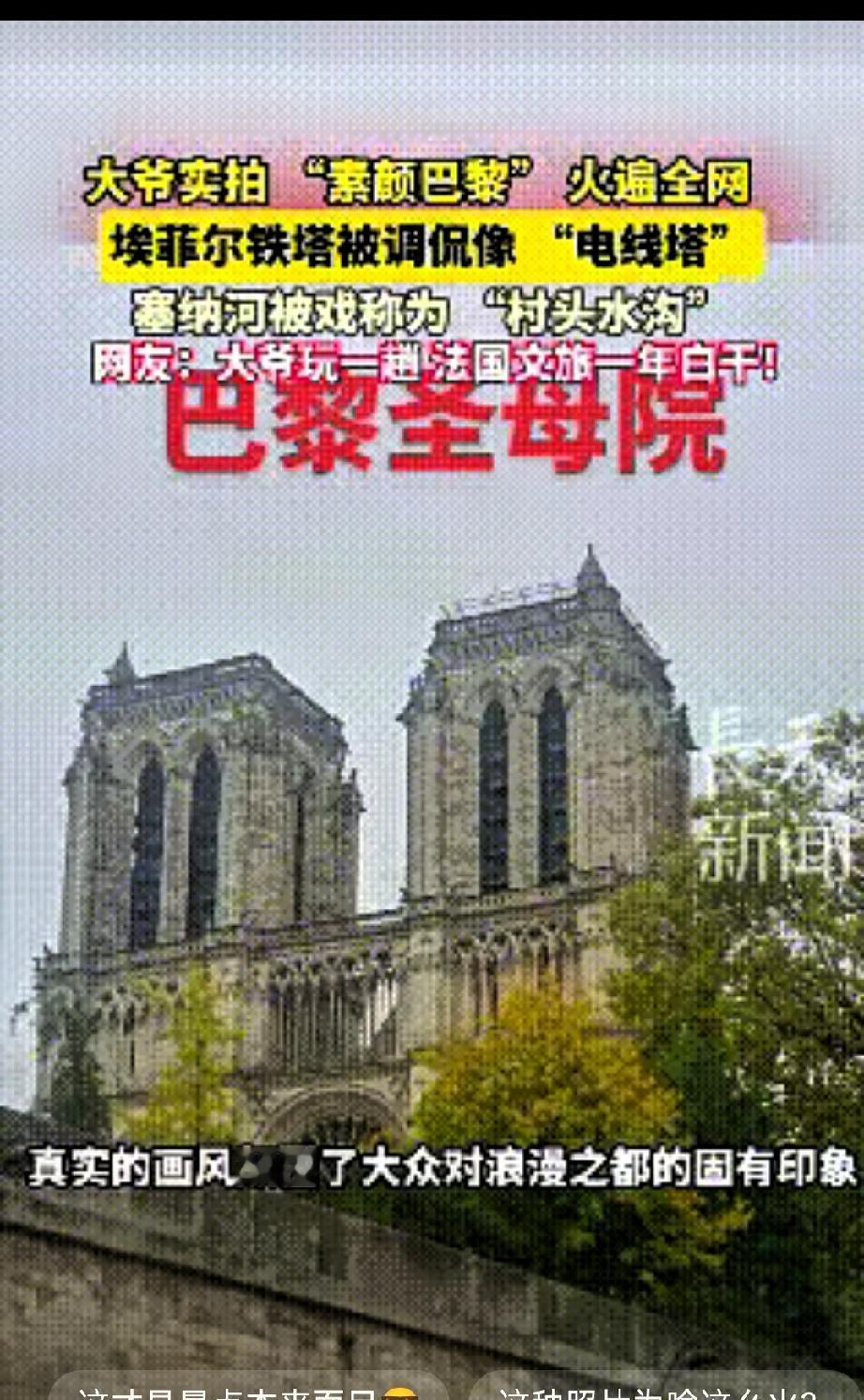 解释不清了!”中国大爷去巴黎玩,用手机随手拍了几张无美颜无滤镜的景点照片,结果直接火遍全网! 在大爷的镜头里,埃菲尔铁塔少了网红照片里的浪漫光环,塔身的锈迹清晰可见,看起来少了些精致感;被视作浪漫代名词的塞纳河,也没有了滤镜加持下的波光粼粼,河水略显浑浊,岸边还能看到零星杂物,就是一条普通城市河流的模样。 网友们纷纷在评论区留言调侃,说大爷这波直出照片,简直是戳破了“网红景点”的包装。还有人拿出精修大片和大爷的照片对比,感慨现实和宣传的差距。陪同大爷的亲友也直言,大爷拍照就是随手记录,根本没考虑过构图和调色,没想到会这么受关注。 其实大爷的照片之所以能火,本质是戳中了很多人被“照骗”坑过的共鸣。现在社交平台上的旅行打卡照,大多经过精心修图调色,把景点包装得完美无瑕,可游客实地打卡时,往往会发现现实和照片大相径庭,心里难免失落。 大爷的照片没有刻意美化,只是还原了景点最真实的样子,反而让大家看到了一座更接地气的巴黎。旅行的意义本就该是感受真实的风景和人文,而非复刻别人镜头里的完美画面。那些带着些许瑕疵的真实场景,才藏着一座城市最鲜活的烟火气。