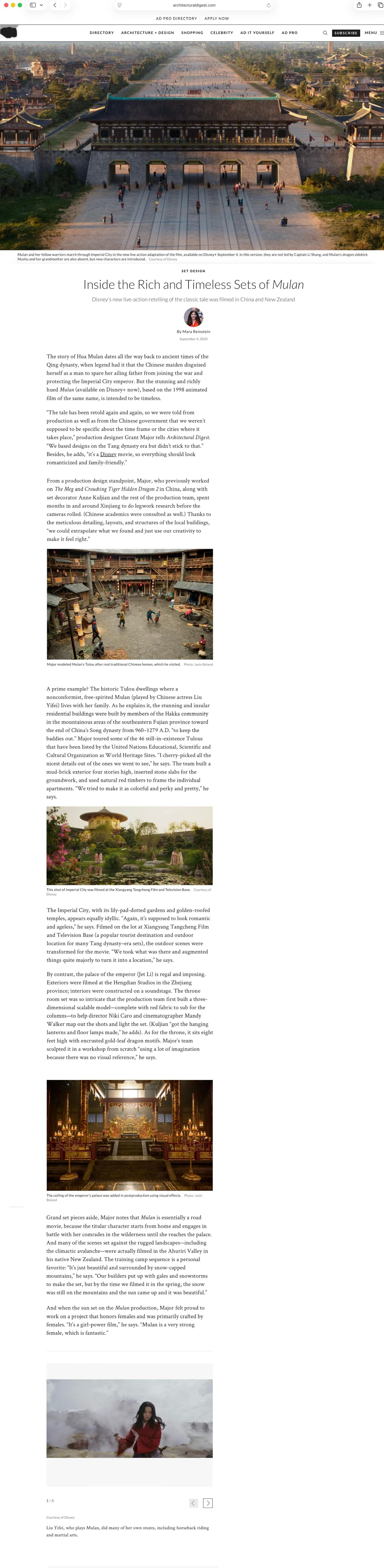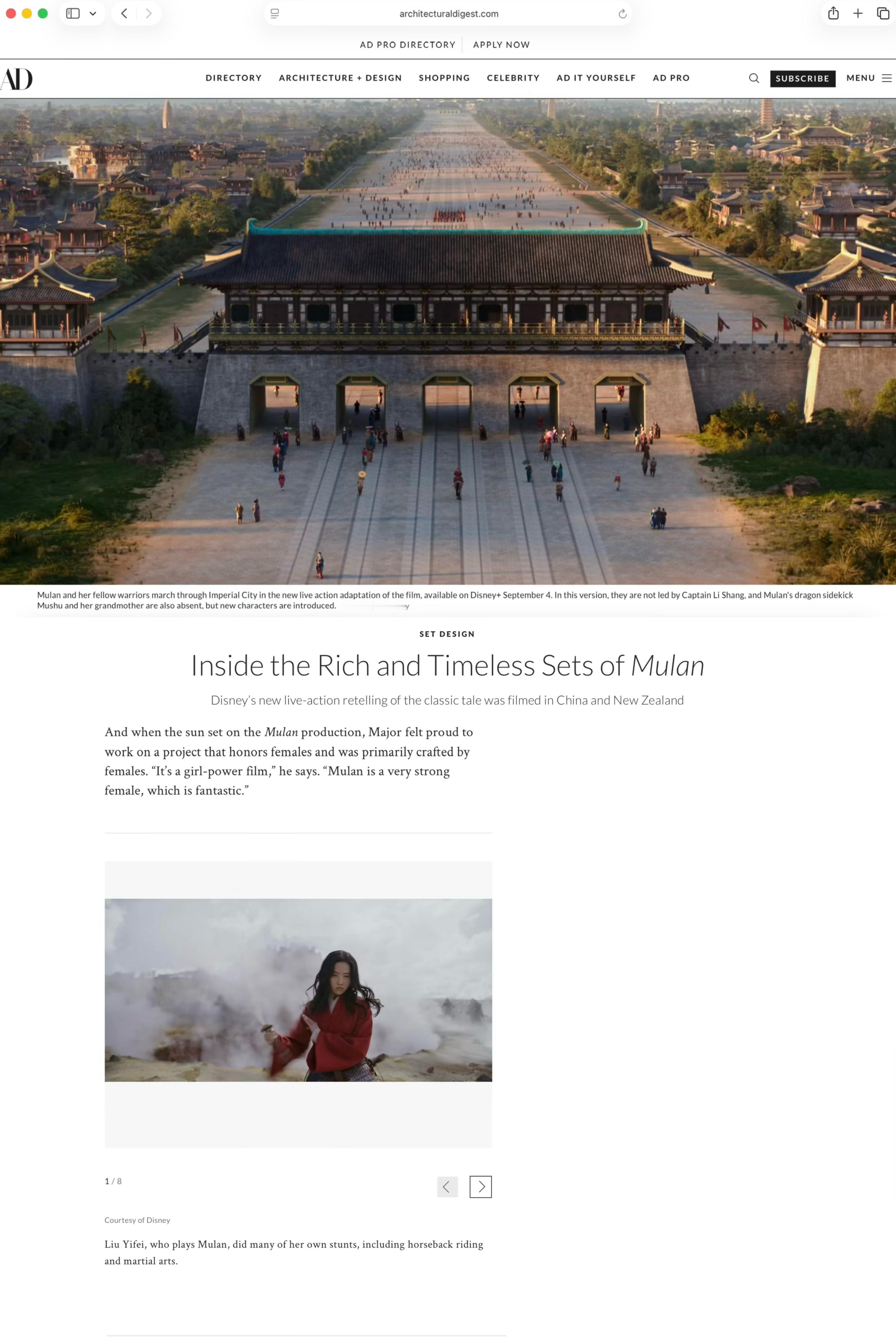 刘亦菲 lyf 花木兰 AD(Architectural Digest)是全球最具权威性的建筑与室内设计媒体/杂志,长期定义高端居住美学与当代设计标准,AD发布过对刘亦菲《花木兰》美术和置景的报道“Inside the Rich and Timeless Sets of Mulan”,文章聚焦迪士尼真人版《花木兰》在美术与场景设计上的成就,赞扬其层次丰沛、具有永恒气质的视觉呈现。影片取景于中国与新西兰,以唐代为设计灵感但没有聚焦具体年代,通过实地考察、学术咨询与艺术再创作,构建出一个不受时间限制的东方世界。无论是土楼、皇城还是宫殿空间,均在真实历史原型之上被重新演绎,形成兼具文化厚度与电影想象力的空间叙事。同时,影片对人物真实力量感的塑造同样重要-饰演花木兰的刘亦菲亲自完成了大量动作戏,包括骑马与武术表演,进一步强化了角色的坚韧气质与女性力量主题。刘亦菲80后唯一刀马旦