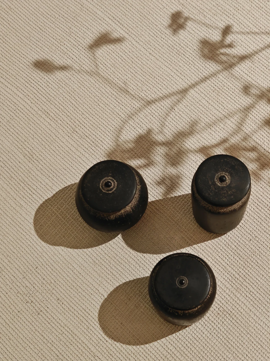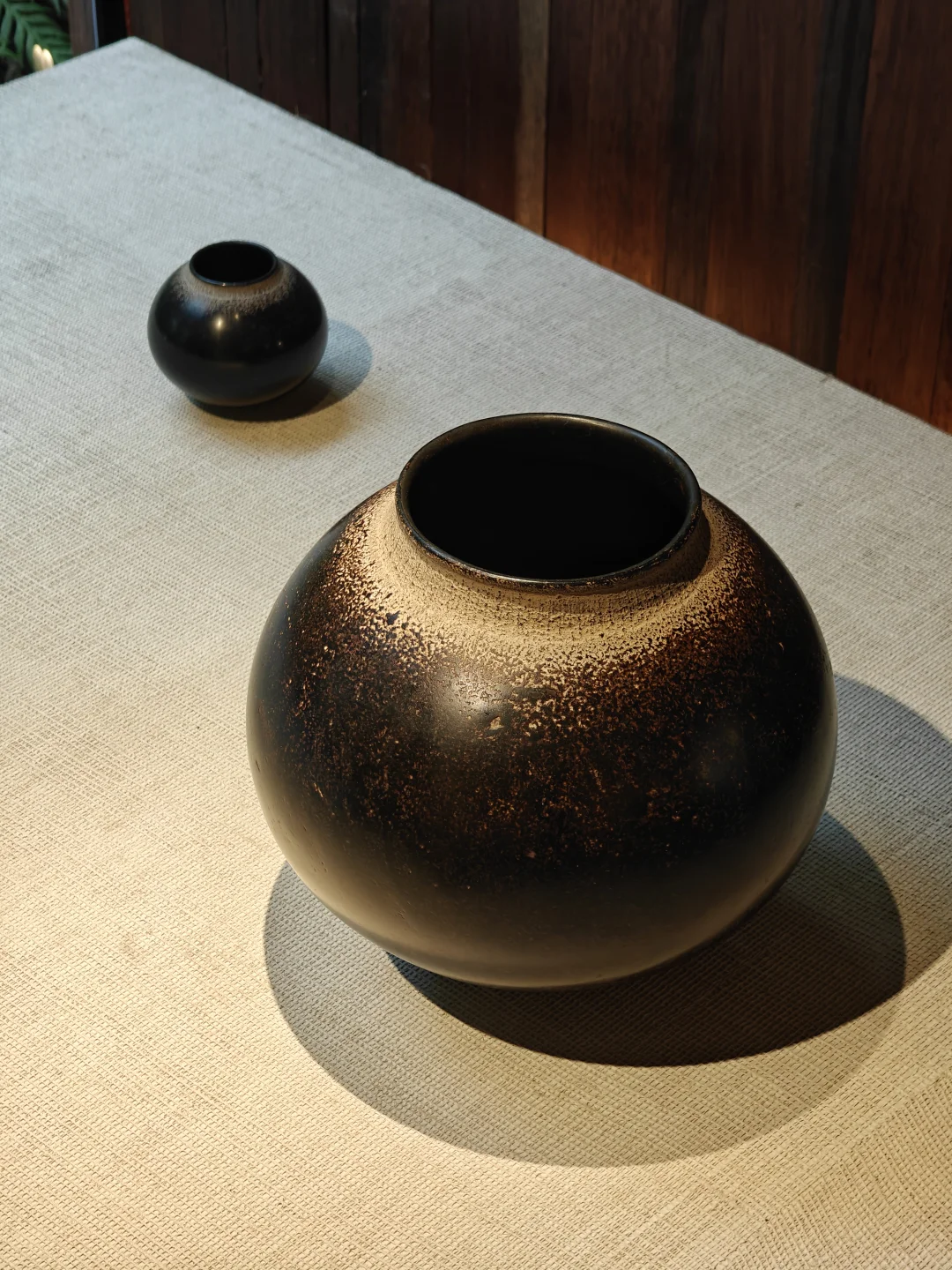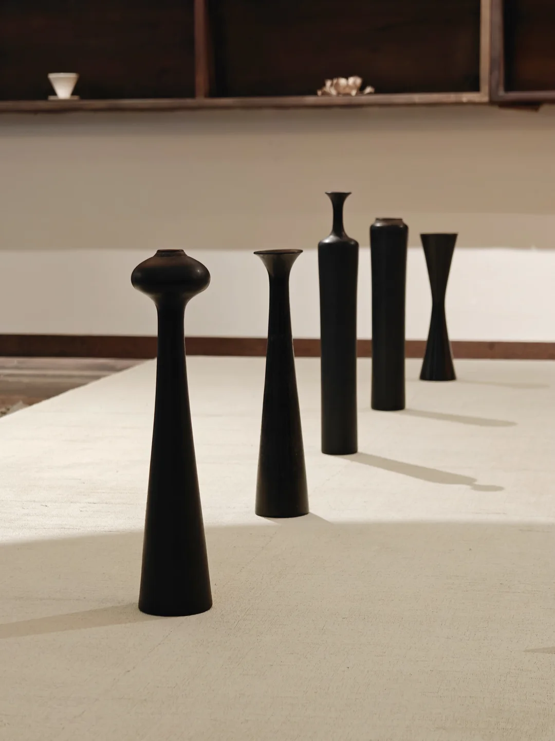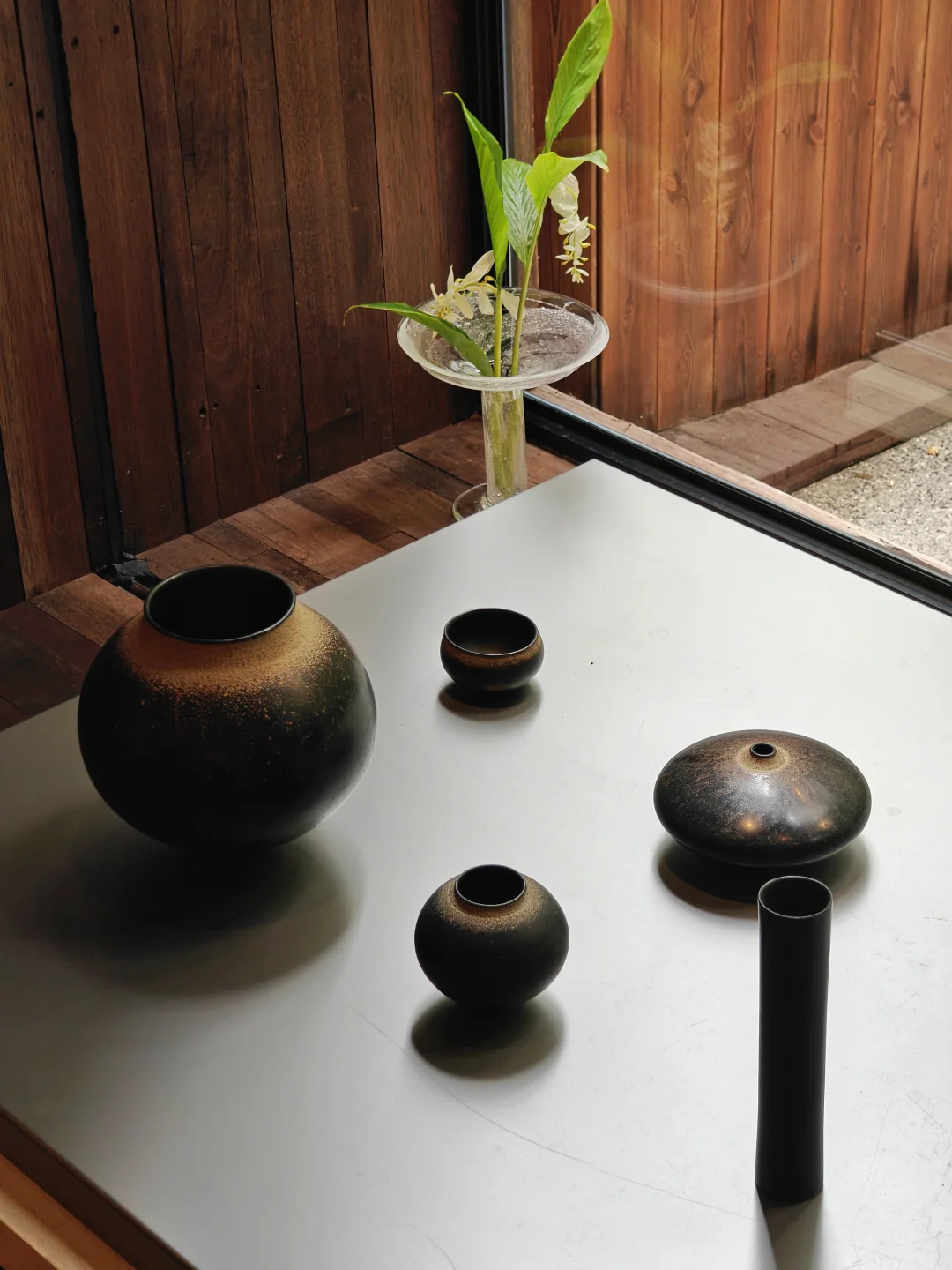 他以独特的陶胚漆器闻名,对他而言混入漆只是为了理想的质感,它是瓷土里的糊剂,而非“漆衣”。他的作品以黑色为基调,融合瓷器的轻薄清透与漆器的厚重深沉。他对陶胚强度严格检测,经8-10次上漆、研磨,再经烧制与做旧打磨,每件作品耗时约一月。运用沥青、煤焦油等素材,还原古器质感,纯黑漆色与做旧痕迹交织,尽显岁月韵味。造型简洁却藏细腻表达,呼应“侘寂”美学。