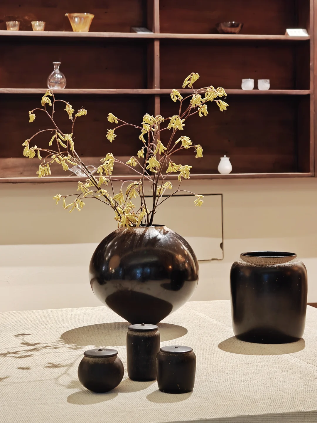 👉有阵子没来上生新所,来必然是要逛逛山也郝。器物展示自然是换过了,目前C位的是日本陶艺家陶艺家安齐贤太的一整套黑陶作品。听店员介绍这一组是不拆卖的,要收就是一整套收,还真是很有自己坚持的艺术家。其余艺术家的器物散落在空间各处,依旧是审美在线,简约不简单,值得细细品味。