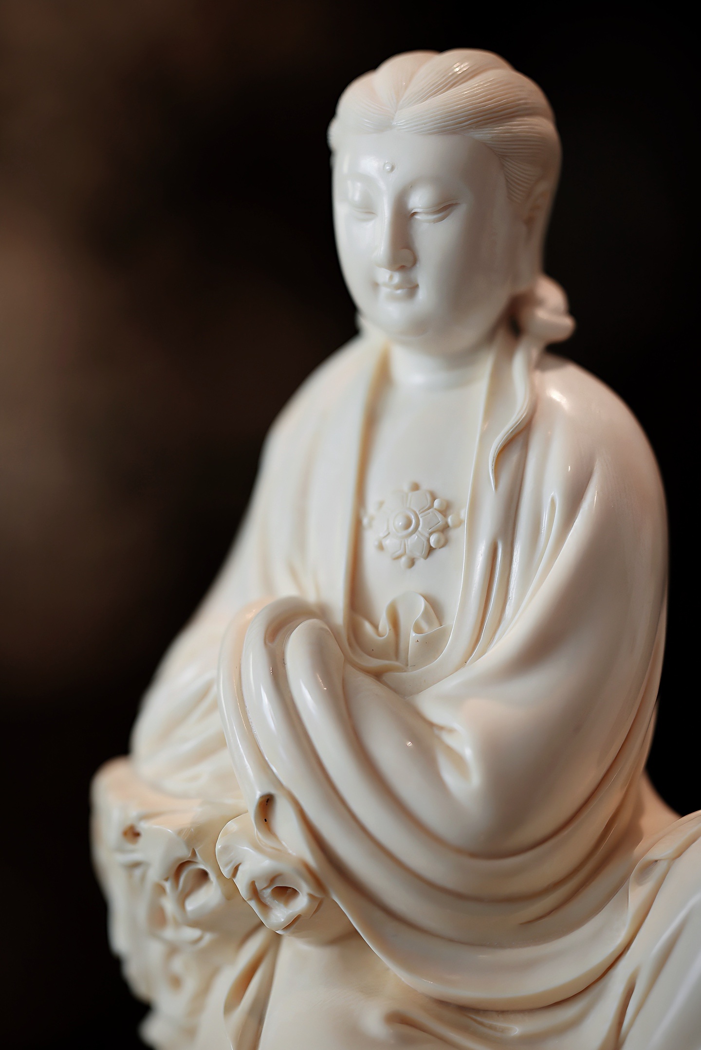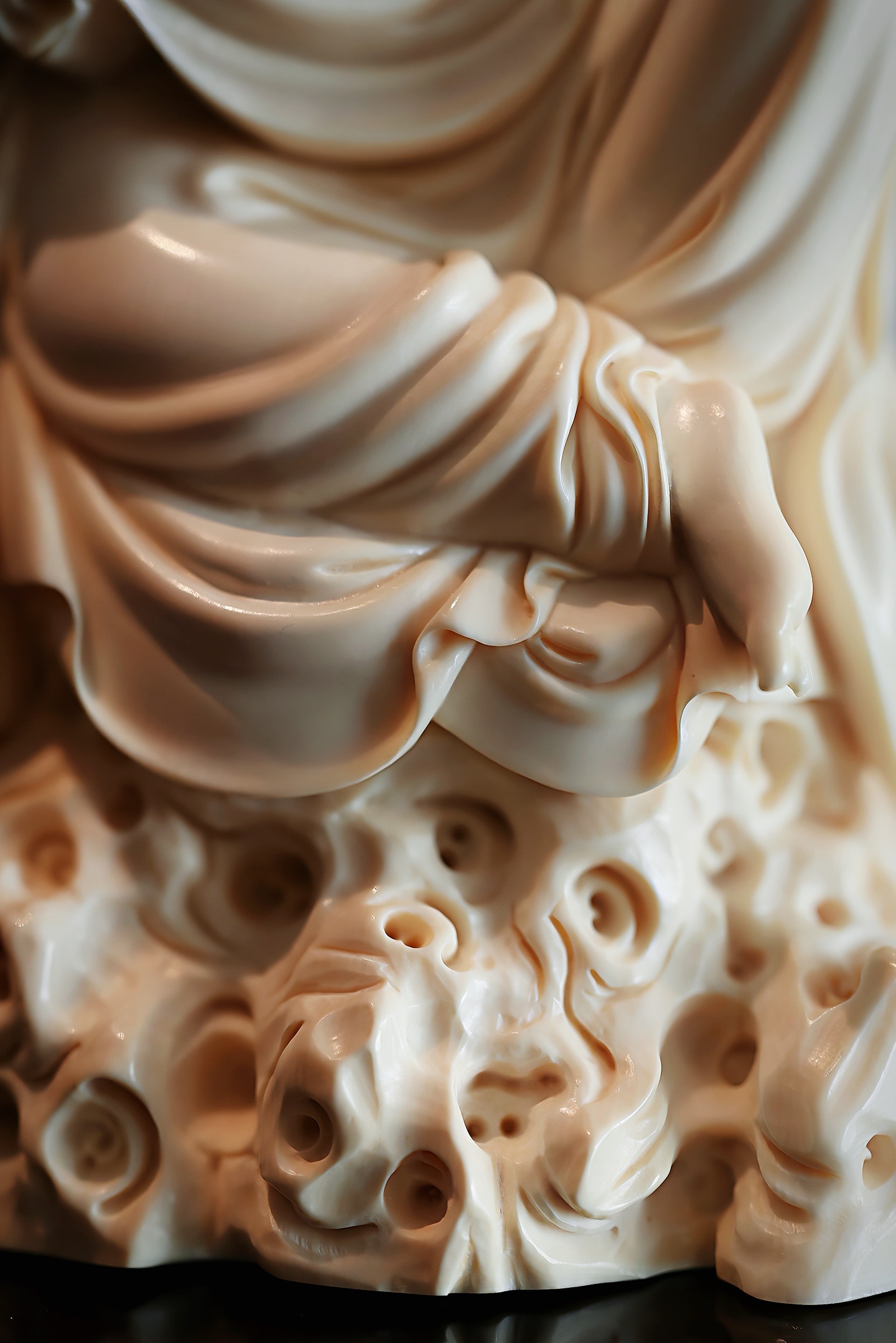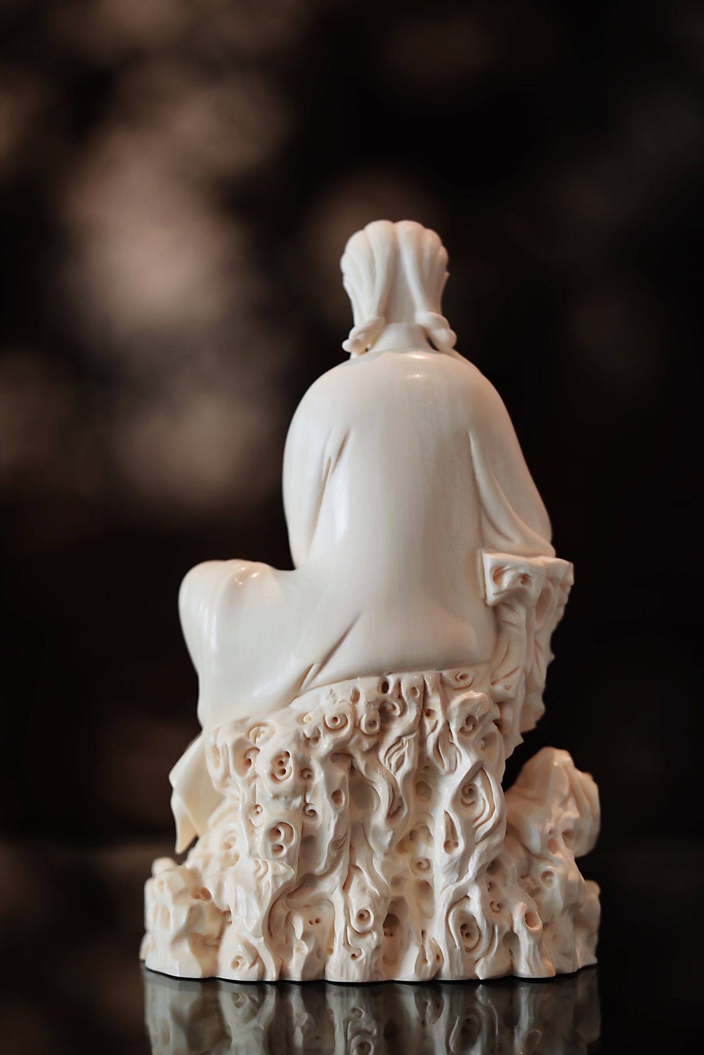 自在观心·万古凝祯取万年冰封猛犸牙,循明代瓷圣何朝宗范式,琢自在观音法相。衣袂流水承古韵,眉目慈悲透玉光。刀锋所至,既存“何朝宗印”之清雅风骨,更凝冻土时空之灵韵。此非凡工,乃是一场与不朽材质的对话,让千年慈悲,驻于永恒冰魄。规格:18.5cm*11.3cm*8.2cm,858g