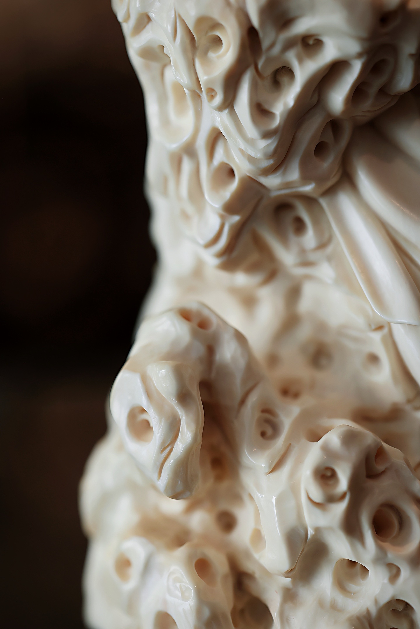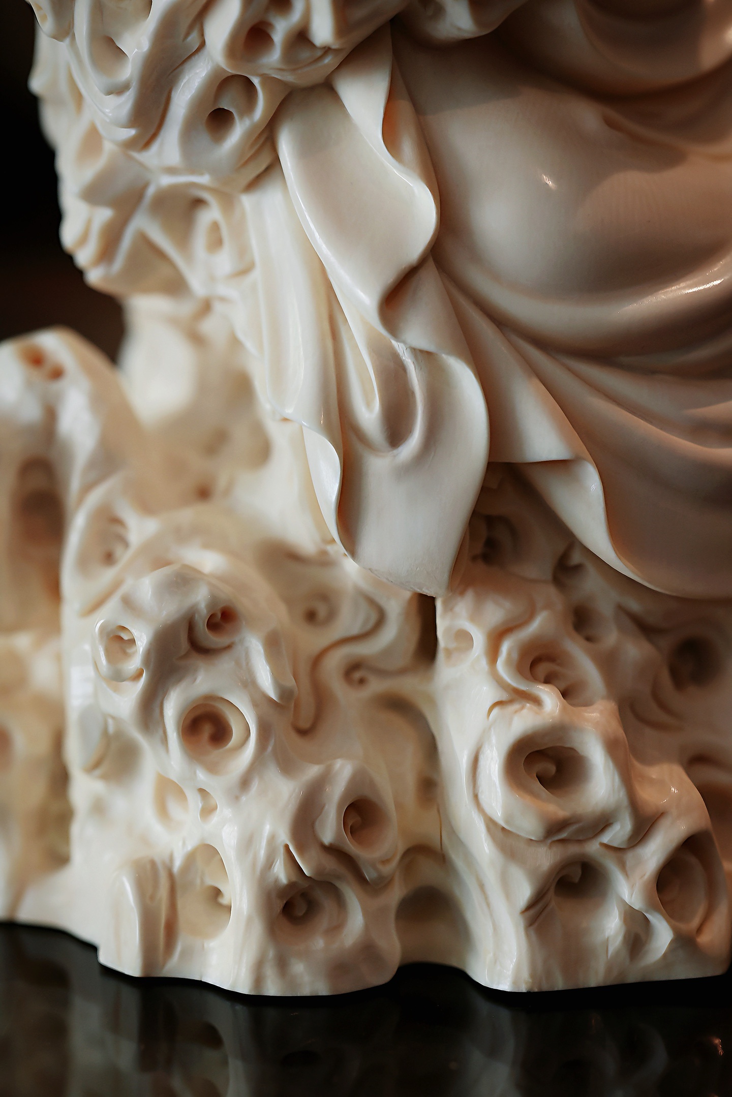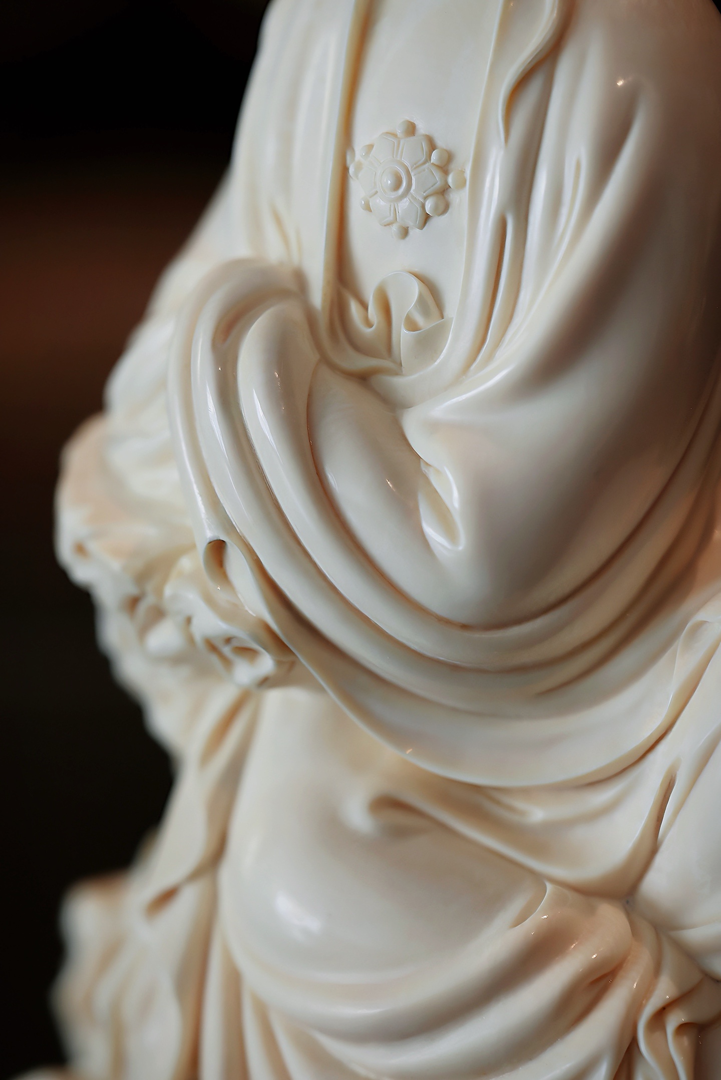 自在观心·万古凝祯取万年冰封猛犸牙,循明代瓷圣何朝宗范式,琢自在观音法相。衣袂流水承古韵,眉目慈悲透玉光。刀锋所至,既存“何朝宗印”之清雅风骨,更凝冻土时空之灵韵。此非凡工,乃是一场与不朽材质的对话,让千年慈悲,驻于永恒冰魄。规格:18.5cm*11.3cm*8.2cm,858g