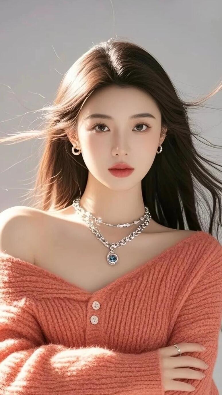 温柔甜美的少女,粉色毛衣搭配精致项链,优雅动人。